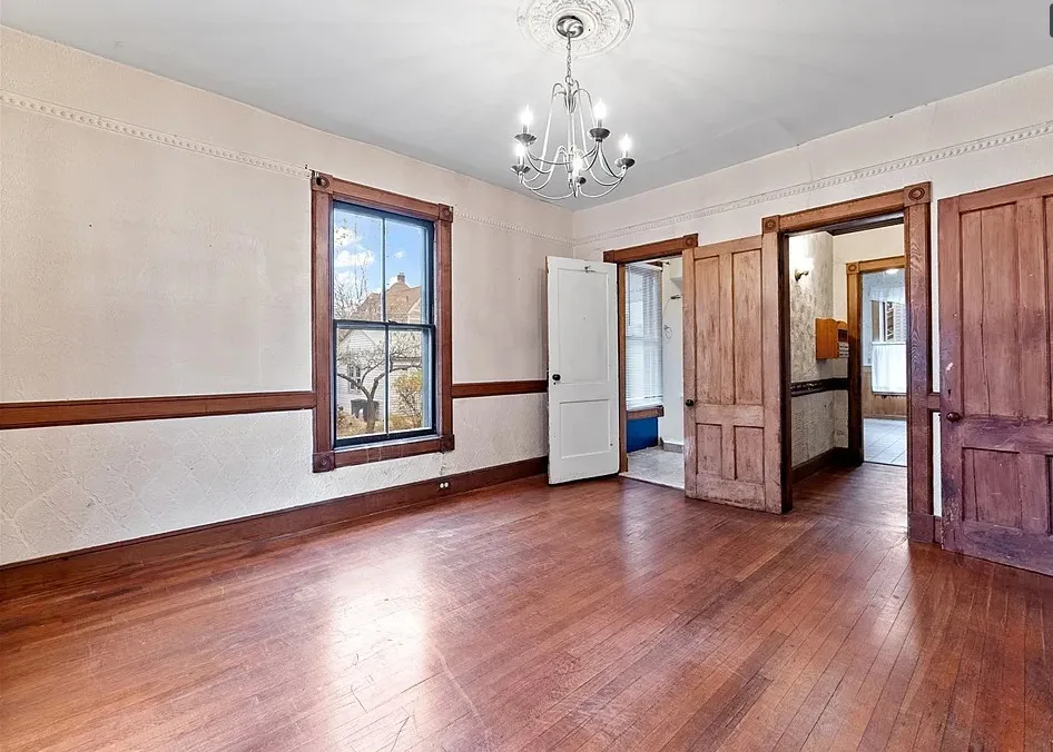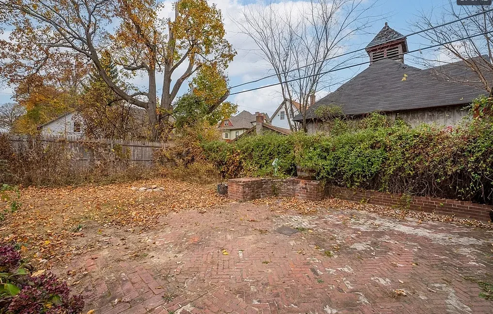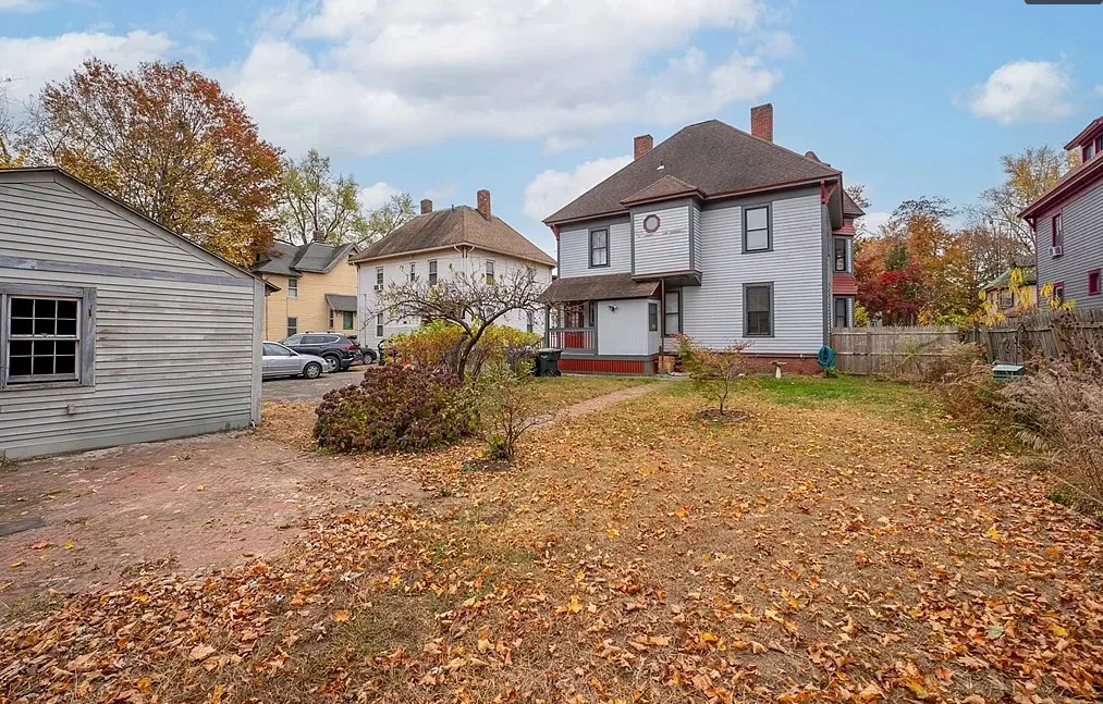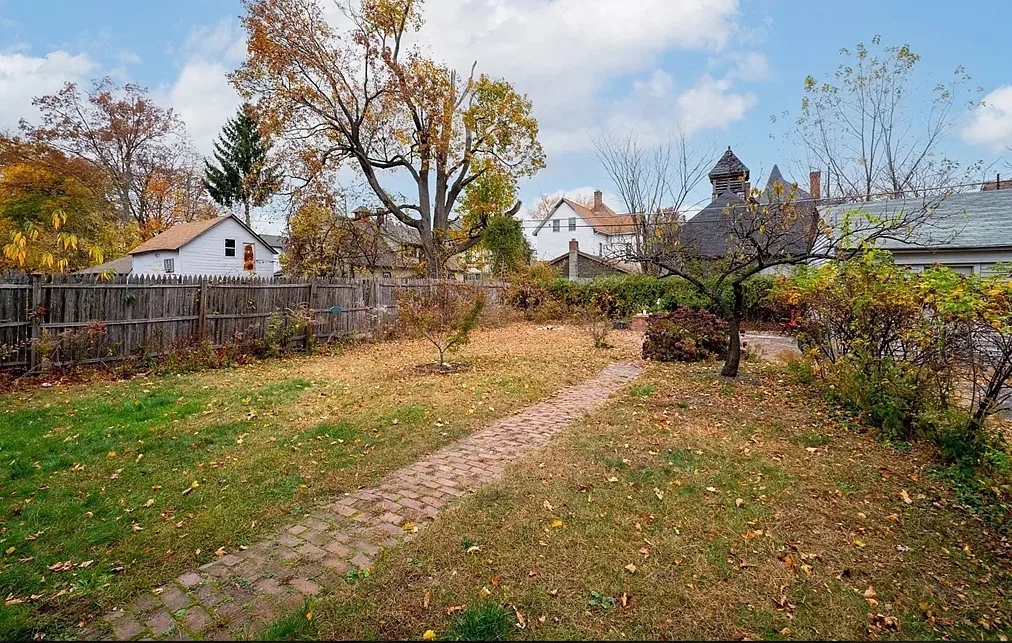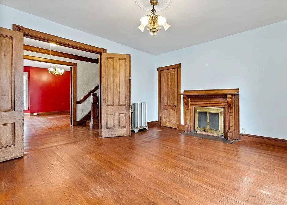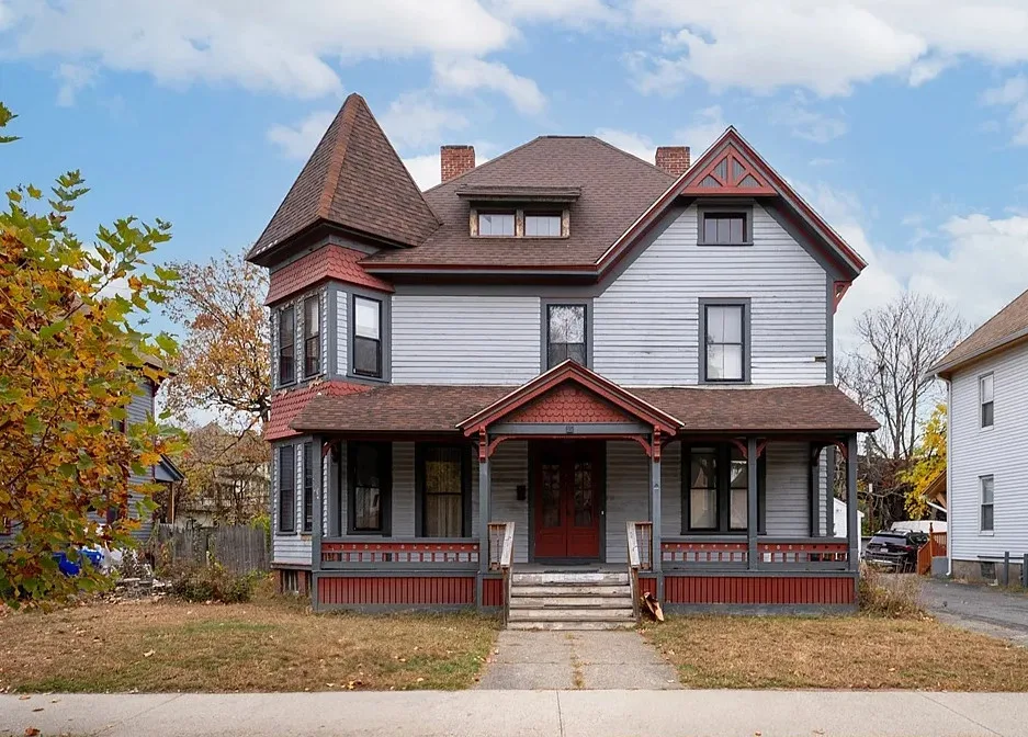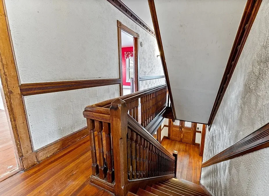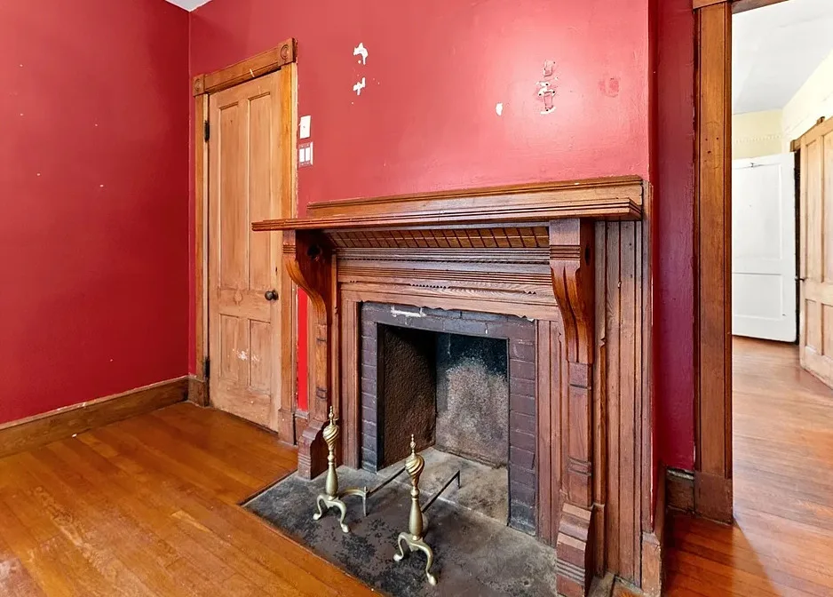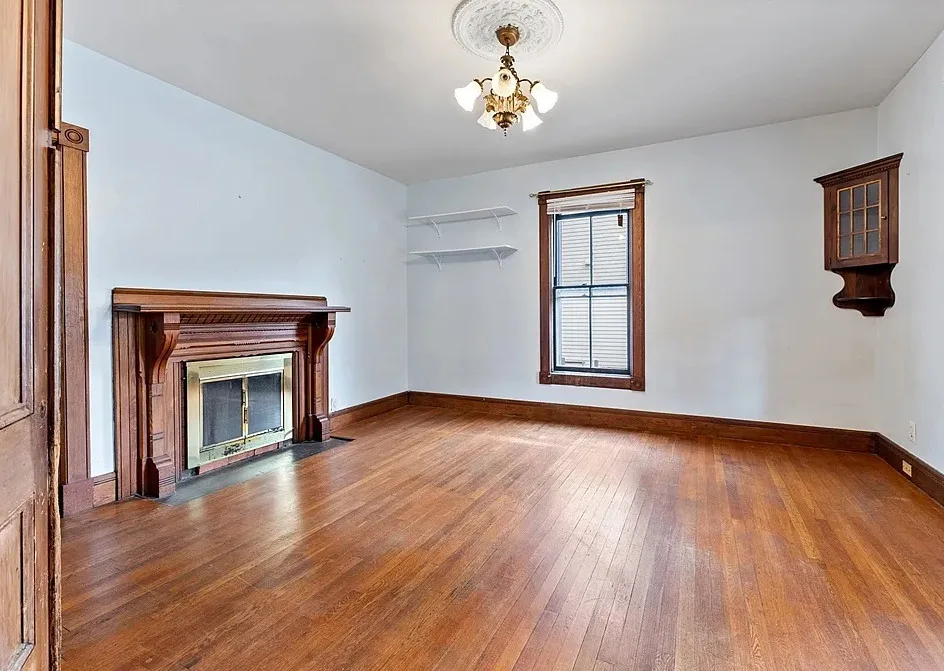 Pretty woodwork inside! I love that back brick patio! The house was built in 1883. It is located in Springfield, Massachusetts. The house features a covered front porch, wood floors, nice staircase, wide baseboards, chair rails and original mantels. The home has a large basement, fenced in backyard, large brick patio and a garage. Six bedrooms, two bathrooms and 2,461 square feet. $240,000
