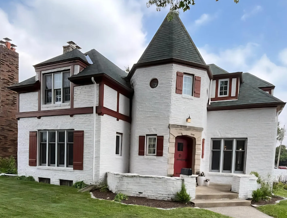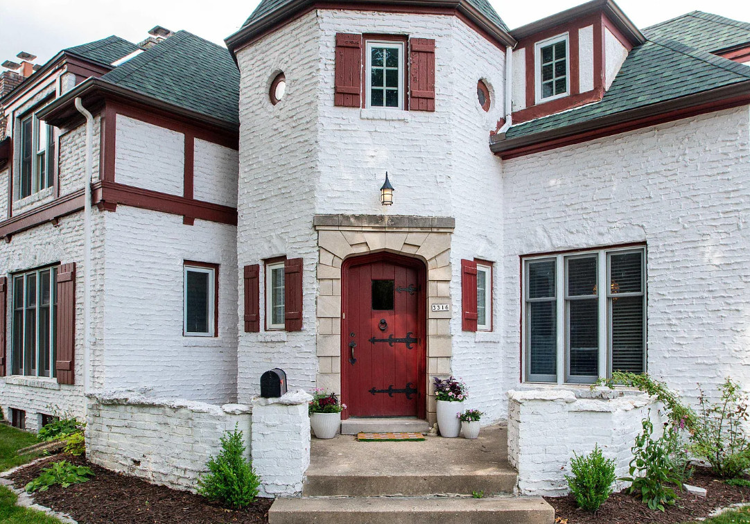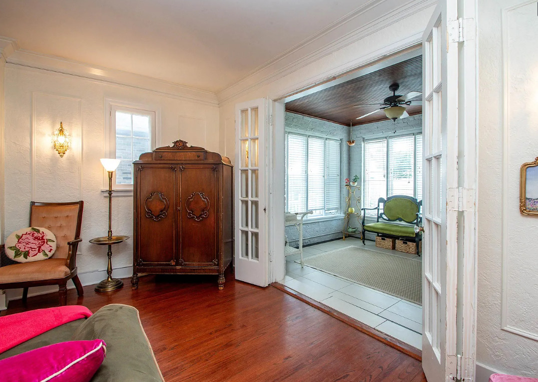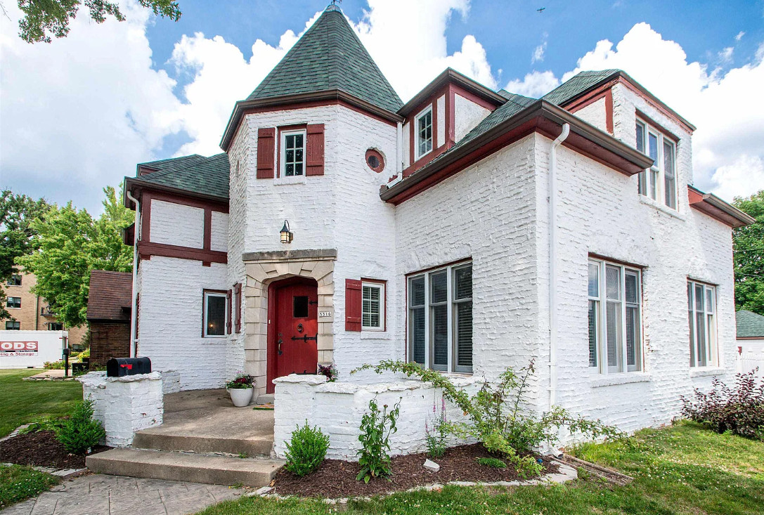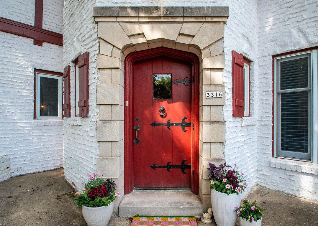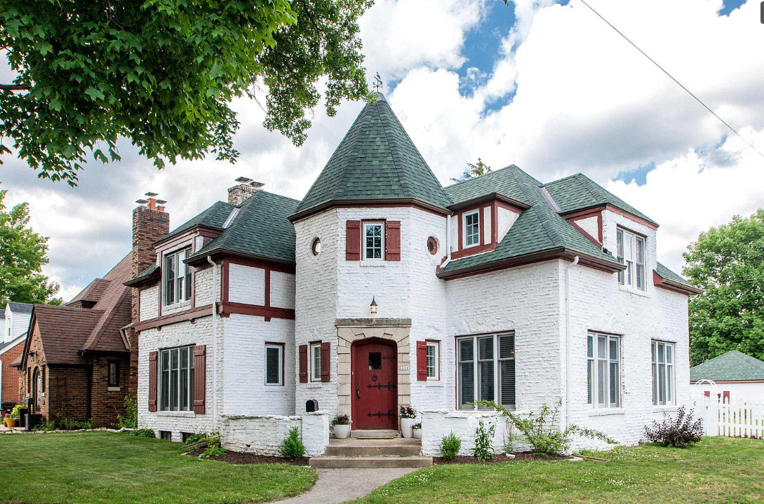 Has a bomb shelter! This castle inspired house has a pretty interior! There are nice details! The house was built in 1935. It is located in Peoria, Illinois. The house features wood floors, wainscoting, crown moulding, built-ins, pretty wall sconces, french doors and a sunroom. There is a large finished basement. Four bedrooms, two bathrooms and 2,472 square feet. $279,900