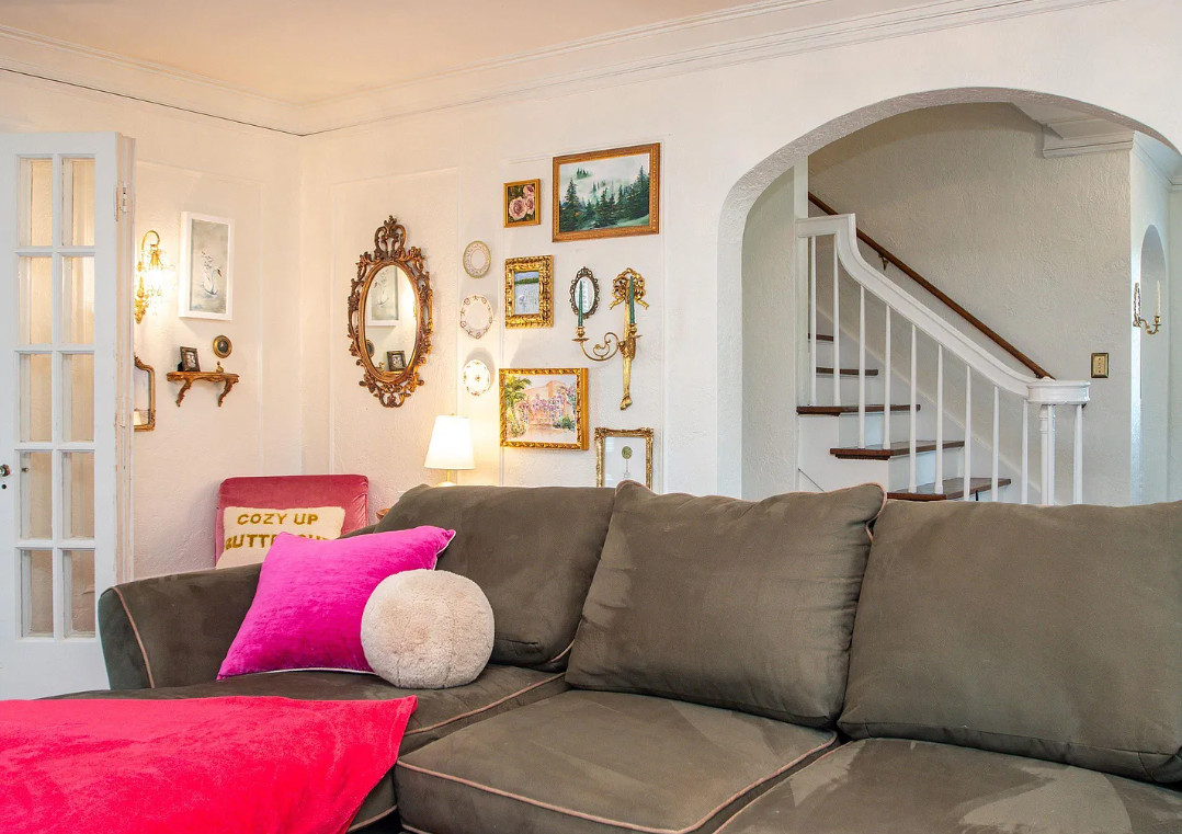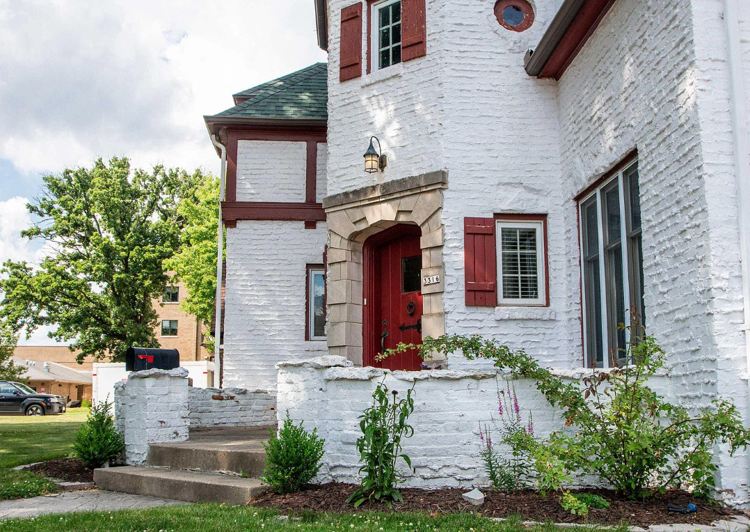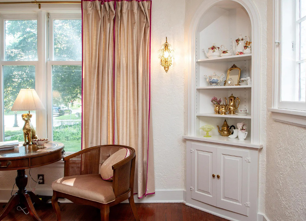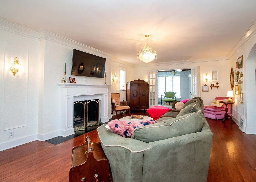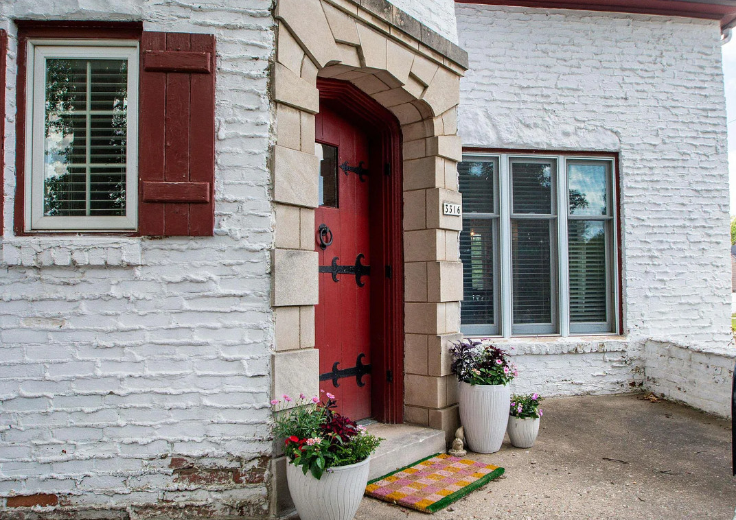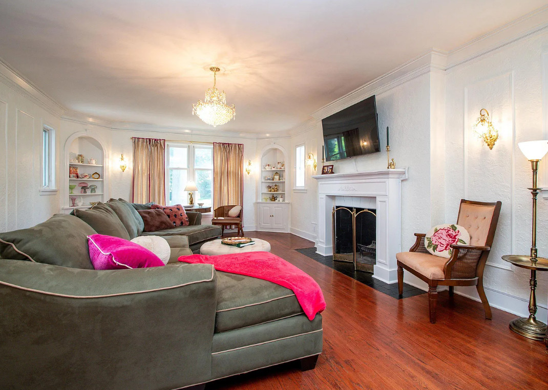 Has a bomb shelter! This castle inspired house has a pretty interior! There are nice details! The house was built in 1935. It is located in Peoria, Illinois. The house features wood floors, wainscoting, crown moulding, built-ins, pretty wall sconces, french doors and a sunroom. There is a large finished basement. Four bedrooms, two bathrooms and 2,472 square feet. $279,900