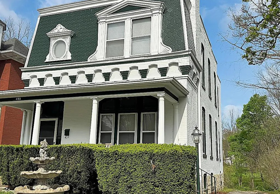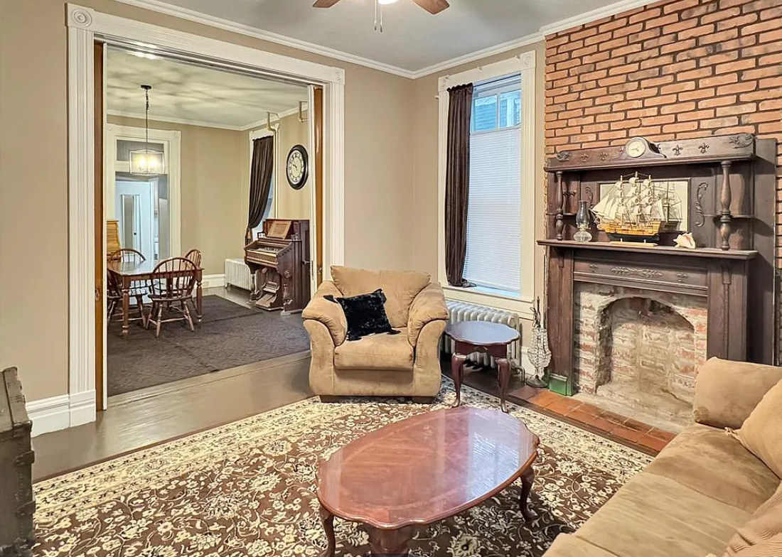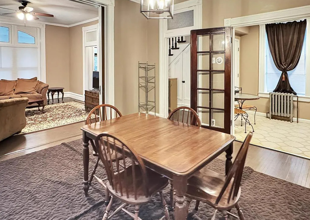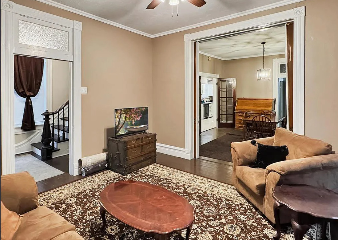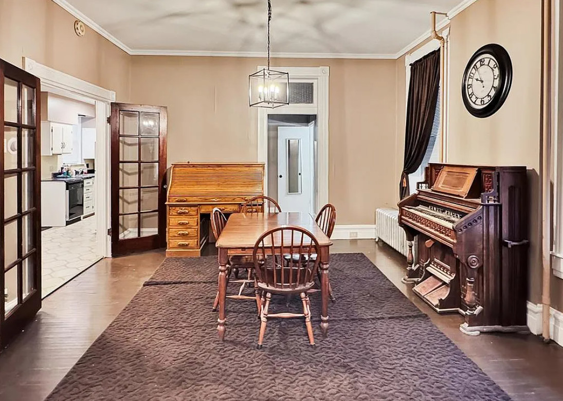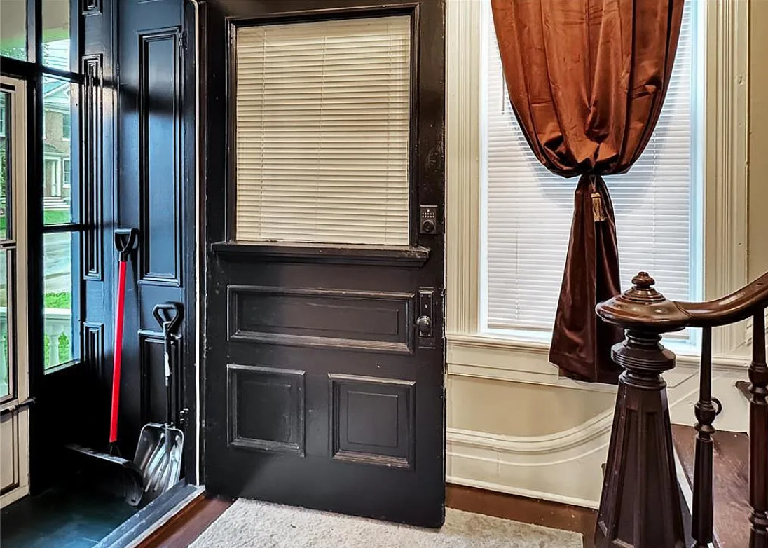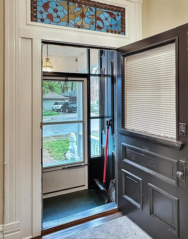 I love this style of staircase that is in this house! There are nice details inside and outside. The house was built in 1885. It is located on .33 acre in Washington, Missouri. The house features a covered front porch, nice staircase, wood floors, baseboards, transom windows, crown moulding and a vestibule. Four bedrooms, two bathrooms and 2,226 square feet. $279,000