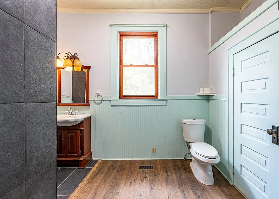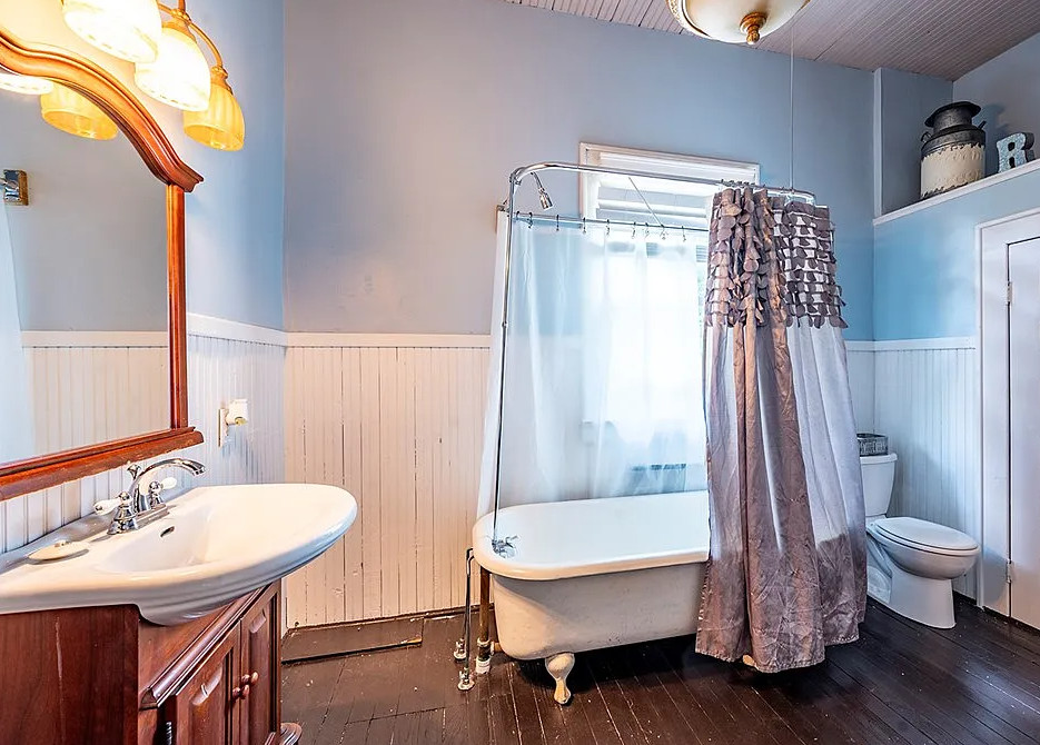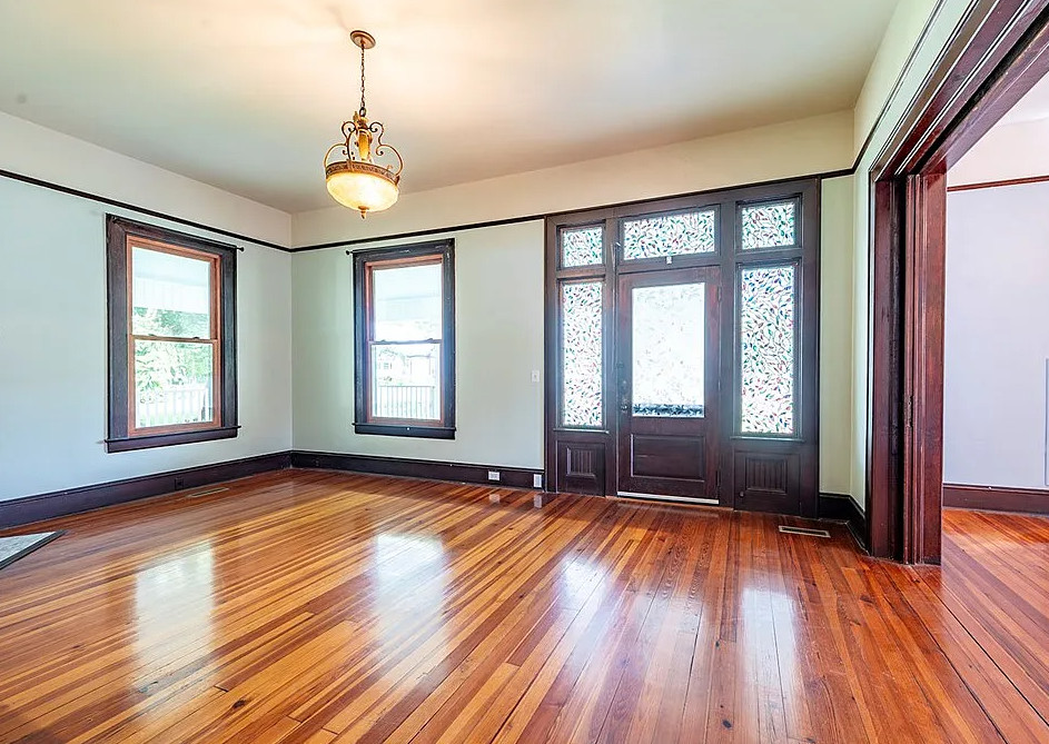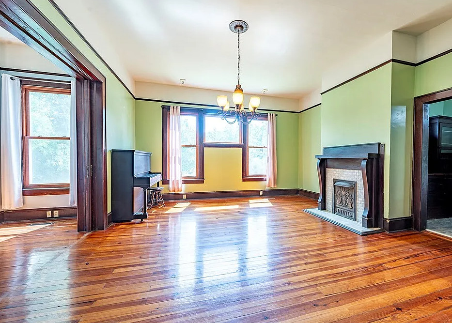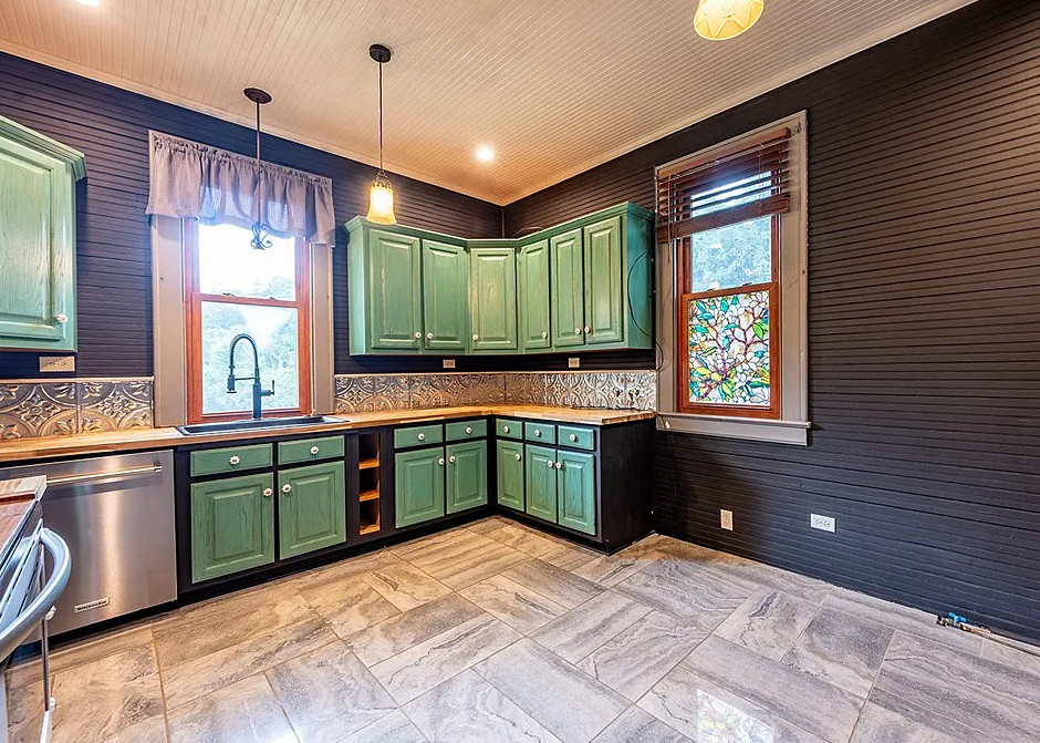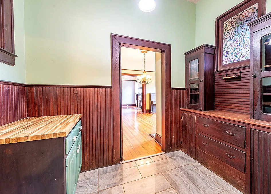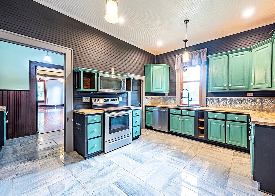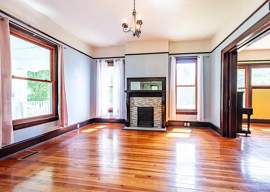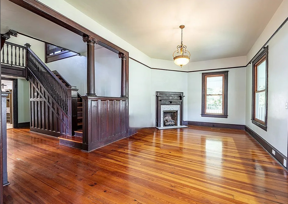 This house has a great staircase, pretty floors and a nice porch! The house was built in 1914. It is located on 2.03 acres in Parrott, Georgia. The house features a large wrap around front porch, gleaming hardwood floors, grand staircase, stained glass, baseboards, picture rails, butler’s pantry, pocket doors and a spacious kitchen. Not a fan of the black in the kitchen. There are two outbuildings on the property for storage. Five bedrooms, two bathrooms and 3,634 square feet. $299,900