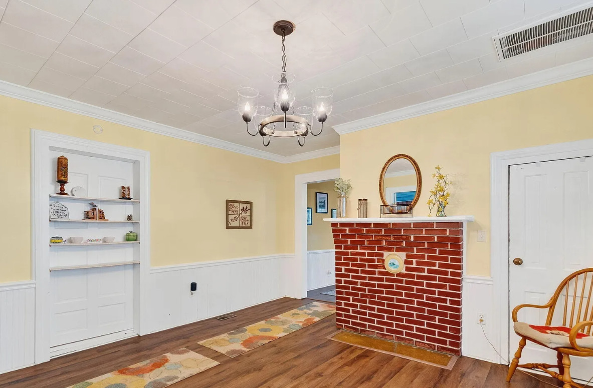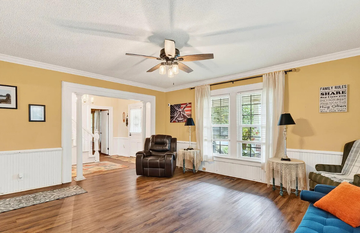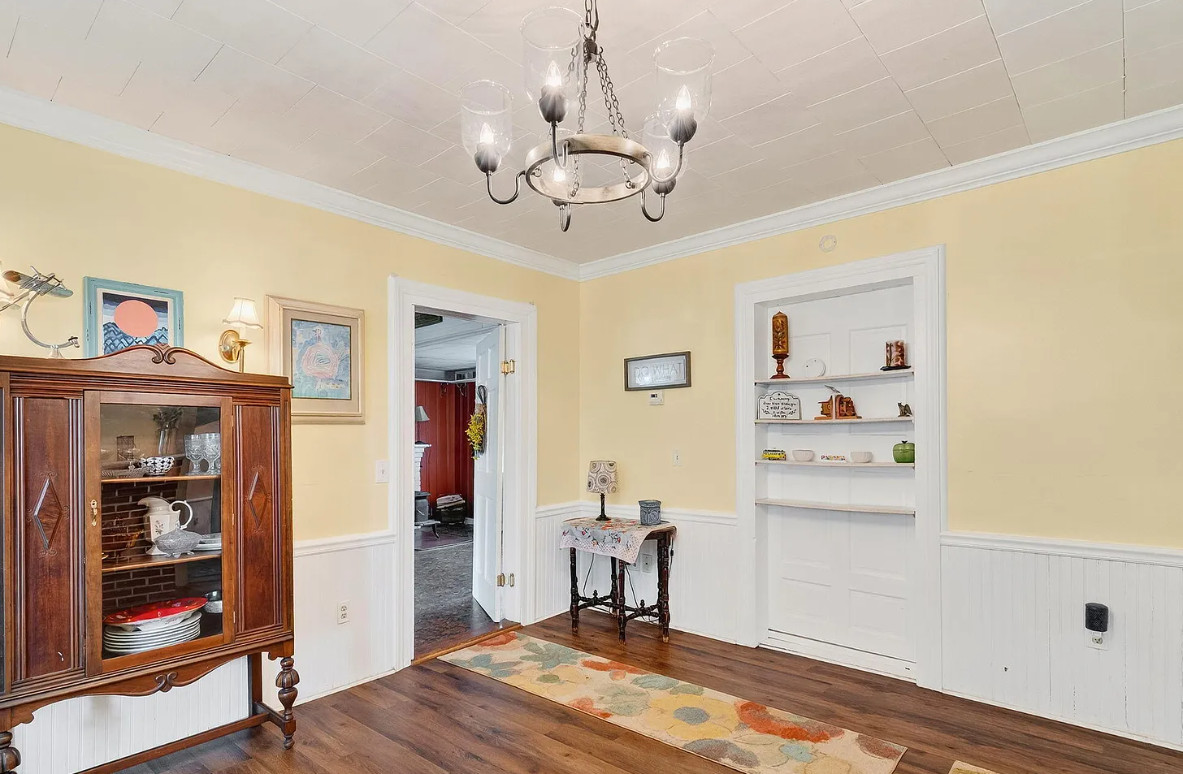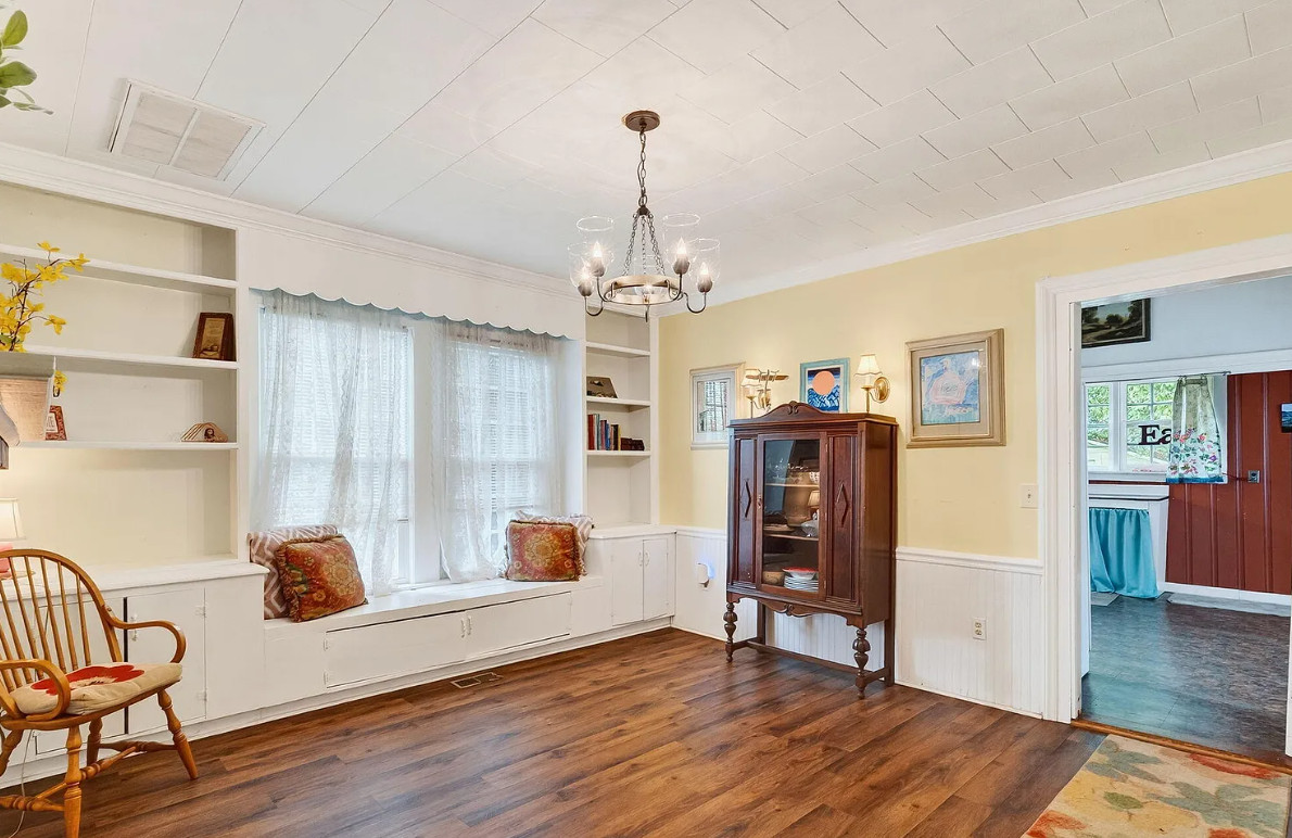 This is a nice house! Decent price too. Spring Hope is a nice town, quaint. The house was built in 1910. It is located on .28 acre in Spring, Hope, North Carolina. I’m not a fan of the different flooring and especially the painted floors. The house features a covered front porch, some original wood floors, wainscoting, crown moulding, built-in bookshelves, spacious kitchen and knotty pine. Three bedrooms, two bathrooms and 2,678 square feet. $249,900