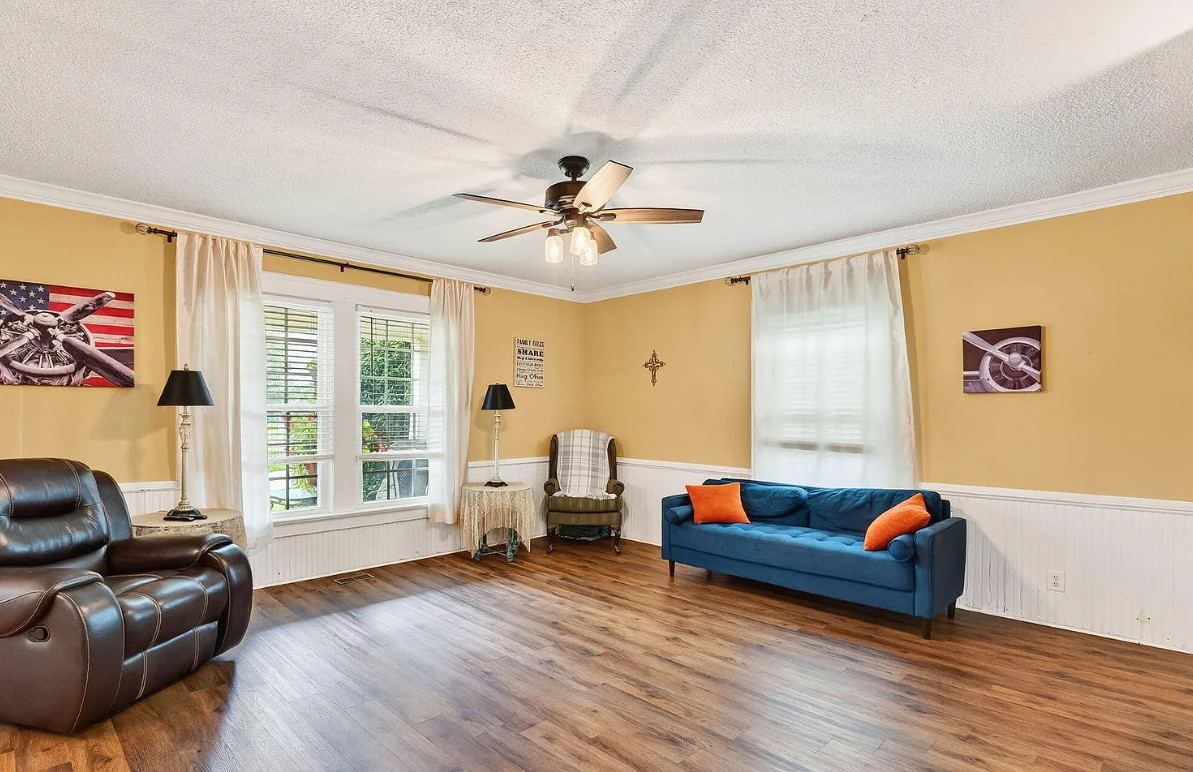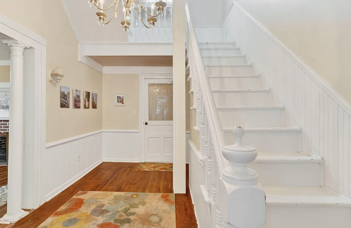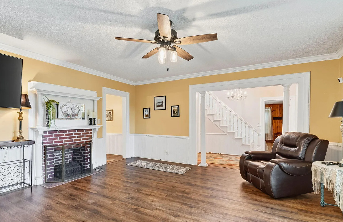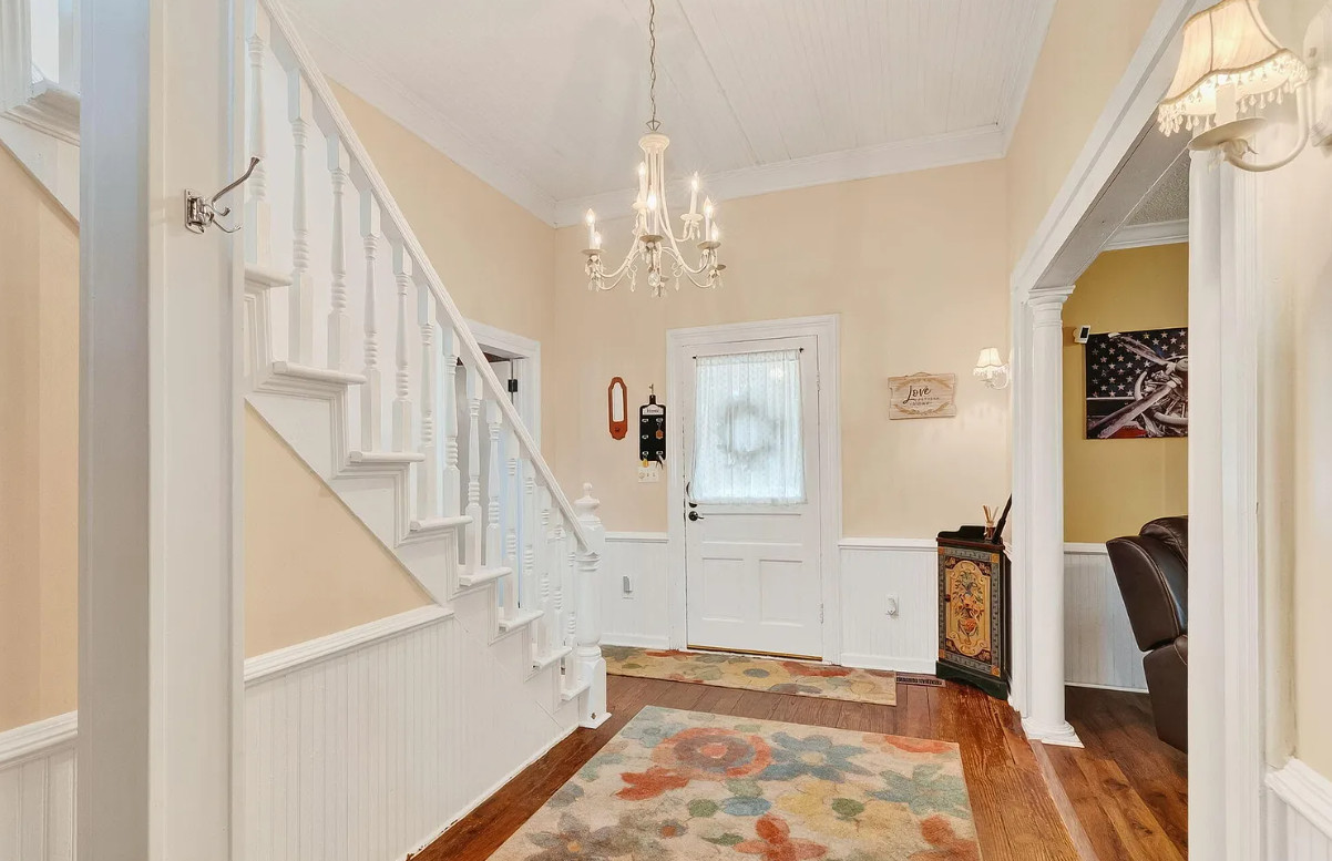 This is a nice house! Decent price too. Spring Hope is a nice town, quaint. The house was built in 1910. It is located on .28 acre in Spring, Hope, North Carolina. I’m not a fan of the different flooring and especially the painted floors. The house features a covered front porch, some original wood floors, wainscoting, crown moulding, built-in bookshelves, spacious kitchen and knotty pine. Three bedrooms, two bathrooms and 2,678 square feet. $249,900