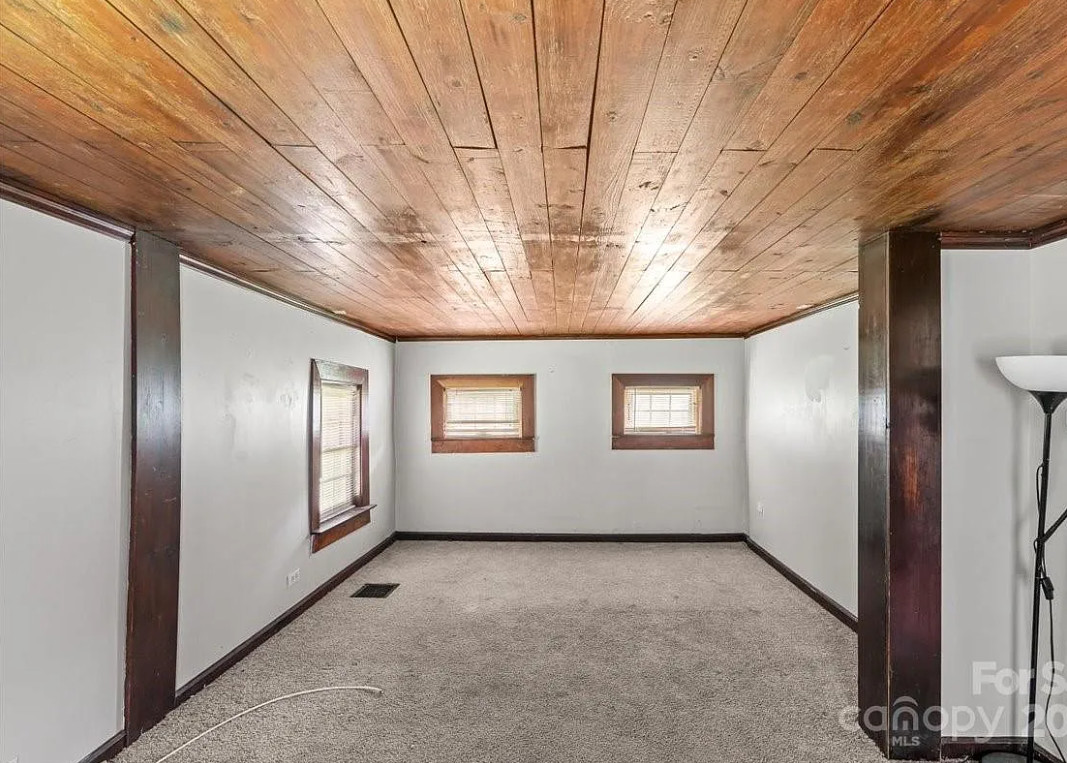 Stone and log house! This house was built in 1941. It is located on 1.19 acres in Charlotte, North Carolina. The house features a log and stone exterior, stone chimney, wood floors, baseboards, updated kitchen, updated bathroom and some wood ceilings. There is a large back deck and a few storage buildings on the property. Three bedrooms, one bathroom and 1,076 square feet. $189,995