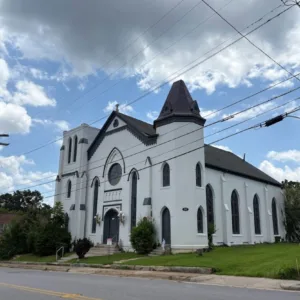 The Smith Bishop House, built in 1918, is an example of a Western Stick Style Bungalow located in Wilson, NC. This isn’t what we’d usually expect stick style to be, but it’s a mixture of Stick and Bungalow architecture! The decorative trusswork, vertical battens, and low-pitched, wide gable roof reflect that. Read more about it here.