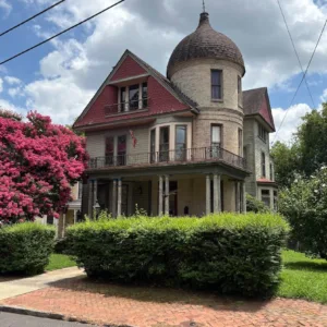 The Dr. H. Biggs House, you’ll be able to tell that it has a combination of Queen Anne and Shingle Style elements. It’s located in Rutherfordton, NC and was originally built for the co-founder of the Rutherford Hospital. It features parquet flooring, Palladian-style windows, tall ceilings, and crown moulding. Click here to read the article and to see the interior!
