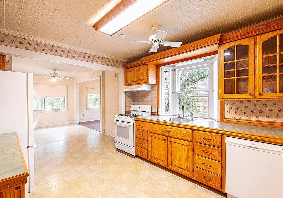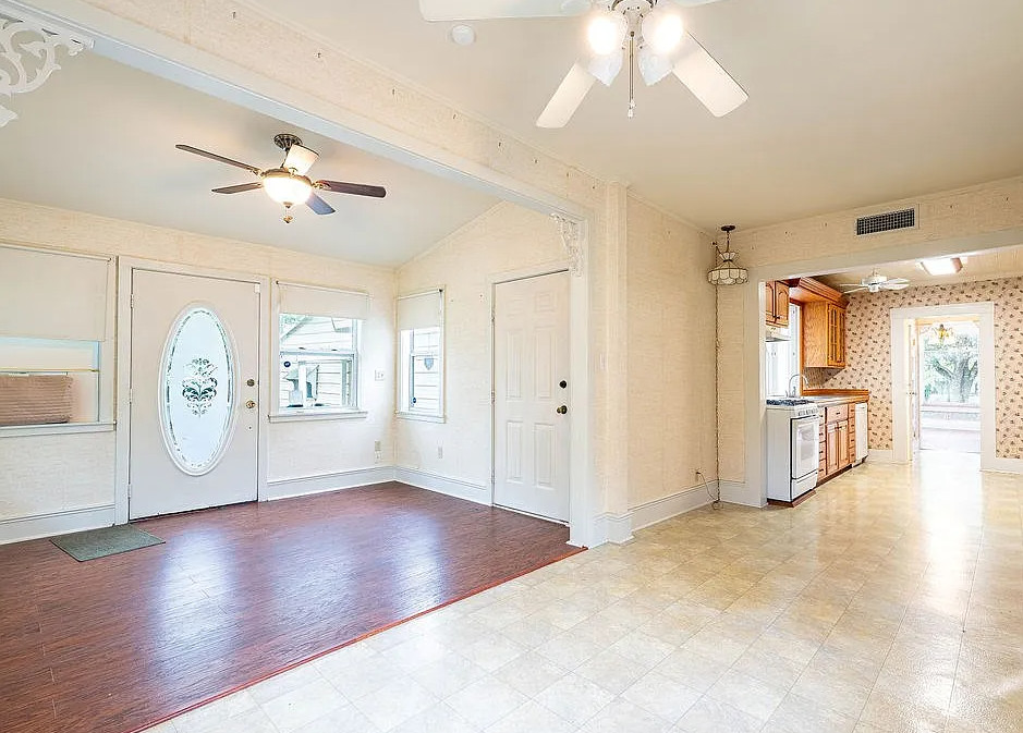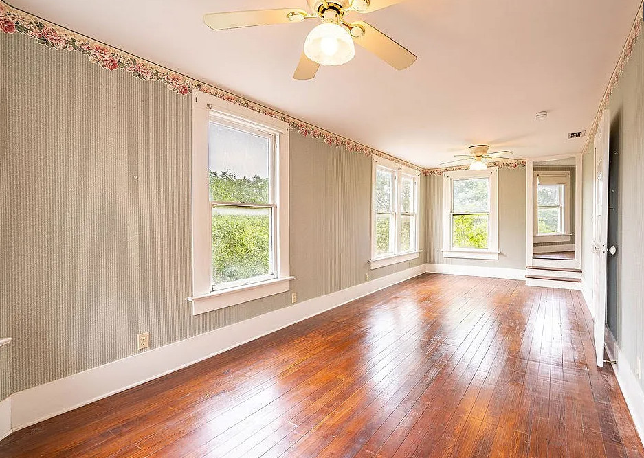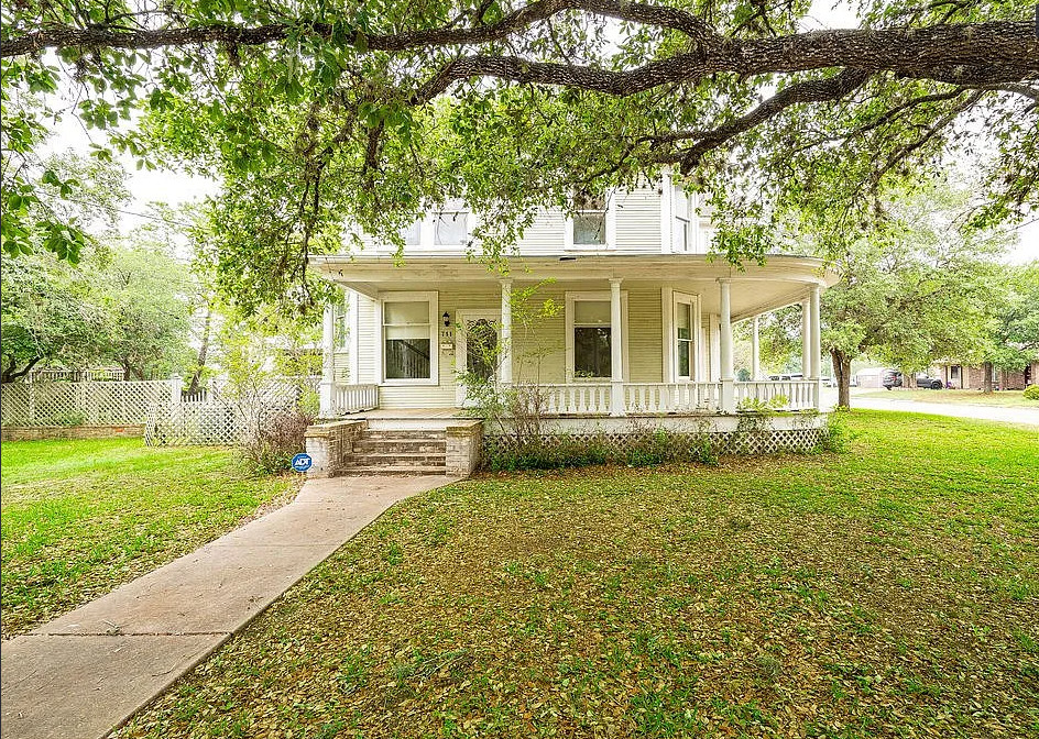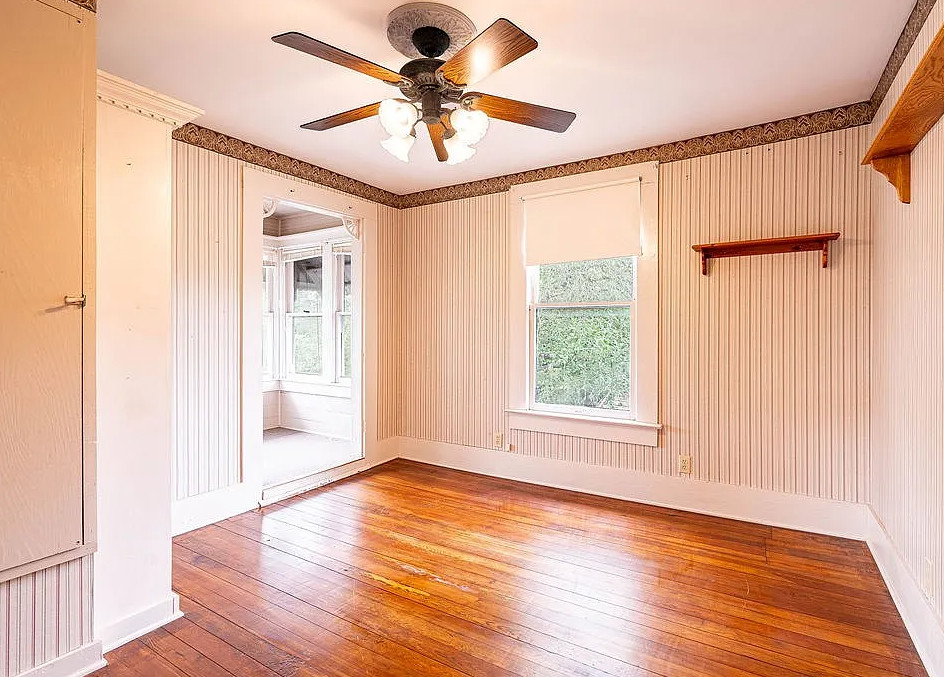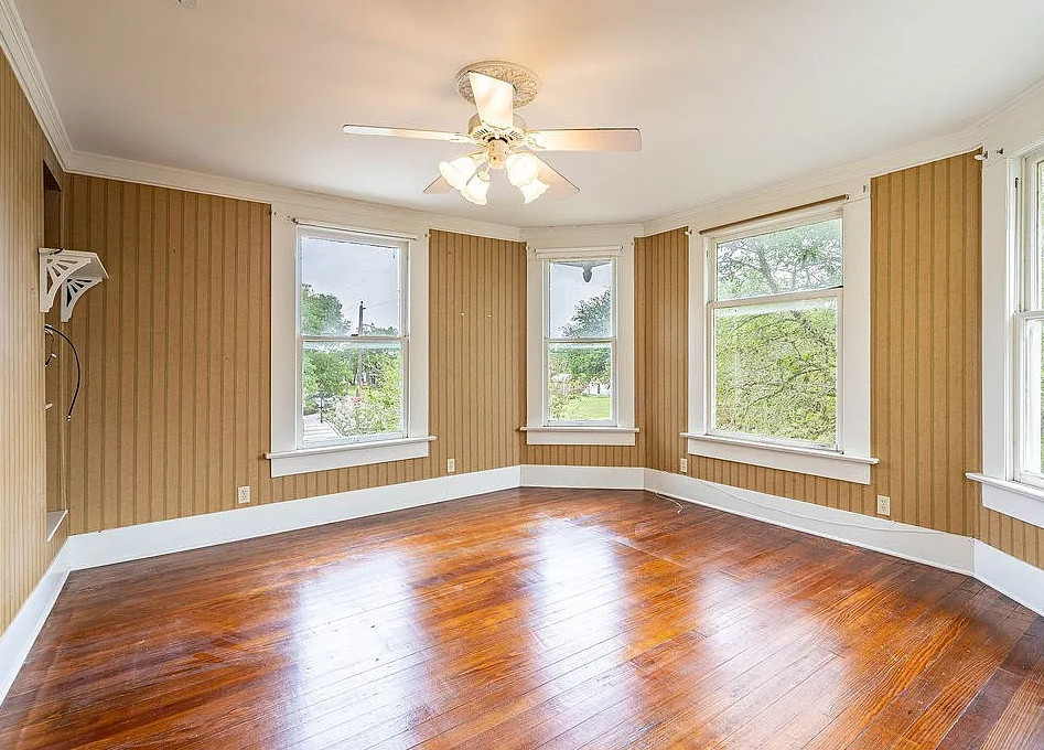 This is a quaint looking house! I like the foyer wallpaper and the vintage light fixture. The house was built in 1910. It is located on .48 acre in Beeville, Texas. The house features a wrap around front porch, wood floors, wide baseboards, crown moulding, chair rails, nice staircase and a claw foot tub. The house has a big backyard. Three bedrooms, two bathrooms and 2,164 square feet. $260,000