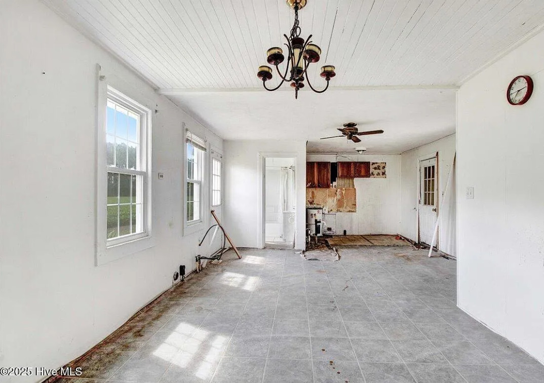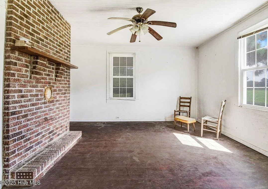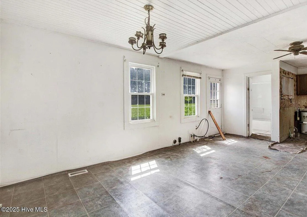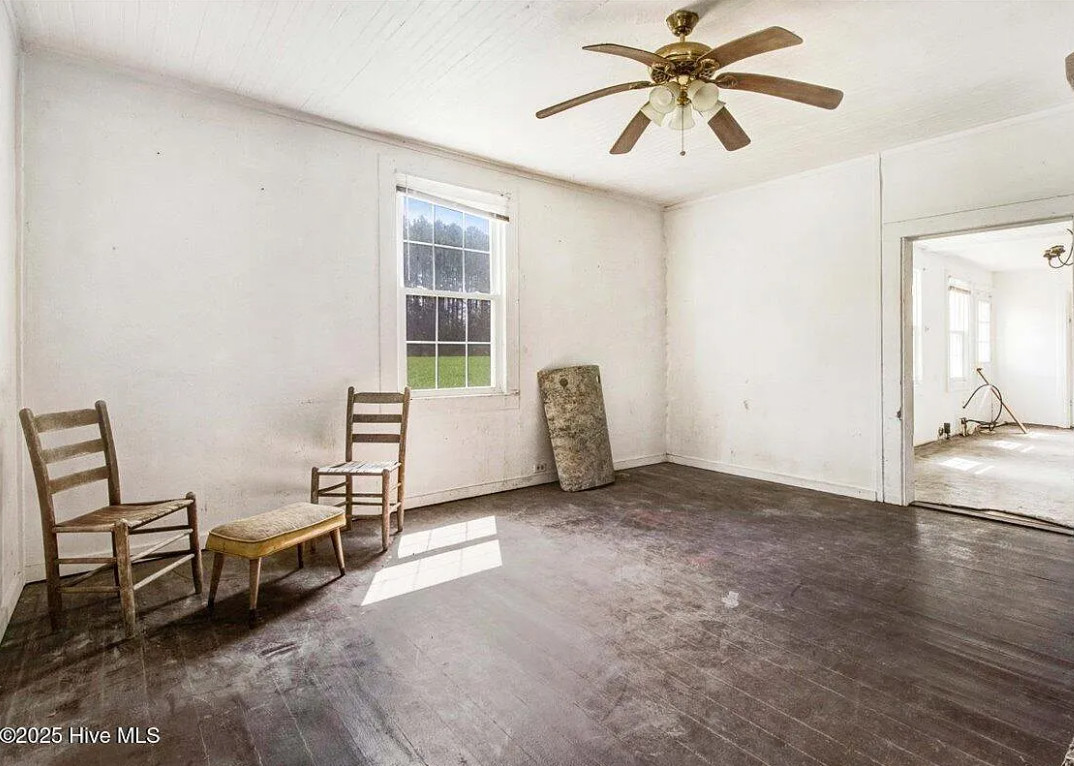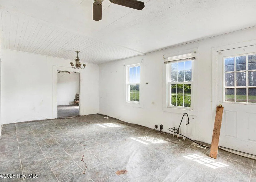 There are pecan trees and blueberry bushes on the property! This is definitely a fixer upper. There is bead board behind all of the paneling. The house was built in 1920. It is located on 3.54 acres in Grifton, North Carolina. The house features a covered front porch, bead board, some wood floors and baseboards. Three bedrooms, one bathroom and 1,486 square feet. $125,000