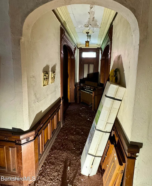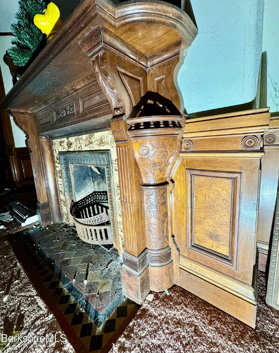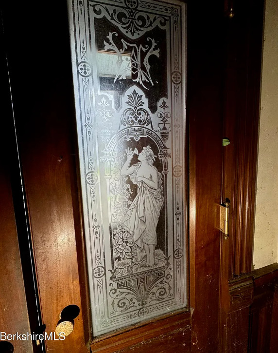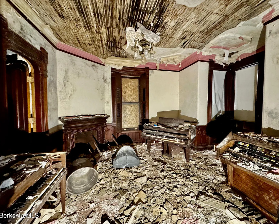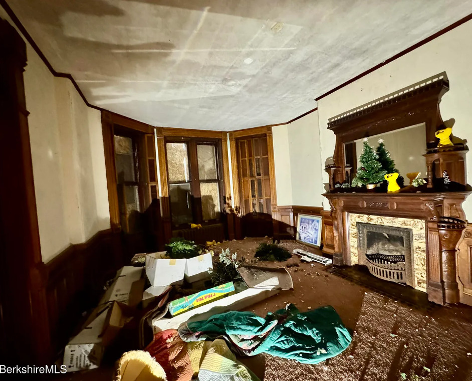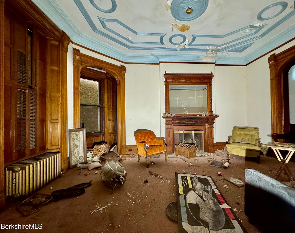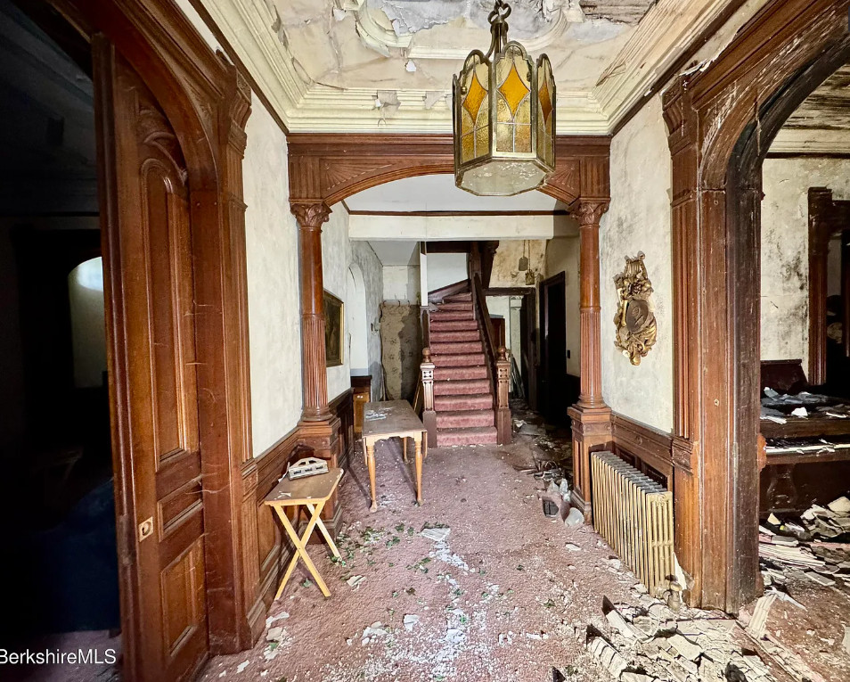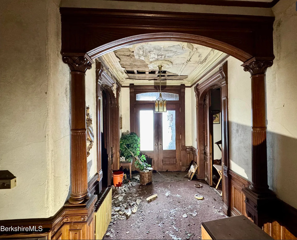 How about that woodwork! But this sure needs a lot of work. Biggest thing would be to clear the house out. Clearly the plaster fell in a couple of rooms and the roof probably needs to be replaced. The house was built in 1890. It is located on .41 acre in North Adams, Massachusetts. The house features a vestibule, pocket doors, double front doors, etched glass, wainscoting, picture rails, wide baseboards, beautiful mantels and tall ceilings. Ten bedrooms, three bathrooms and 6,076 square feet. $67,000