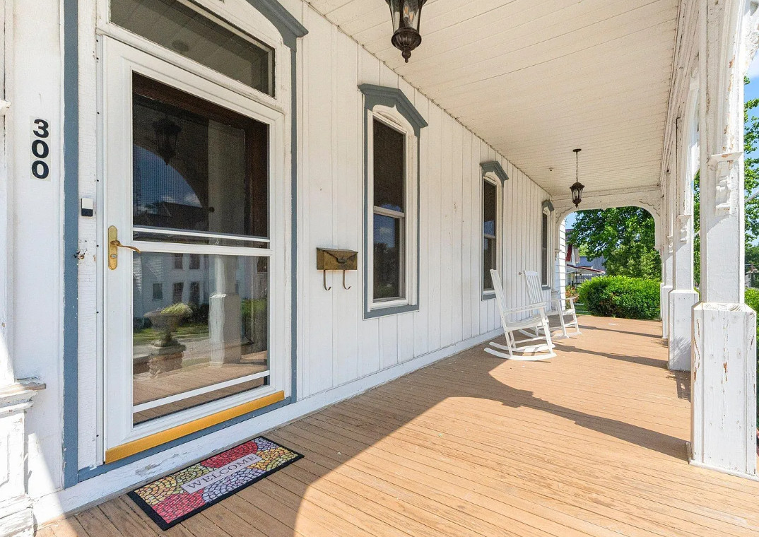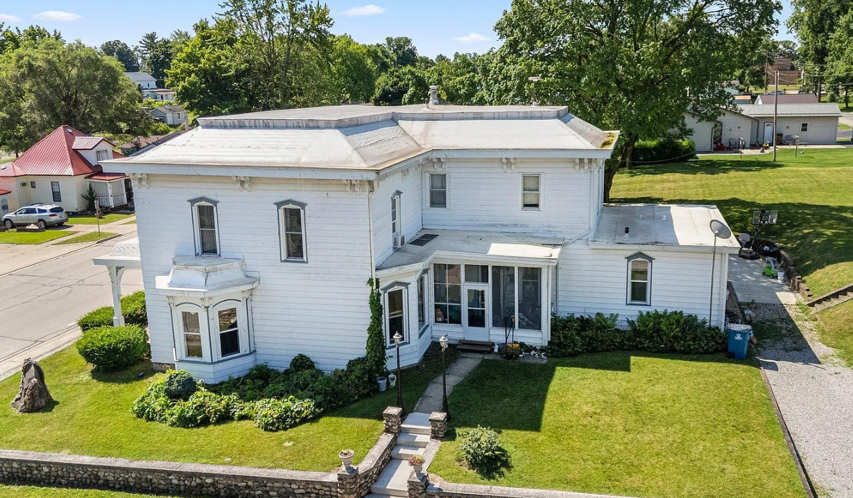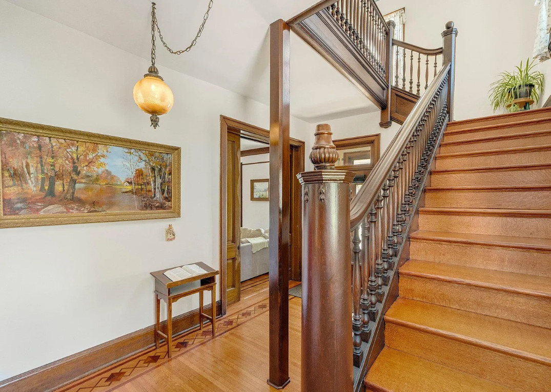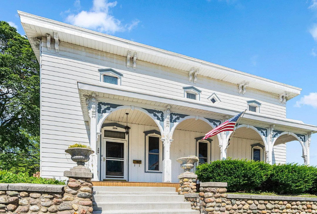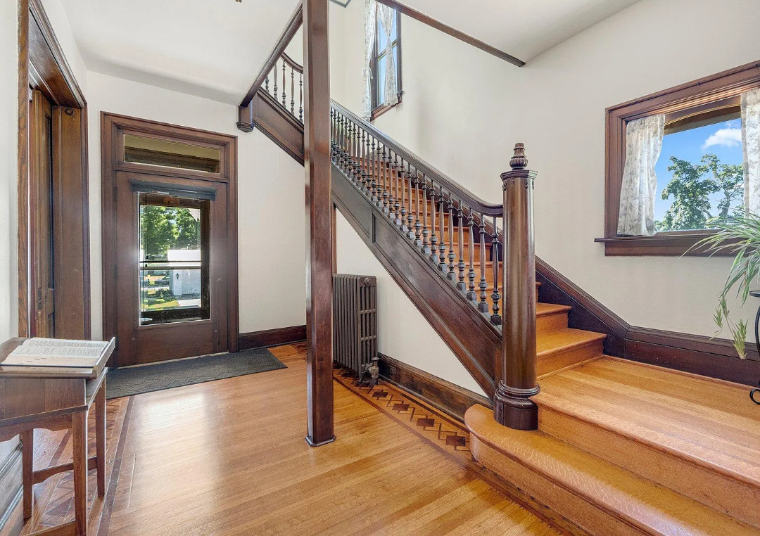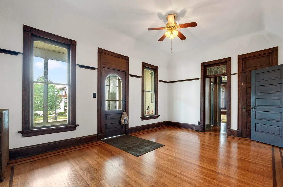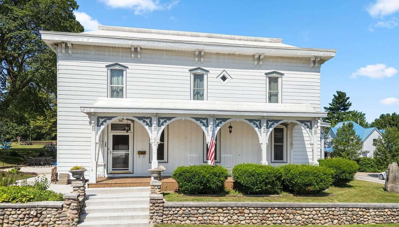 This house has a pretty interior! Love the pocket doors! This is a big house with 4,000 square feet. The house was built in 1888. It is located on .74 acre in Ligonier, Indiana. The house features a covered front porch, pretty wood floors, pocket doors, nice staircase, in-laid wood floors, picture rails, wainscoting and stained glass. The property has a large patio and a detached storage shed. Six bedrooms, three bathrooms and 3,948 square feet. $328,500