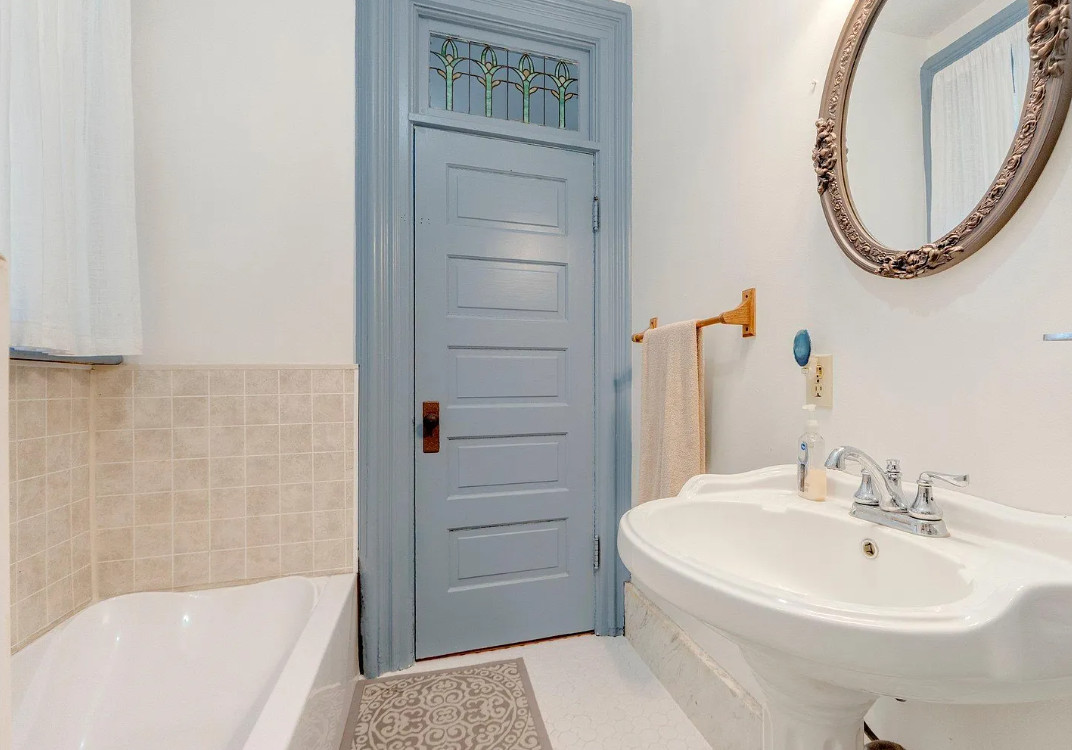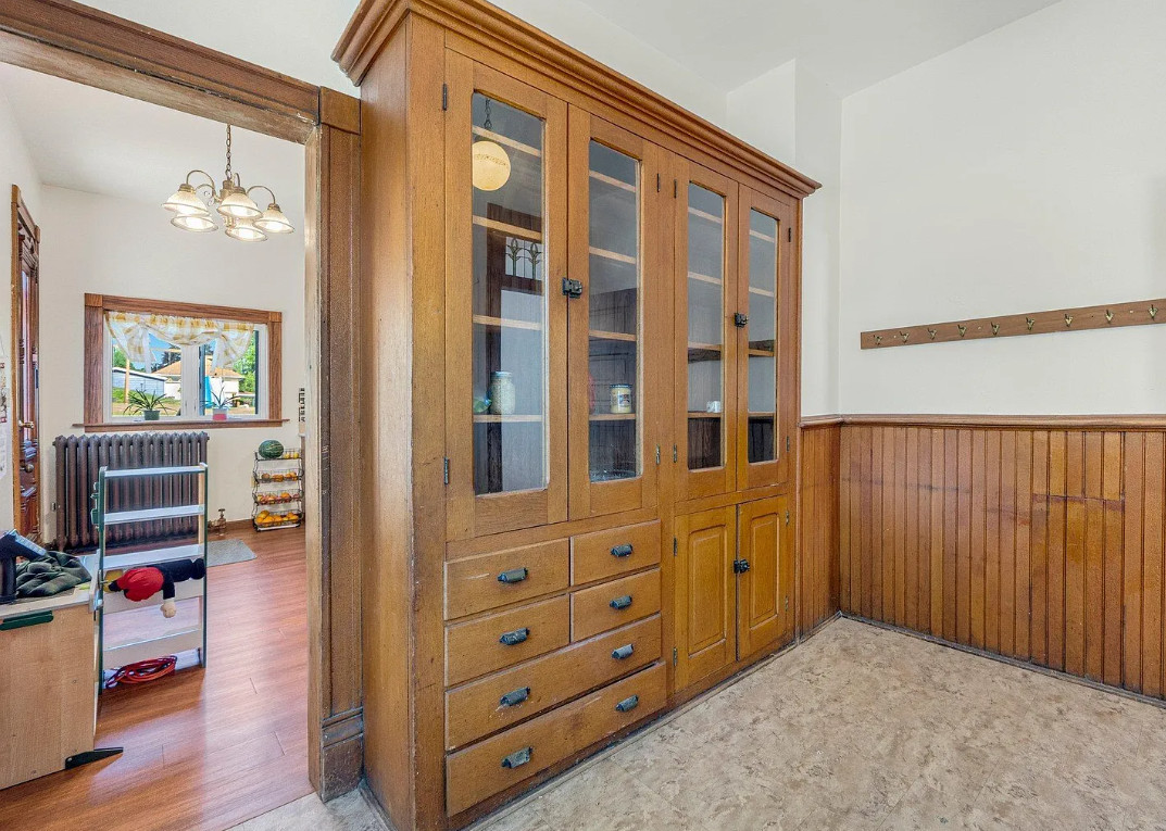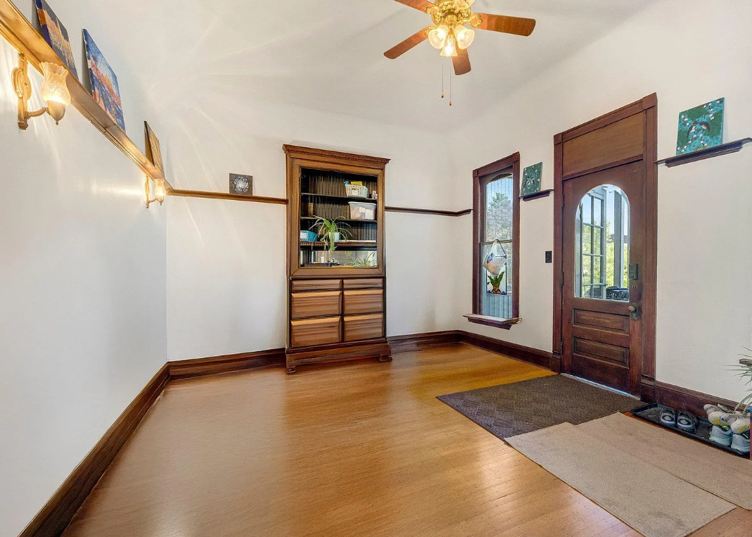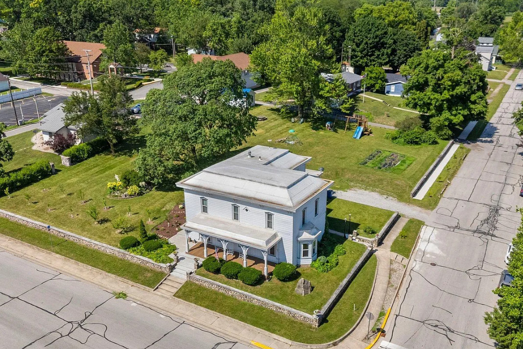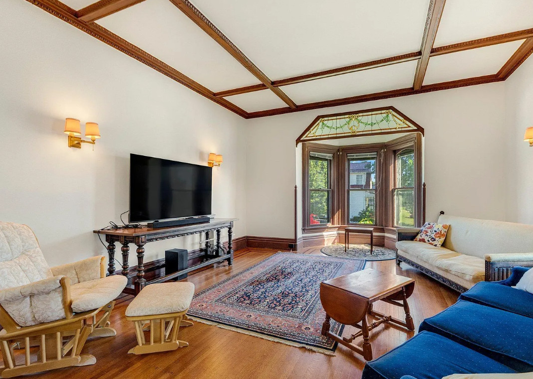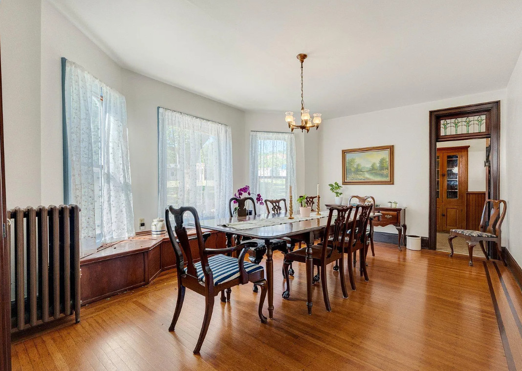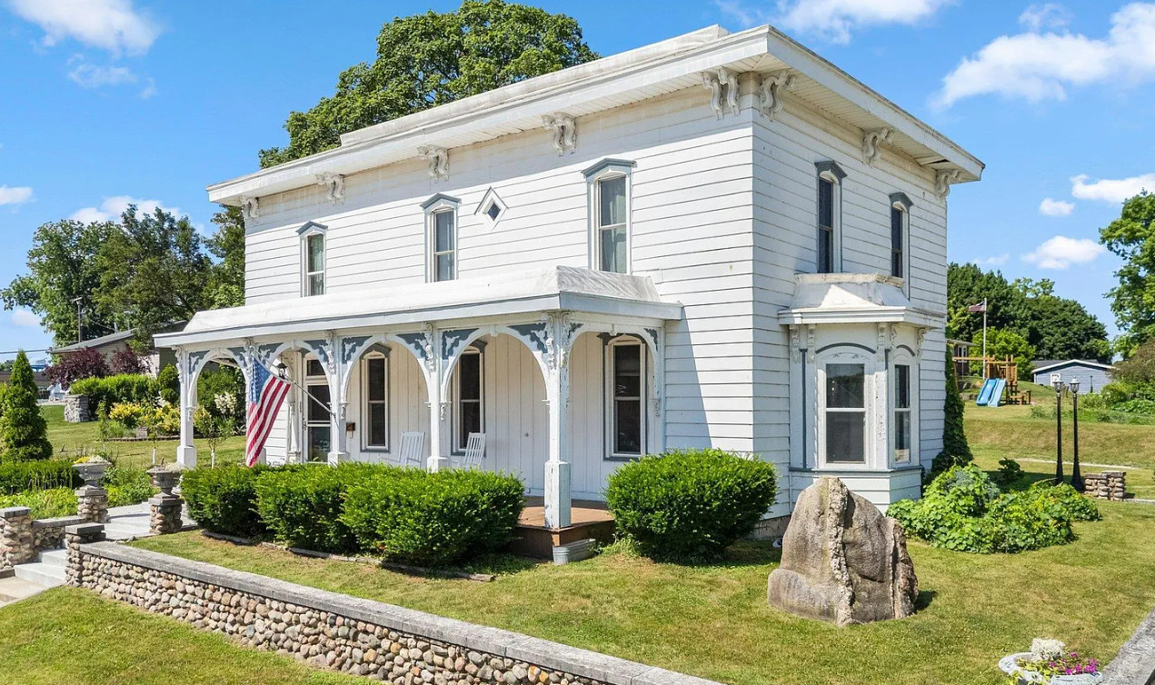 This house has a pretty interior! Love the pocket doors! This is a big house with 4,000 square feet. The house was built in 1888. It is located on .74 acre in Ligonier, Indiana. The house features a covered front porch, pretty wood floors, pocket doors, nice staircase, in-laid wood floors, picture rails, wainscoting and stained glass. The property has a large patio and a detached storage shed. Six bedrooms, three bathrooms and 3,948 square feet. $328,500