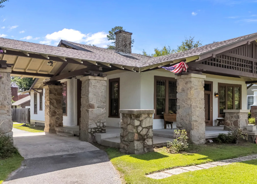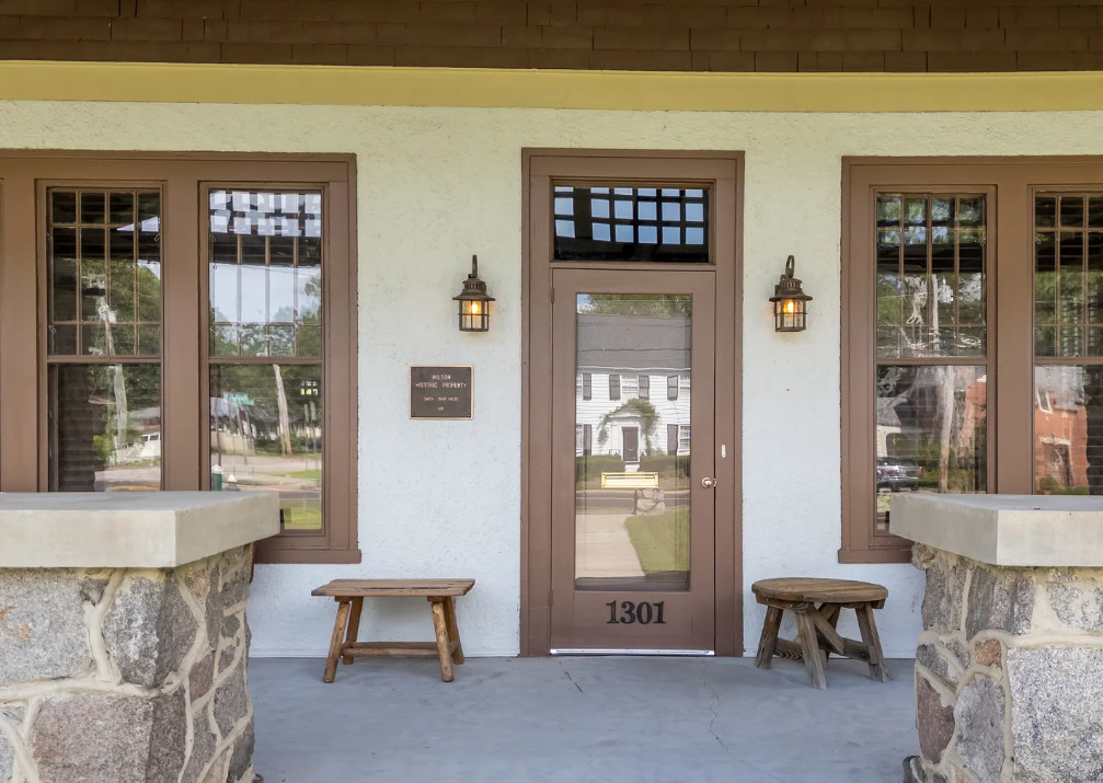 Located in the West Nash Historic District, The Smith-Bishop House is on the National Register of Historic Places. With Oliver Nestus Freeman stonework it has been described as the ”most robust of three significant Western Stick style bungalows in Wilson. It was built in 1918 for William B Smith, the president of Planters Bank and the developer of West End Park. This one-story house features a broad front gable filled with a decorative lattice; a similar, but smaller gable shelters the porte cochere on the West End Avenue elevation. The noteworthy use of granite for the massive pillars and exterior end, half-shoulder chimney is also characteristic with the form in Wilson. Uncommon here are the stuccoed walls with woodshingled gables and the triple twelve-over-one sash windows which flank the central entrance. Also noteworthy are the notched exposed rafters. The interior focuses on a massive granite fireplace and has French doors and modest woodwork. Like many of the other houses on West Nash Street, the Smith-Bishop House has a yard shaded by large oak trees. A distinctive feature here is the use of short stone pedestals to mark the sidewalk and the front corners of the lot.”(Tom Butchko, Author). House boasts well-appointed Kitchen with center island, granite counters, tiled backsplash, and stainless appliances, including gas stove. Formal Living and Dining Rooms. Master Bedroom with en-suite bath. 2 Guest Rooms down with Full Bath in Hall. 4th Guest Room or Bonus Room Up. In-ground Salt-water Pool and wired Pool House make this a perfect house for entertaining.
