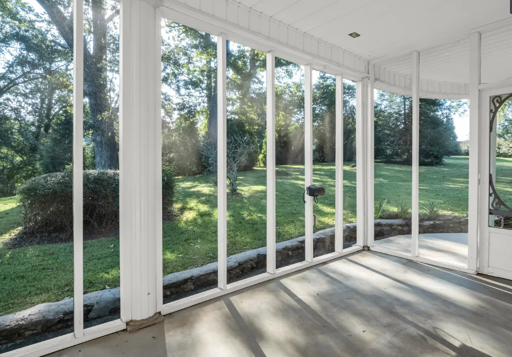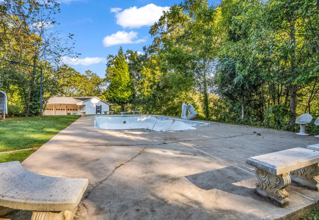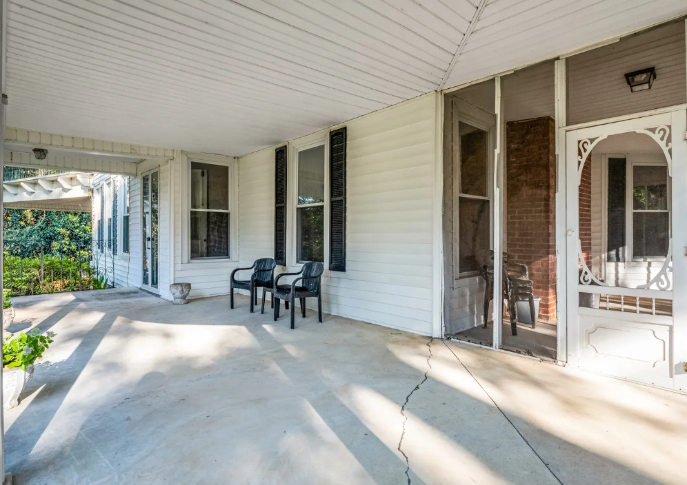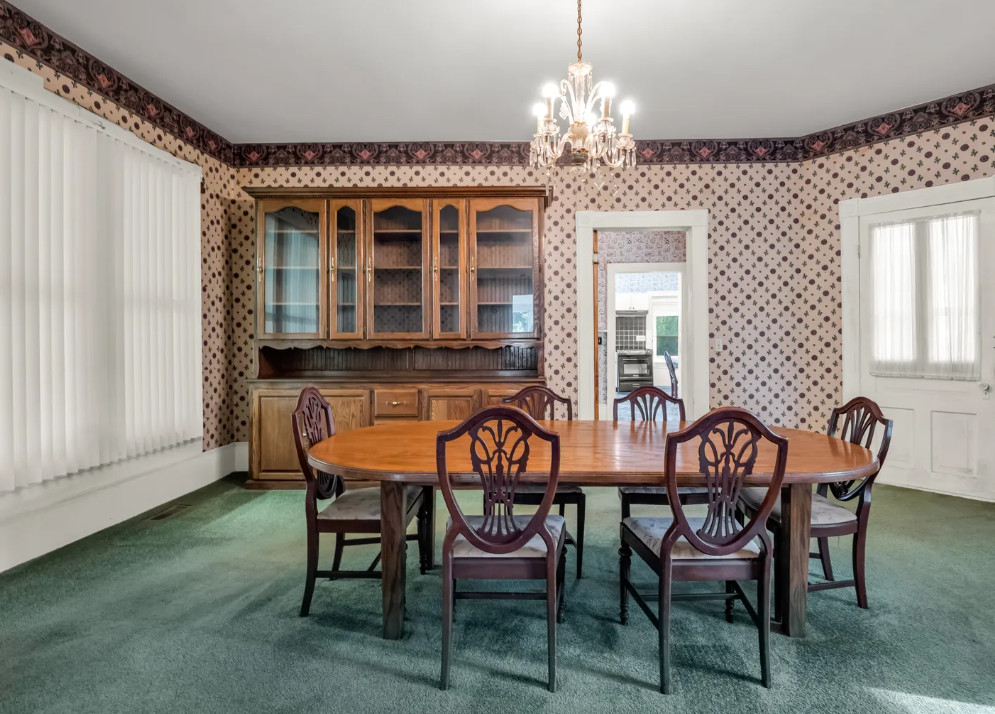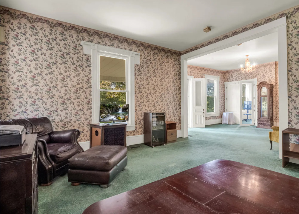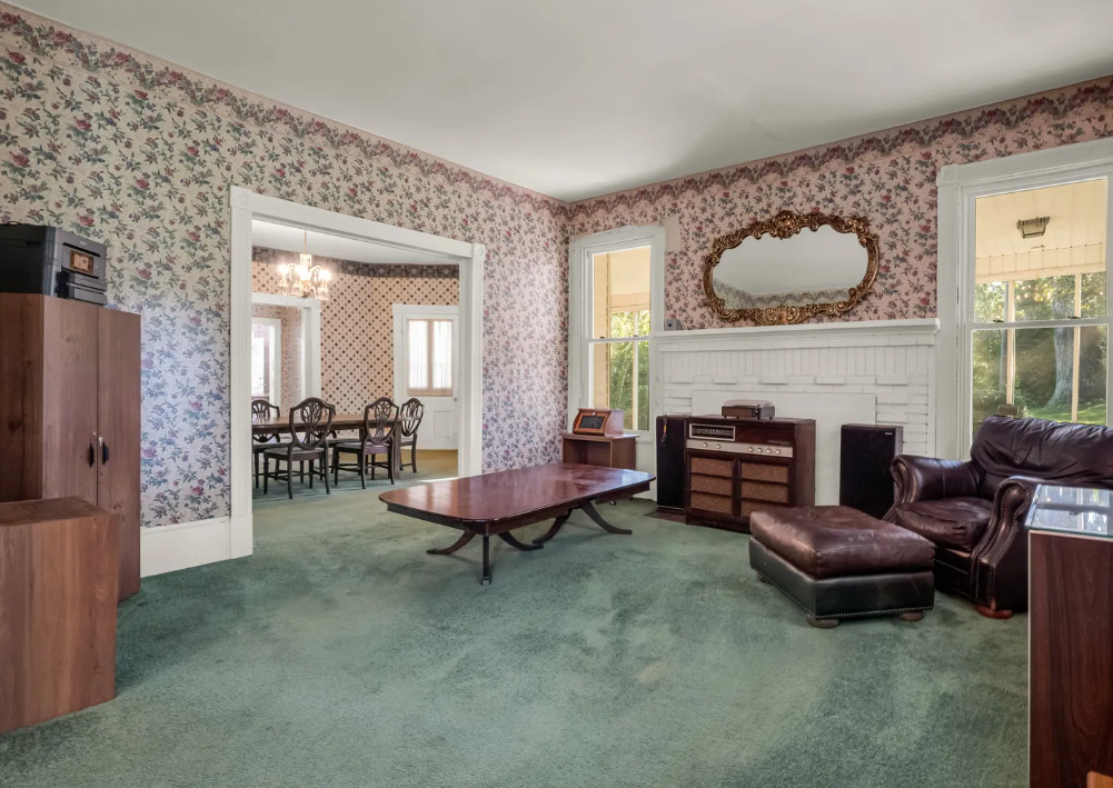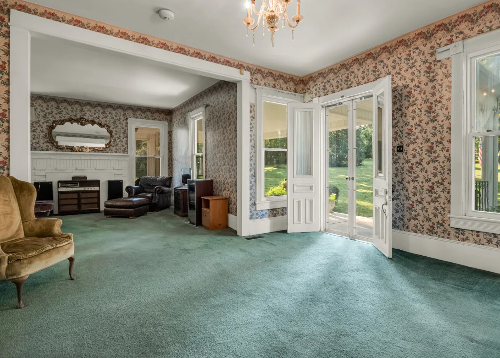 This house looks like a vintage time capsule inside! There is a pool on the property and a gazebo with electricity. The house was built in 1900. It is located on 16.08 acres in Ellenboro, North Carolina. The house features a covered front porch, porte cochere, large back patio, wide baseboards, pretty mantels, double front doors, spacious kitchen, sunroom and a large laundry room. Outdoors you will find a fenced in property, gazebo with electric, a detached garage and an in-ground pool. This is a nice house, but the price seems a bit steep to me, even with the acreage. Most likely there are wood floors underneath the carpeting. The house does look livable so someone could work room by room while living there. Four bedrooms, three bathrooms and 4,273 square feet. $550,000
