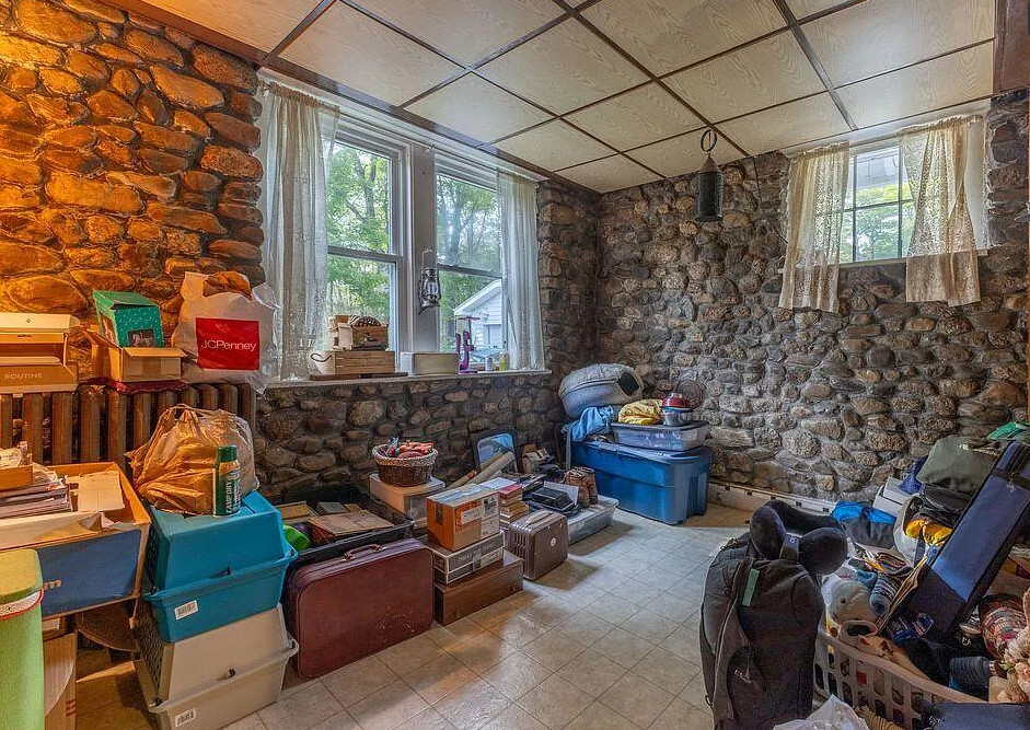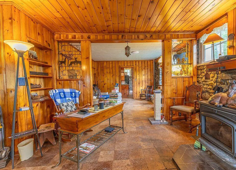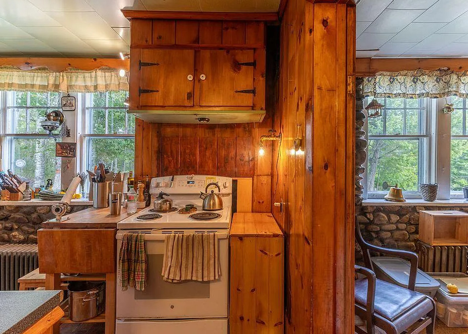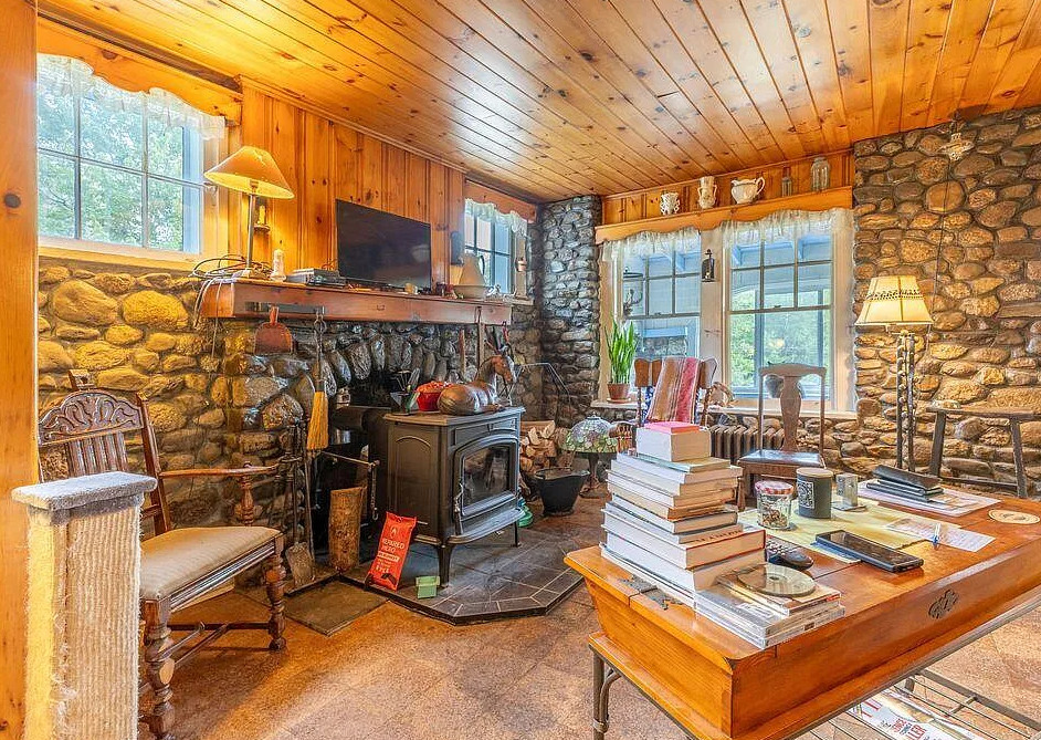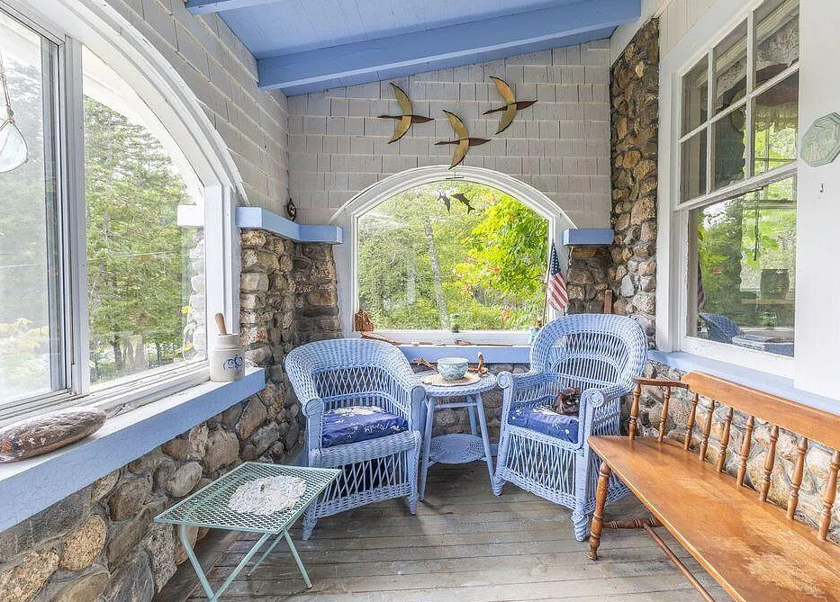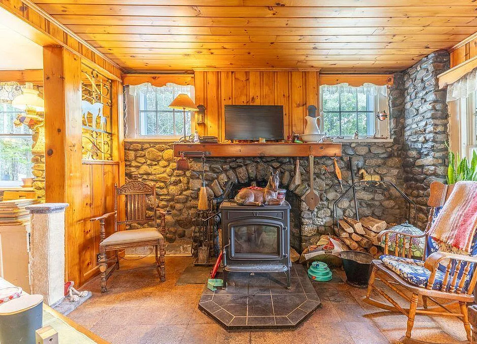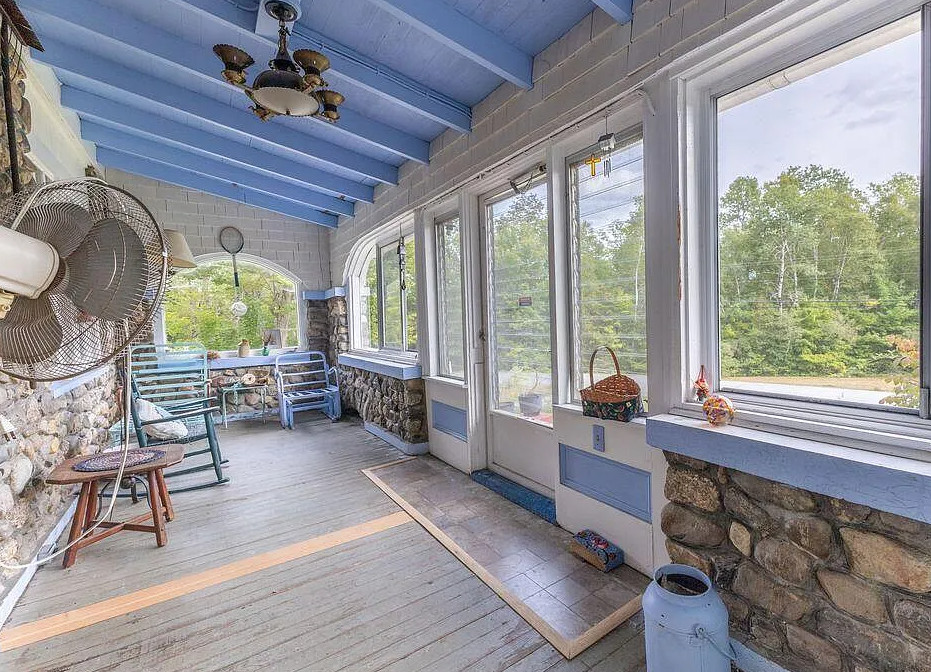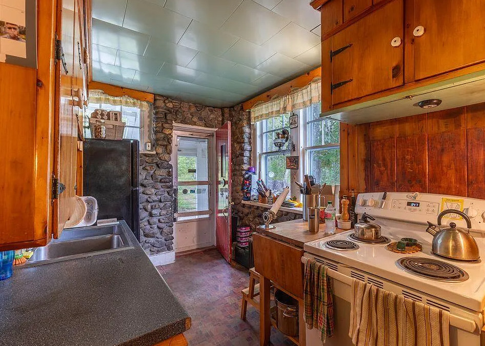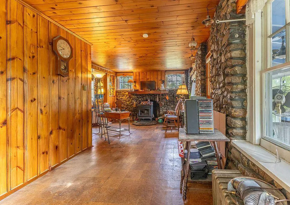 This house has knotty pine and pretty stonework! The house was built in 1904. It is located on four acres in Dedham, Maine. The house features an enclosed front porch, a stone fireplace, knotty pine walls, wood floors and exposed beams. There are a few outbuildings on the property for storage. Just minutes from Green lake and Jenkin’s Beach. Four bedrooms, two bathrooms and 1,680 square feet. $315,000
