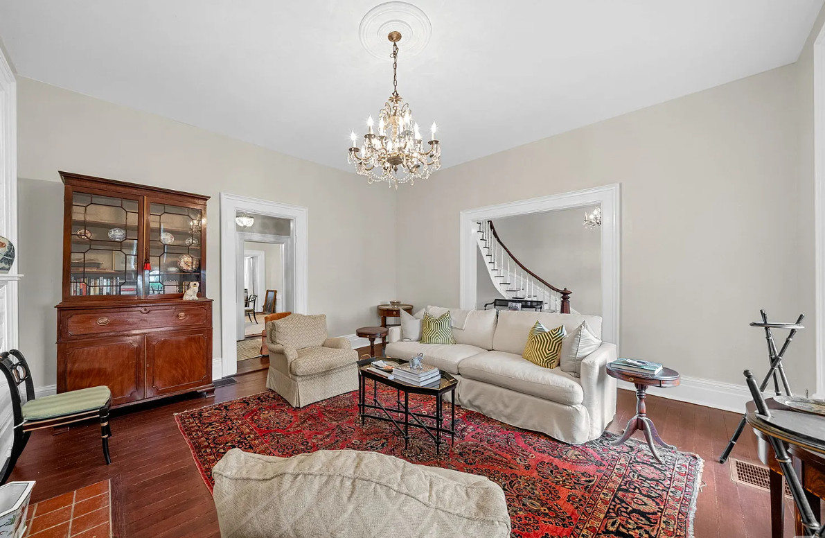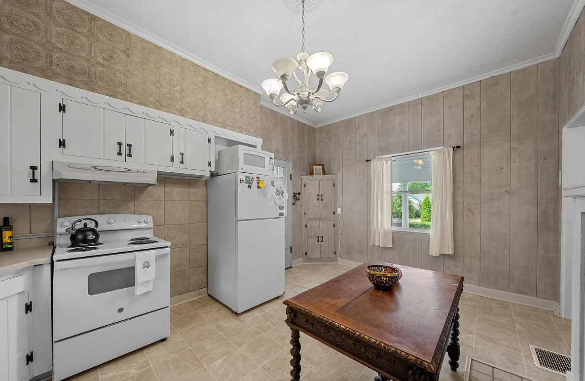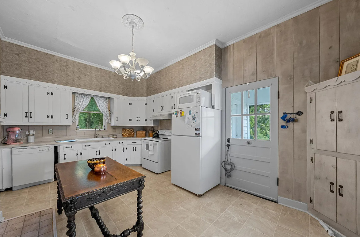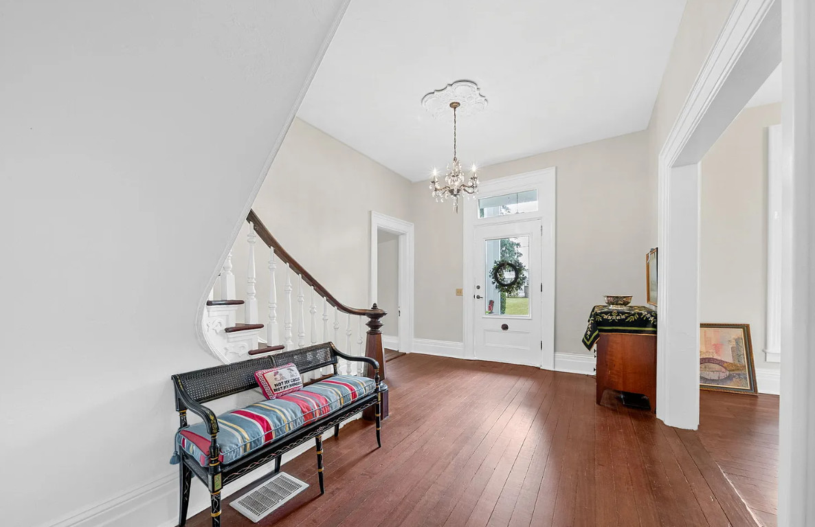 This is a stately looking house! Nice porches! The house was built in 1879. It is located on .9 acre in La Fayette, Kentucky. The house features multiple covered porches, a large patio, wood floors, wide baseboards, a spacious kitchen, wainscoting, a grand staircase, ceiling medallions and pretty chandeliers. Three bedrooms, two bathrooms and 2,576 square feet. $319,900