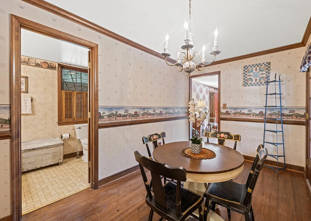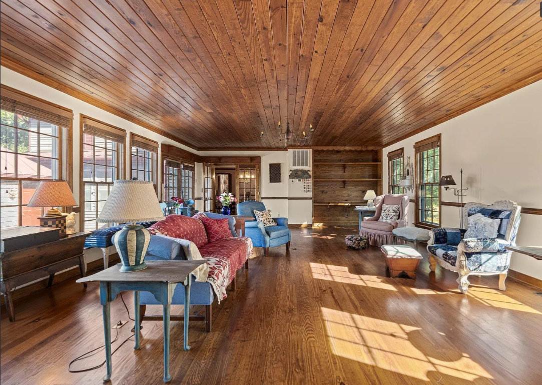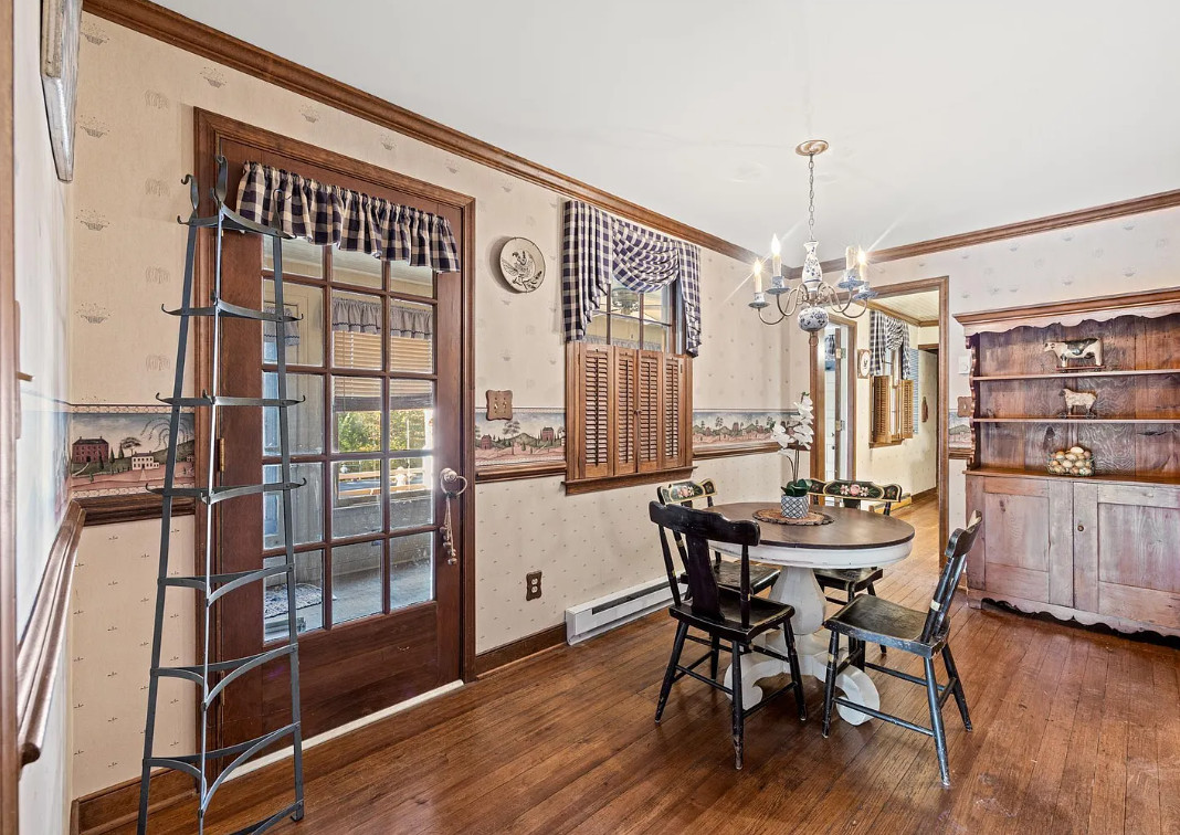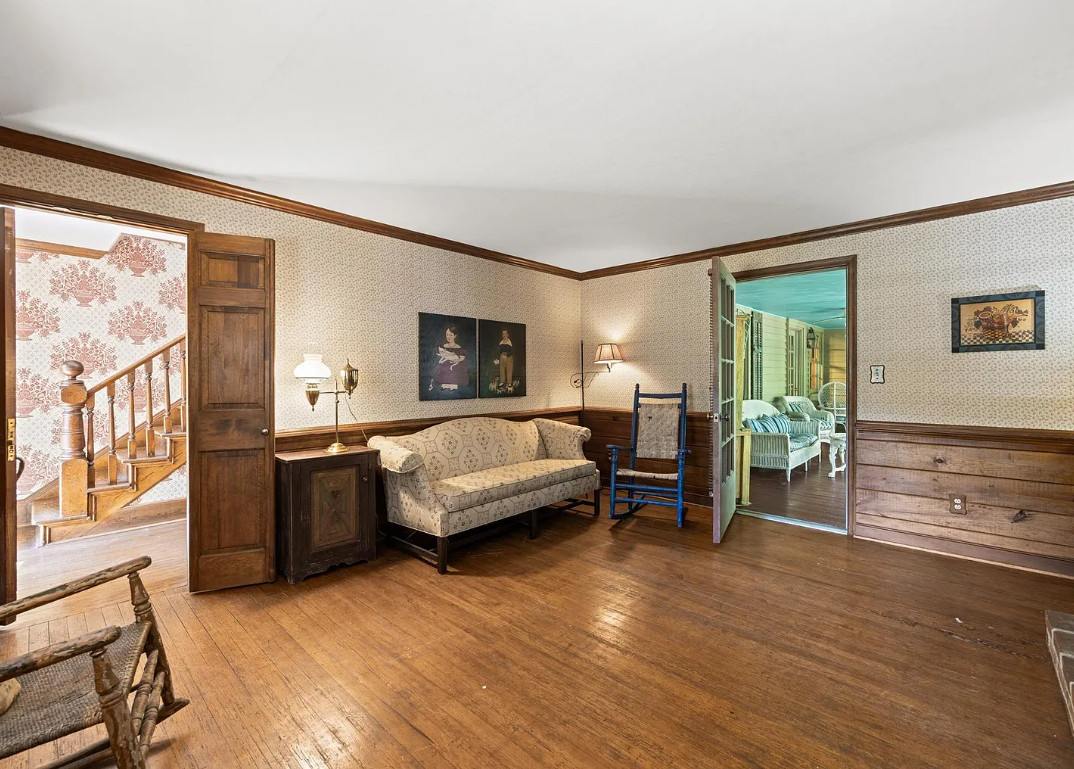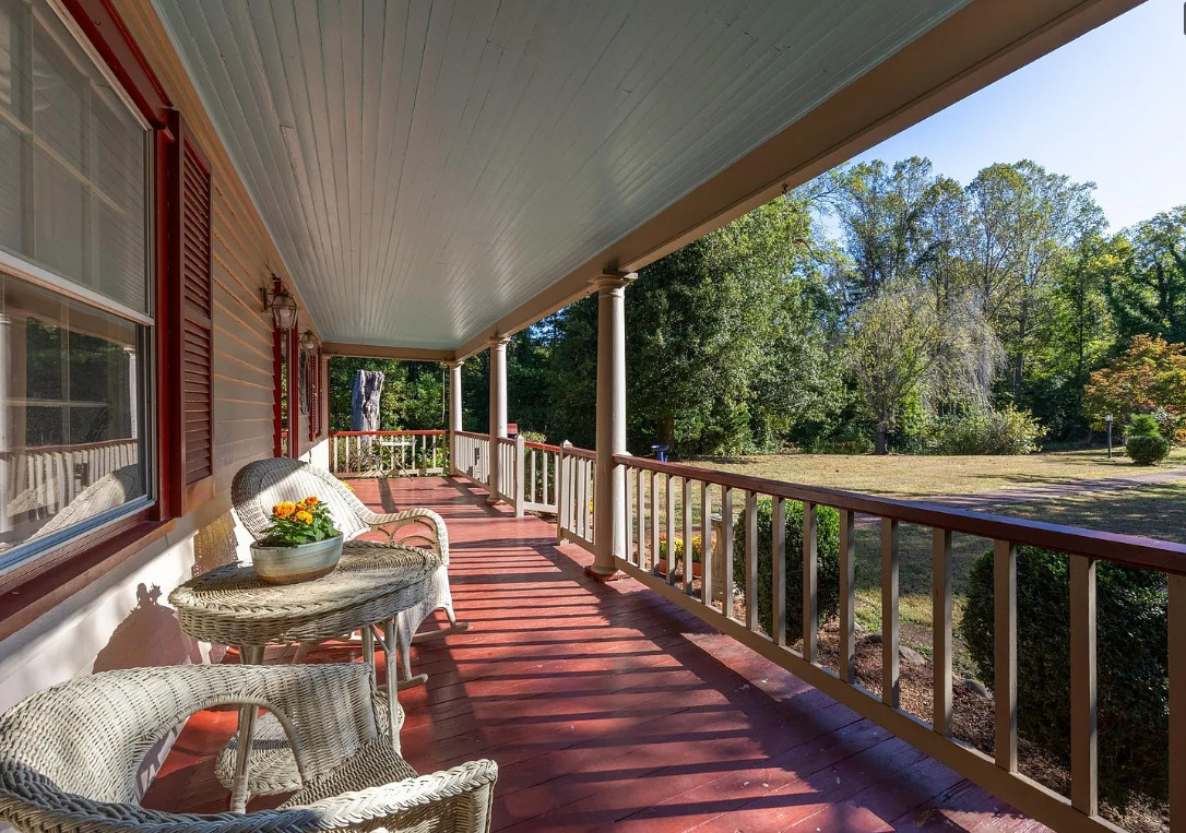 This house has such a pretty setting! Love the scenery, the pool and those porches! The house was built in 1900. It is located on 6.39 acres in Esmont, Virginia. The house features a covered front porch, screened in double side porches, original wood floors, wainscoting, crown moulding, large brick fireplace, chair rails, baseboards, stone fireplace and a sunroom. There is a large in-ground pool, a detached storage shed, attic and an old barn. Close to orchards and wineries. Three bedrooms, two bathrooms and 2,724 square feet. $675,000