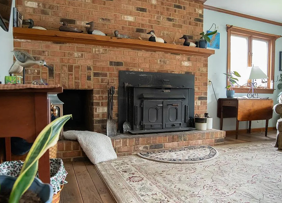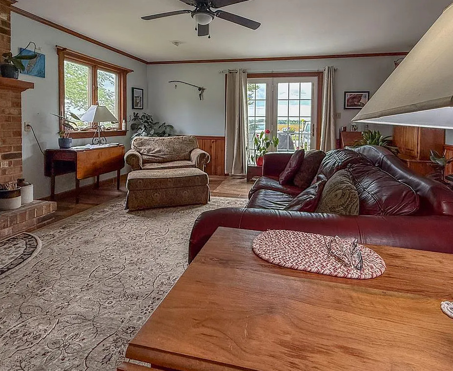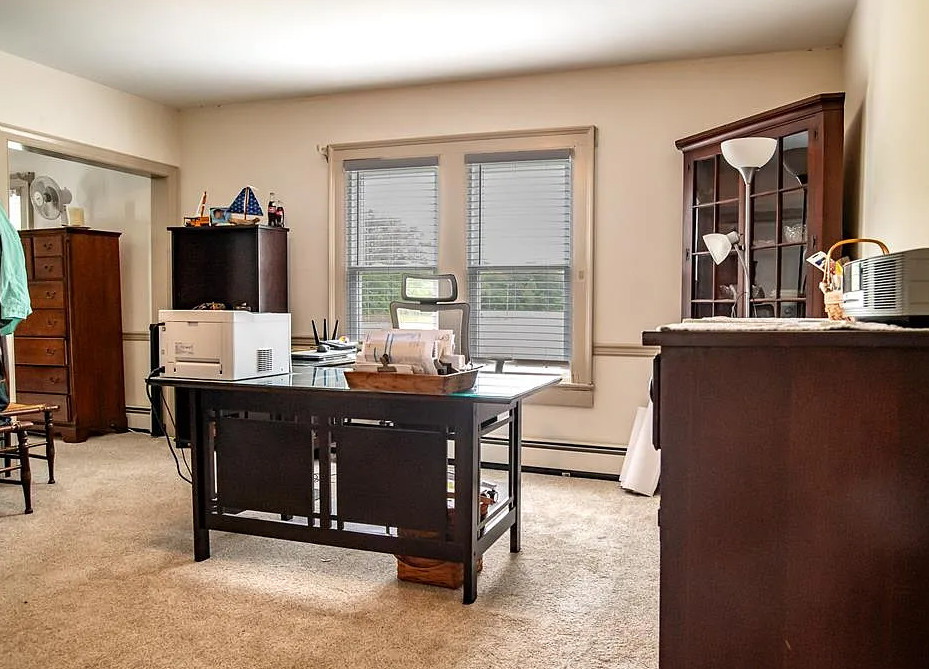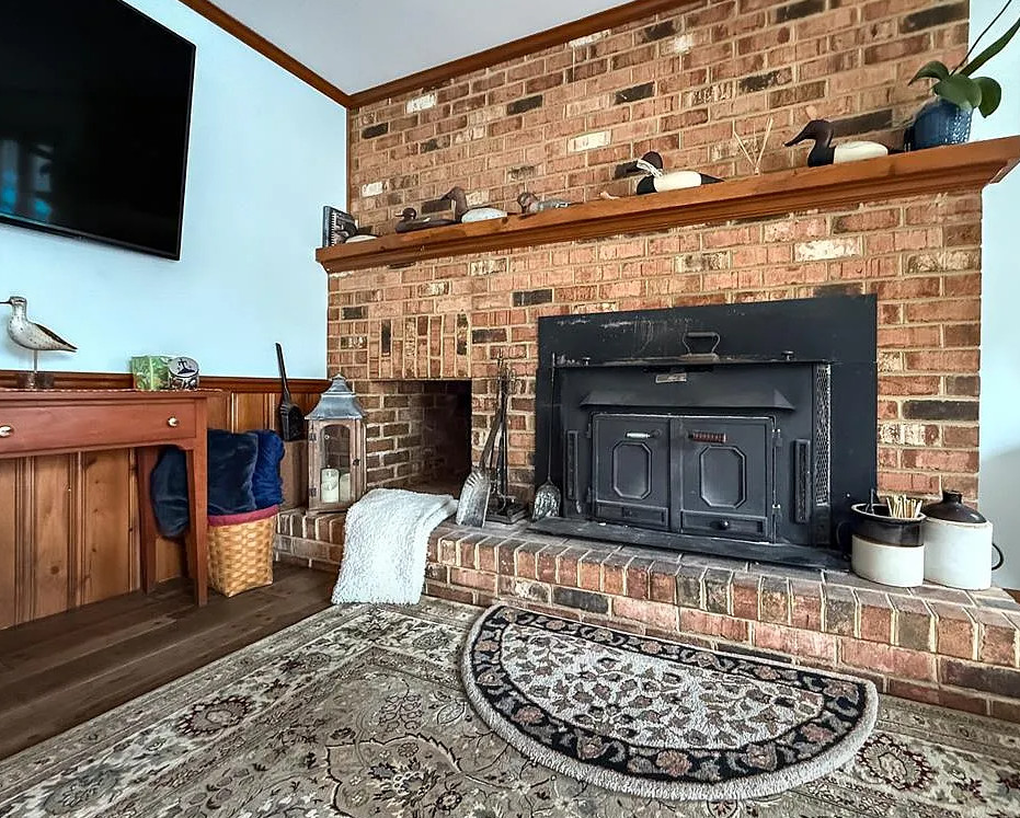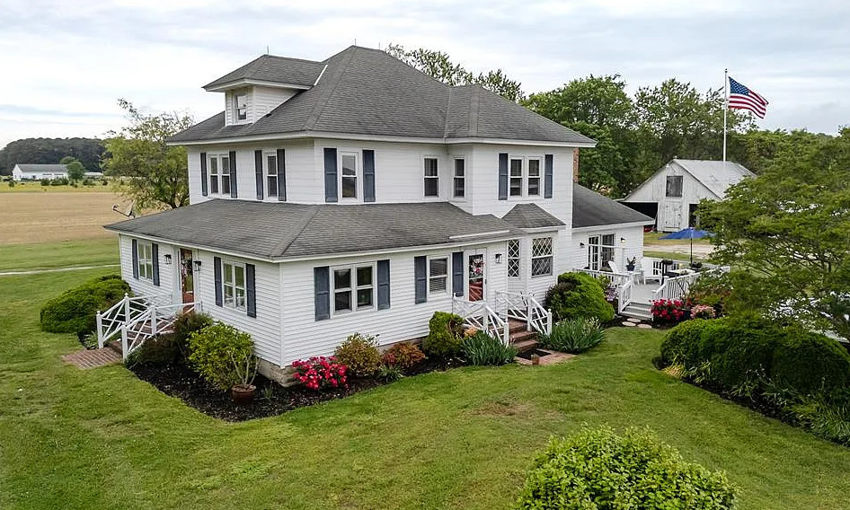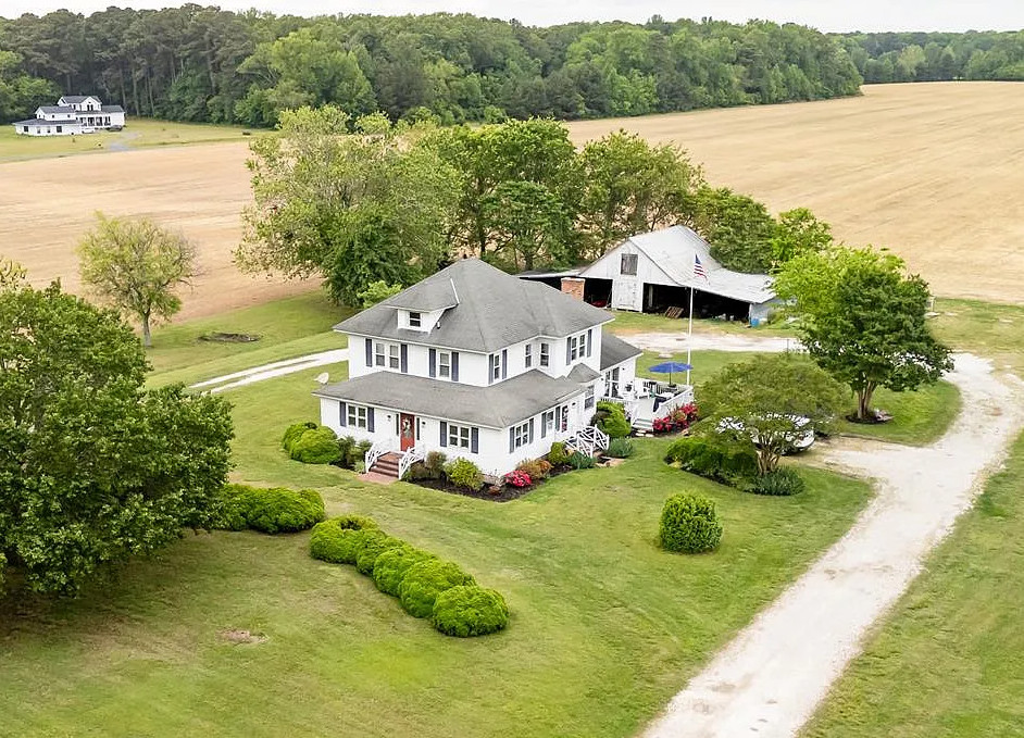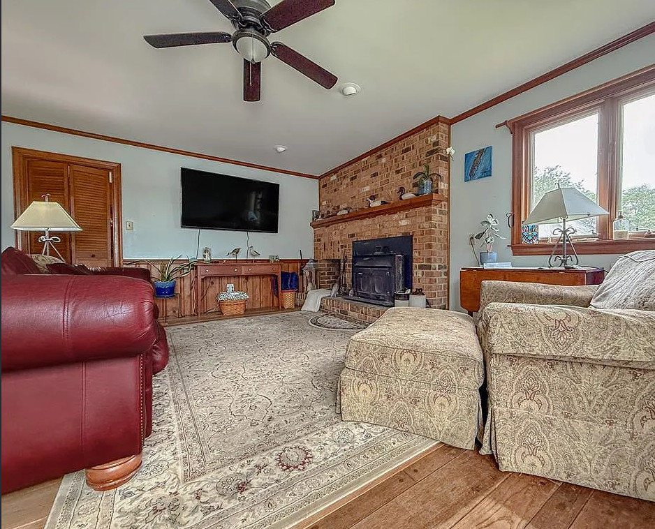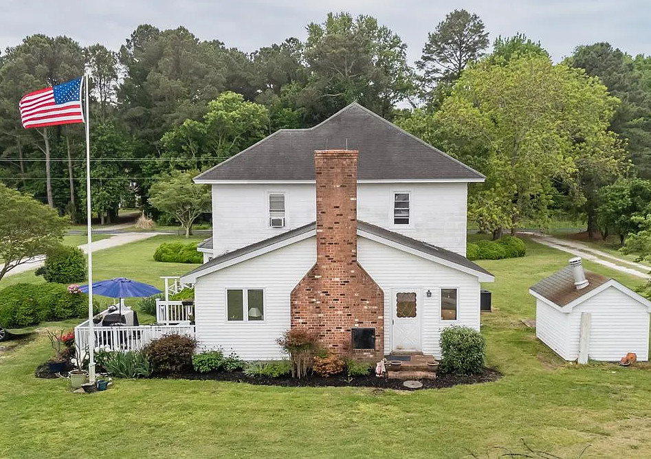 I love the blue bathroom! Big kitchen in this house! The home was built in 1900. It is located on one acre in Machipongo, Virginia. The house features a large back deck, wood floors, brick fireplace, crown moulding, spacious kitchen, chair rails, built-in bookshelves and bay windows. There is a shed with a lean to. Three bedrooms, two bathrooms and 2,664 square feet. $359,000