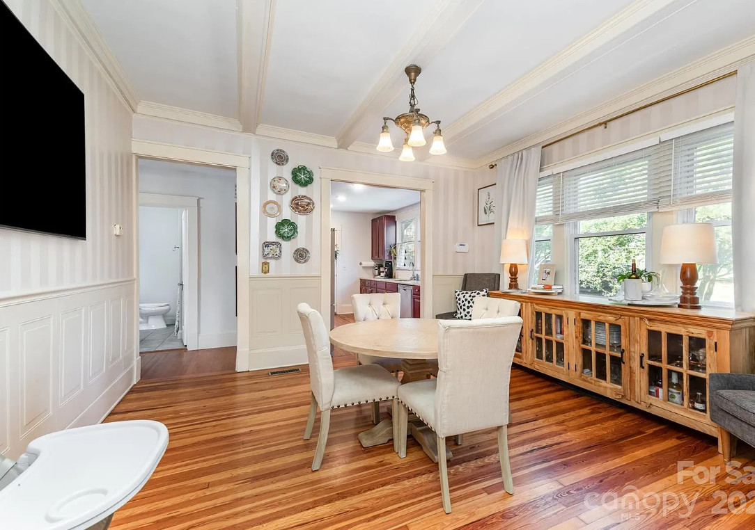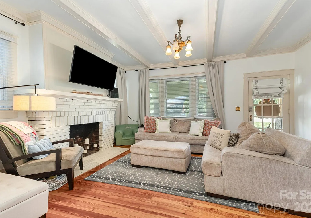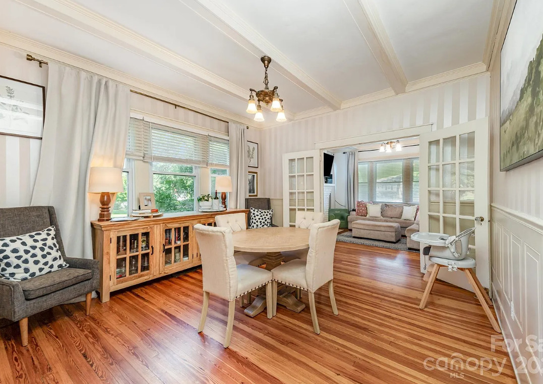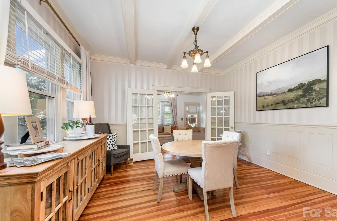 This house has a pretty interior! The house was built in 1920. It is located on .52 acre in Gastonia, North Carolina. The house features a covered front porch, wood floors, exposed ceiling beams, vintage light fixtures, a brick fireplace, crown moulding, french doors, wainscoting and an updated kitchen. There is a fenced in backyard with a covered patio. Three bedrooms, two bathrooms and 1,480 square feet. $315,000