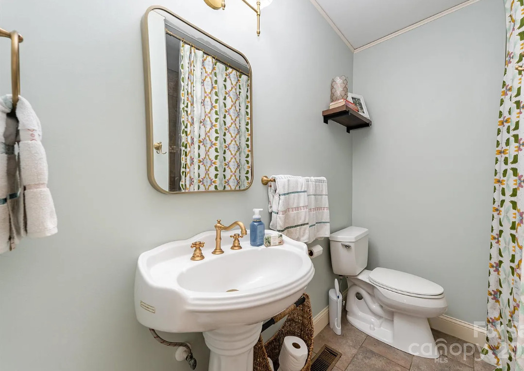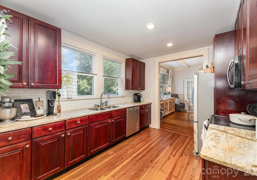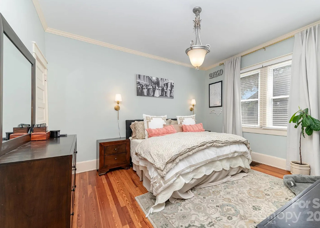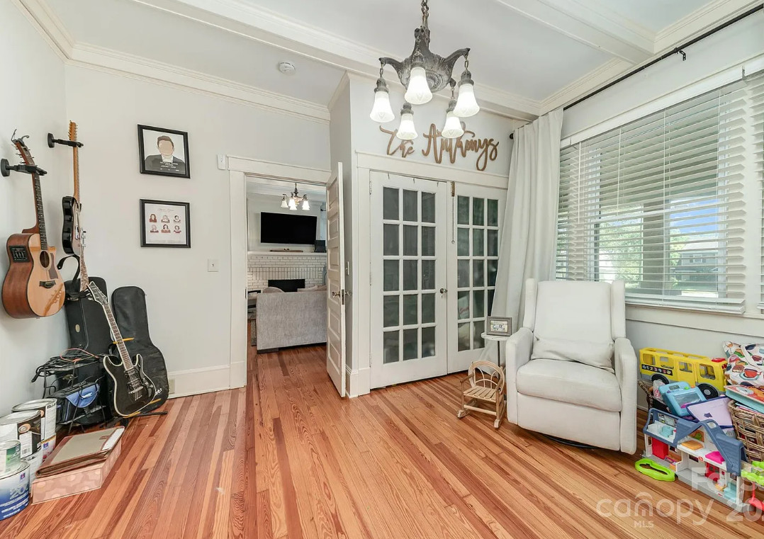 This house has a pretty interior! The house was built in 1920. It is located on .52 acre in Gastonia, North Carolina. The house features a covered front porch, wood floors, exposed ceiling beams, vintage light fixtures, a brick fireplace, crown moulding, french doors, wainscoting and an updated kitchen. There is a fenced in backyard with a covered patio. Three bedrooms, two bathrooms and 1,480 square feet. $315,000