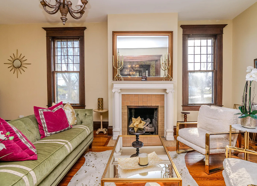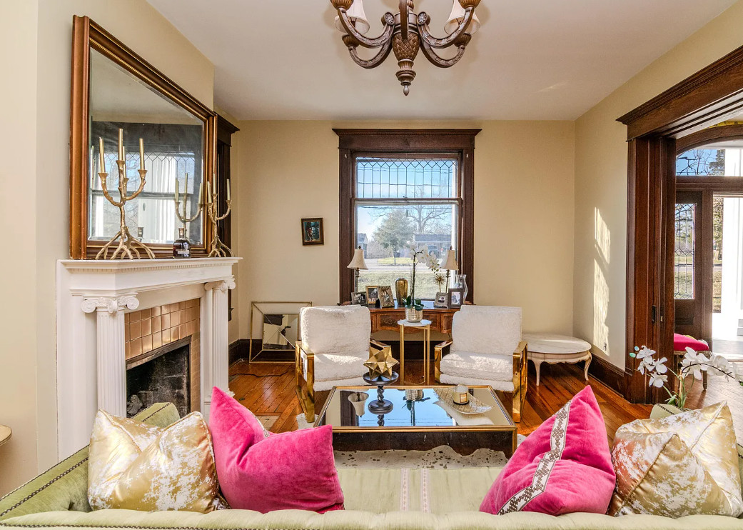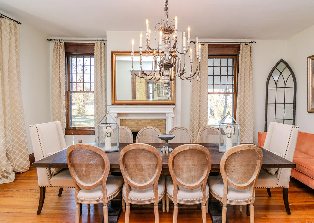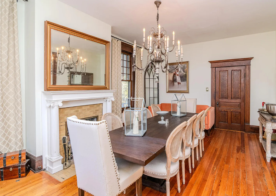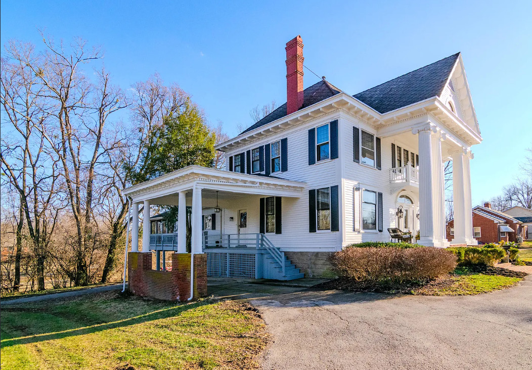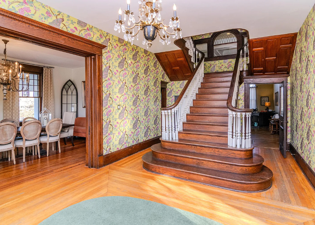 This house has a pretty staircase! Love the porte cochere. They have a build date of 1920. Seems a tad older to me, like 1905-1910. It is located on .9 acre in Winchester, Kentucky. The house features a porte cochere, a covered porch, pocket doors, grand staircase, baseboards, beautiful chandelier, updated bathrooms, crown moulding and an updated kitchen. This house needs a floor plan. Curious about the kitchen staircase. Four bedrooms, five bathrooms and 4,374 square feet. $589,900
