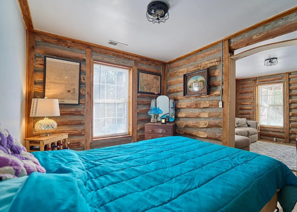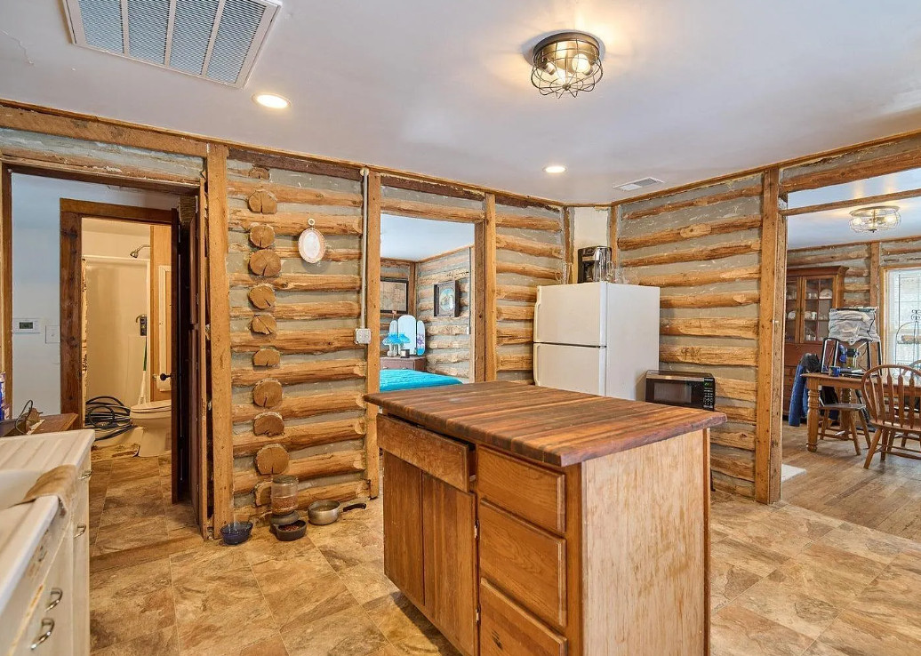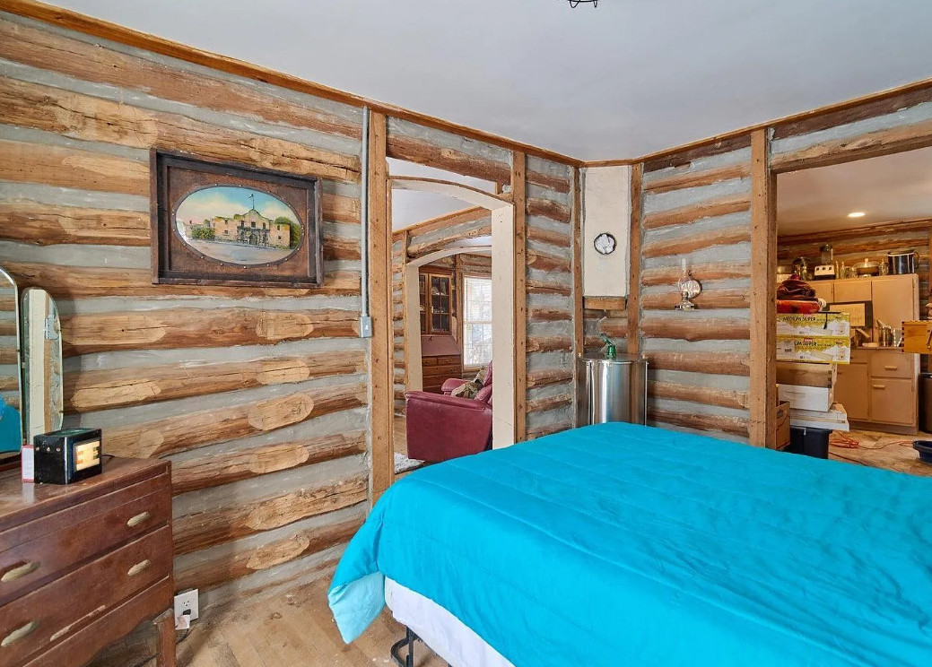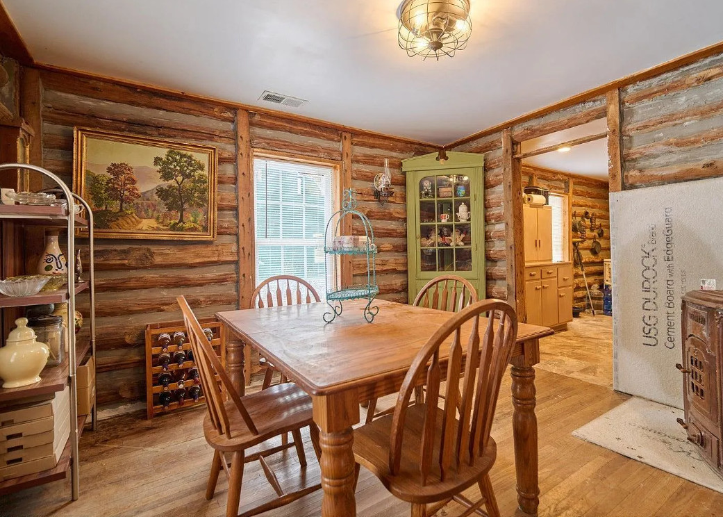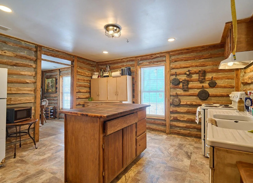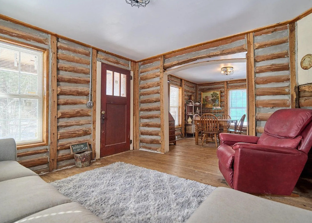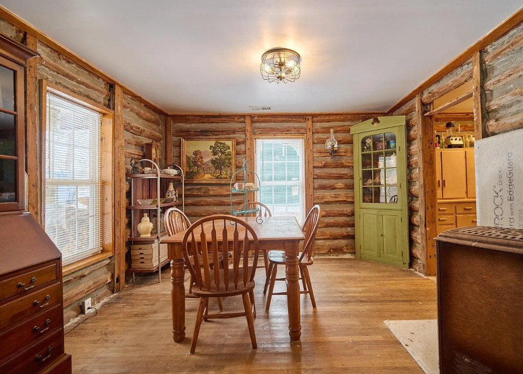 This has a nice interior! Nice acreage too! The house was built in 1908. It is located on 13 acres in Williford, Arkansas. The house features a covered front porch, wood floors, log walls, corner cabinet and crown moulding. There are a couple of outbuildings and a carport for an RV. Two bedrooms, one bathroom and 1,008 square feet. $164,900