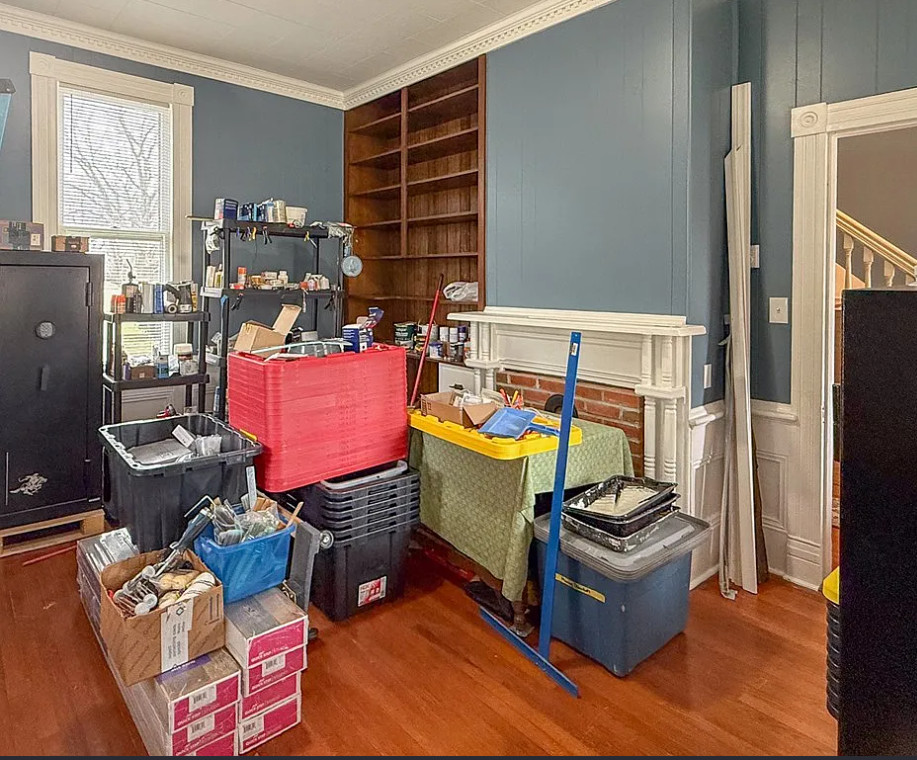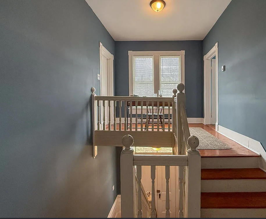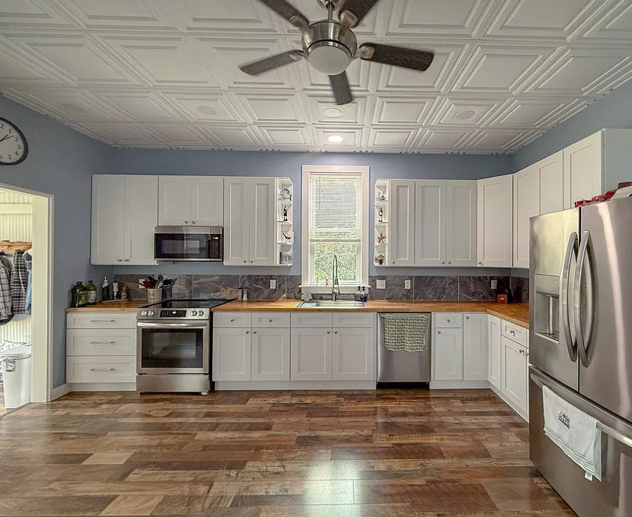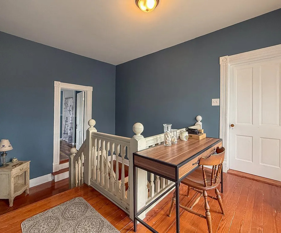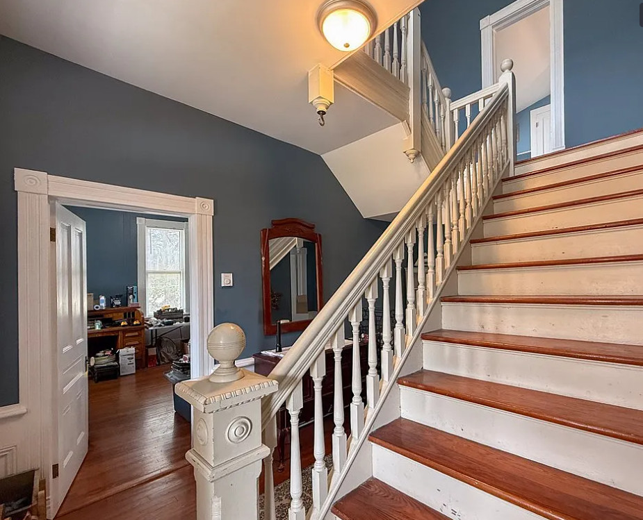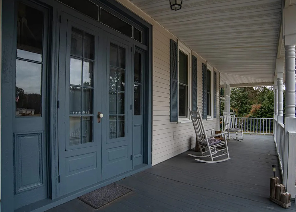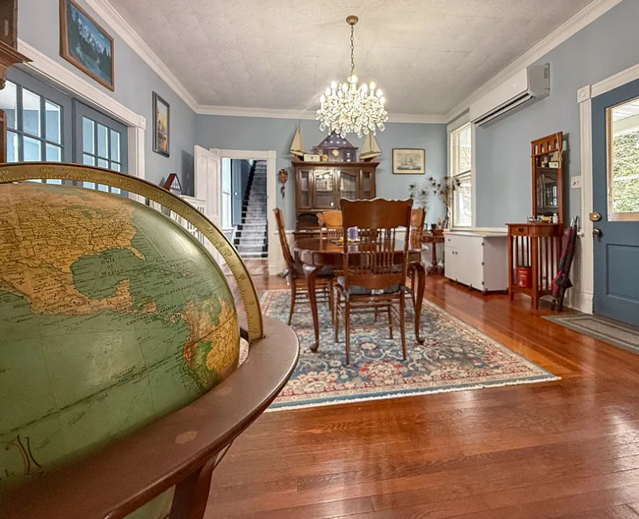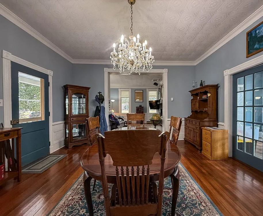 This house has such a pretty setting! The house was built in 1903. It is located on 2.37 acres in Machipongo, Virginia. The house features a large covered front porch, circular driveway, large back deck, some wood floors, updated kitchen, pressed tin, crown moulding, crystal chandelier, french doors, built-in bookshelves and a nice staircase. There is a detached garage on the property. Three bedrooms, three bathrooms and 3,224 square feet. $359,000