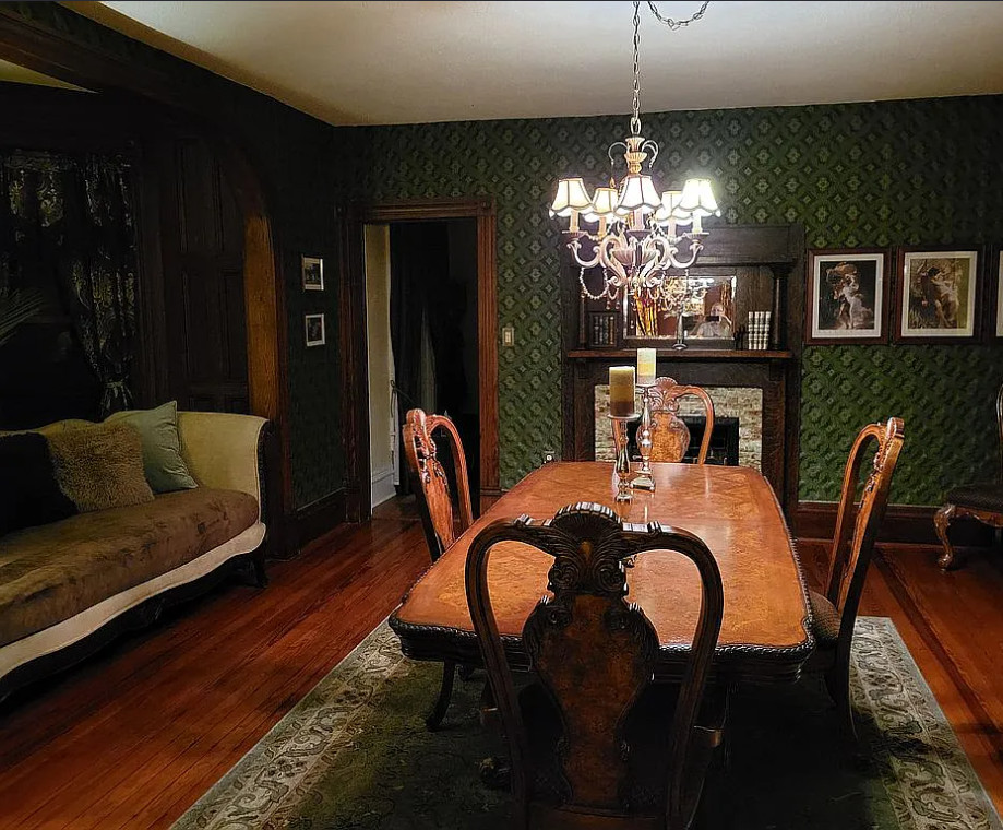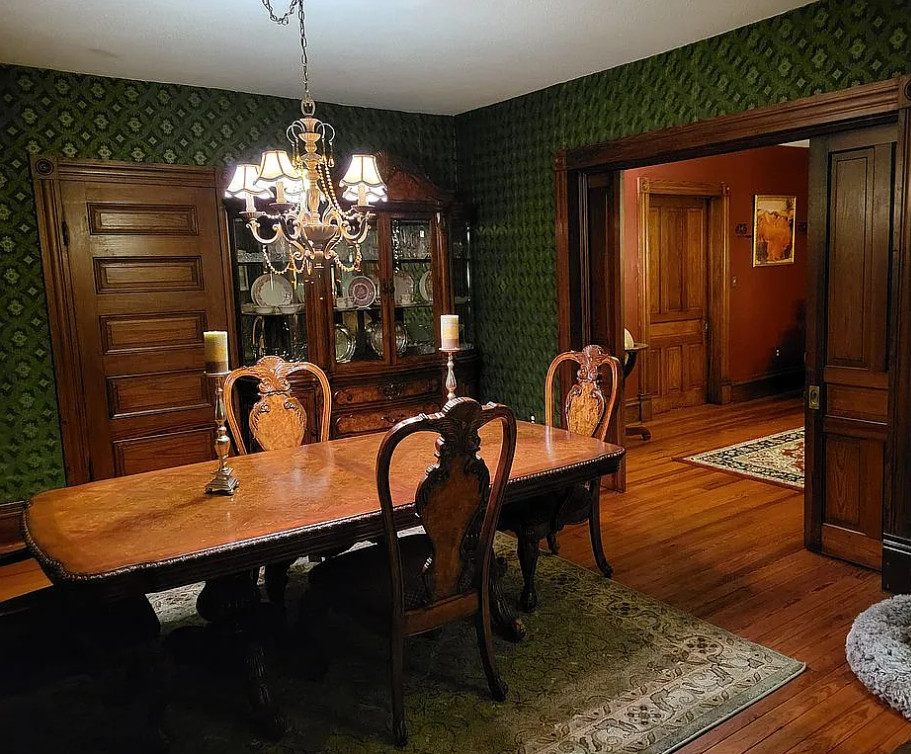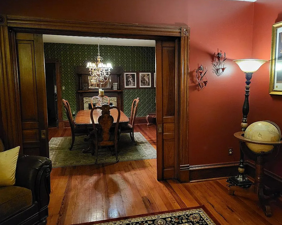 Love the pocket doors! This house has original details! The house was built in 1904. It is located on five acres in South Hill, Virginia. The house features a covered front porch, wood floors, pretty mamtels, wide baseboards, pocket doors, stained glass and vintage light fixtures. Three bedrooms, three bathrooms and 2,726 square feet. $300,000