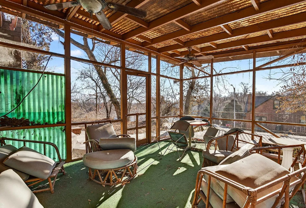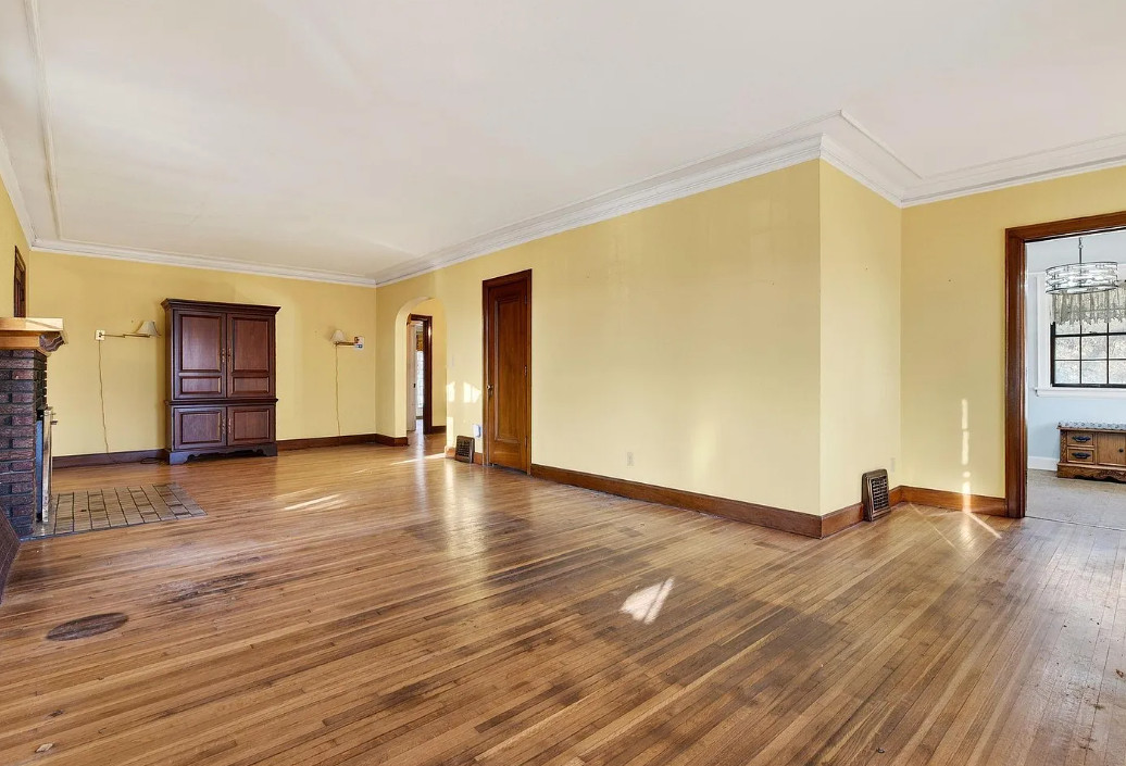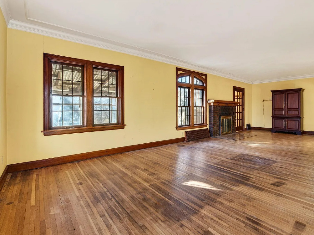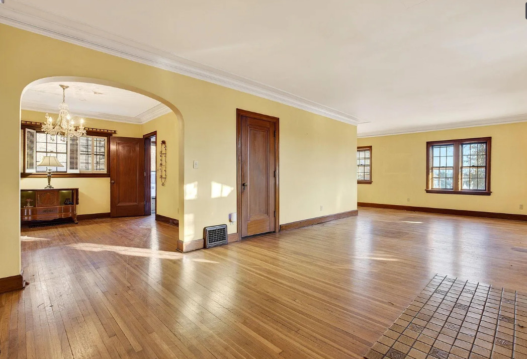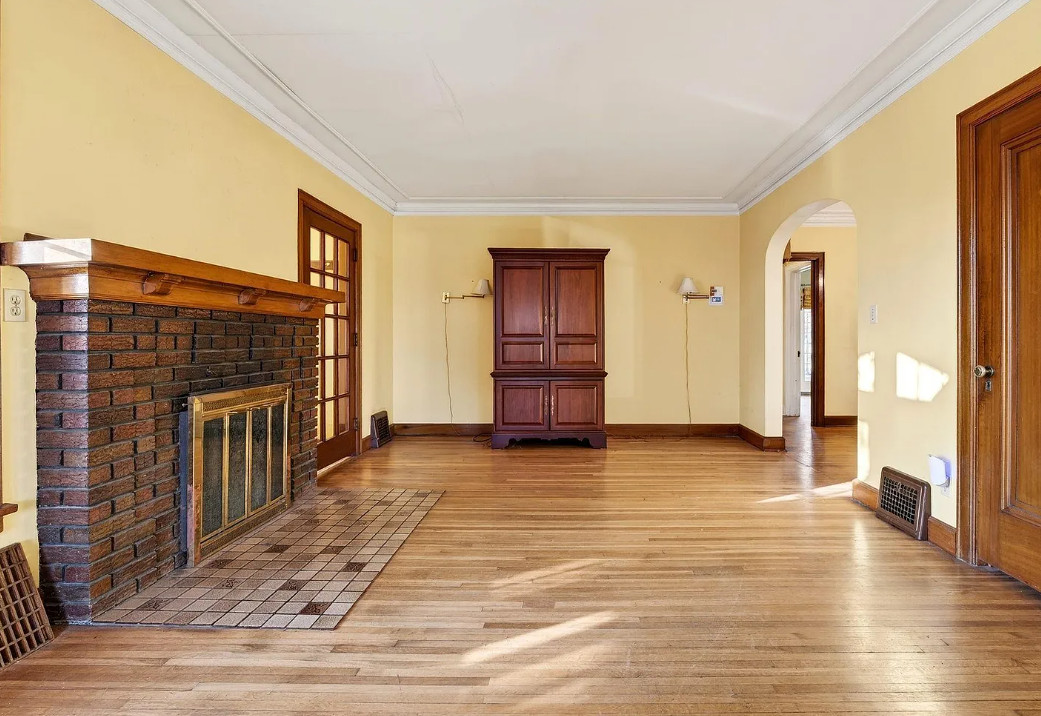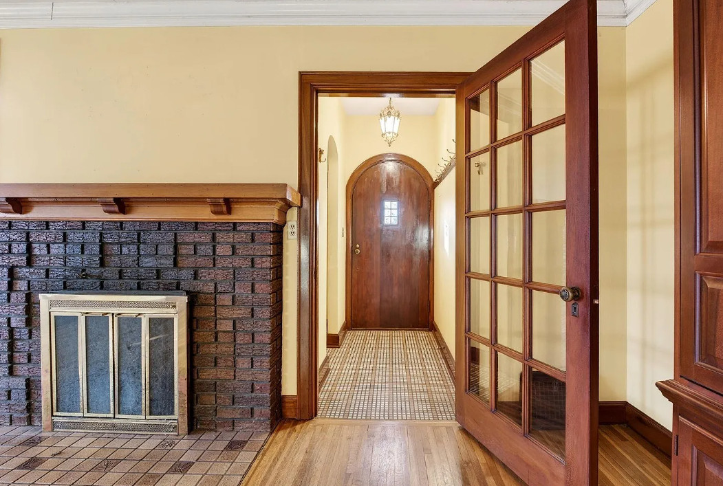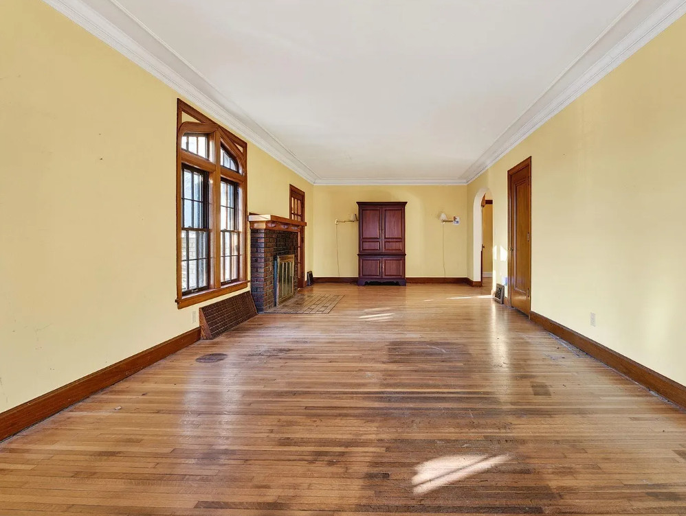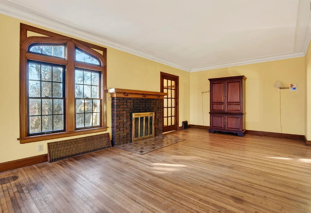 There is shuffleboard in the basement! This house has some amazing details! The house was built in 1931. It is located on .37 acre in Omaha, Nebraska. The house features a screened in front porch, arched front door, wood floors, wood flooring, crown moulding, brick fireplace, baseboards, arched entryway, original kitchen cabinets and a crystal chandelier. There is a large basement with shuffleboard. The property has an in-ground pool and a concrete pond. Four bedrooms, three bathrooms and 2,212 square feet. $258,000