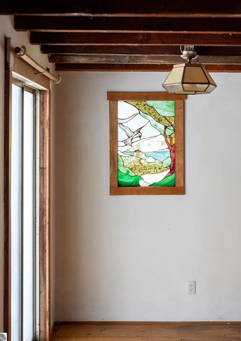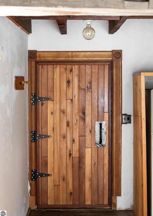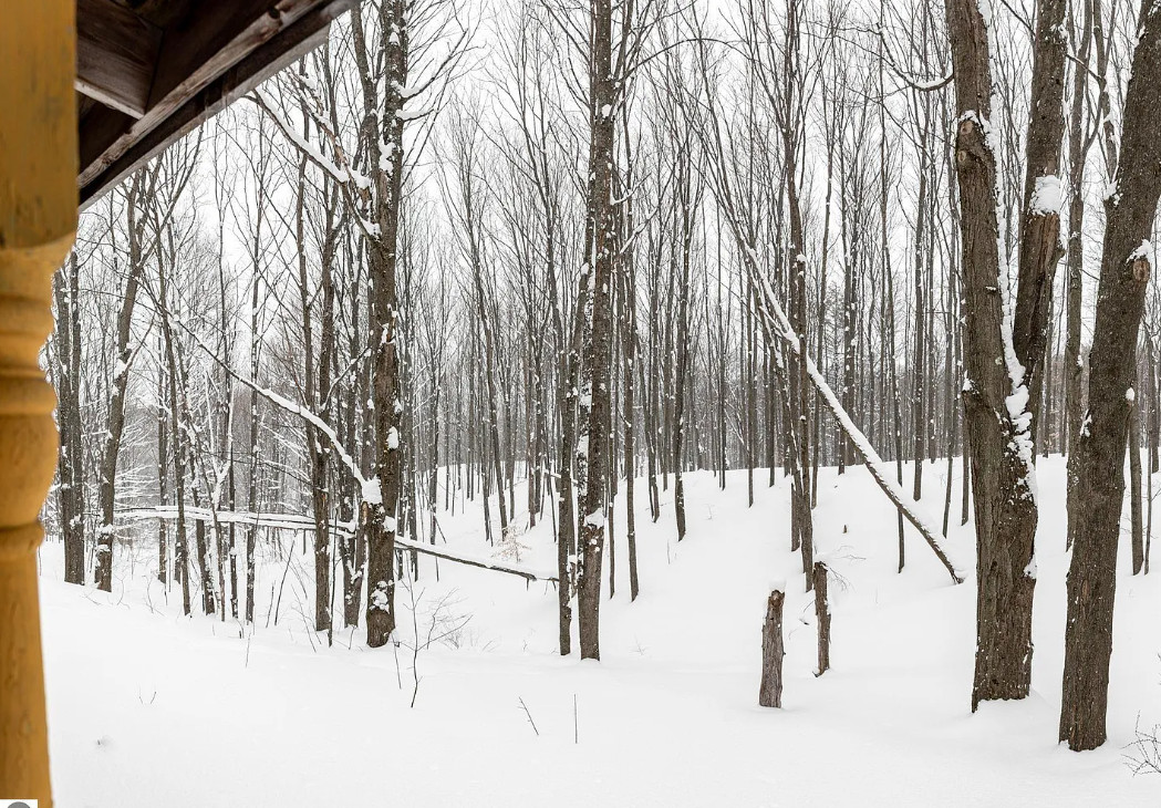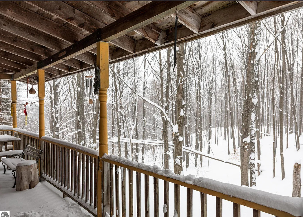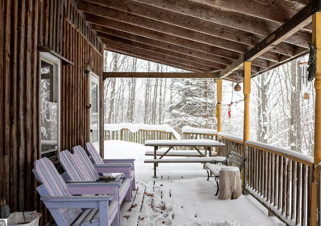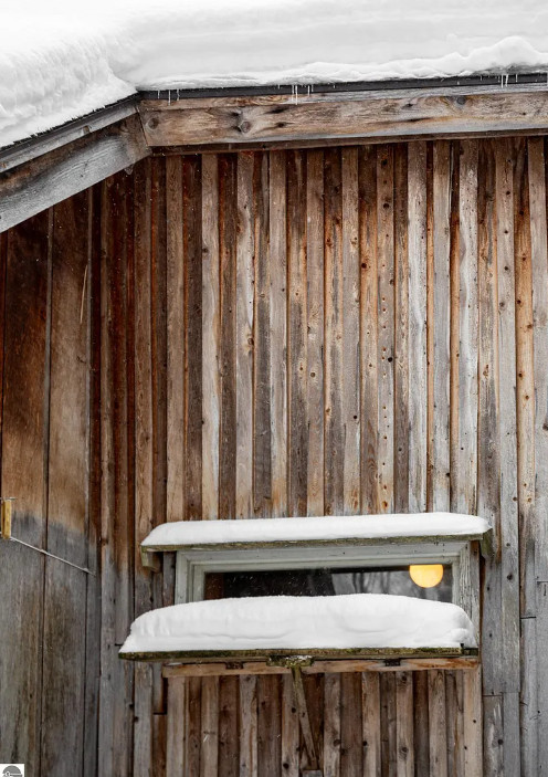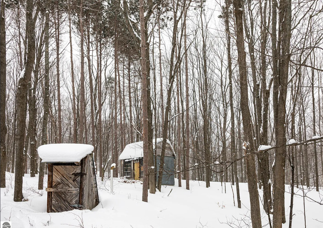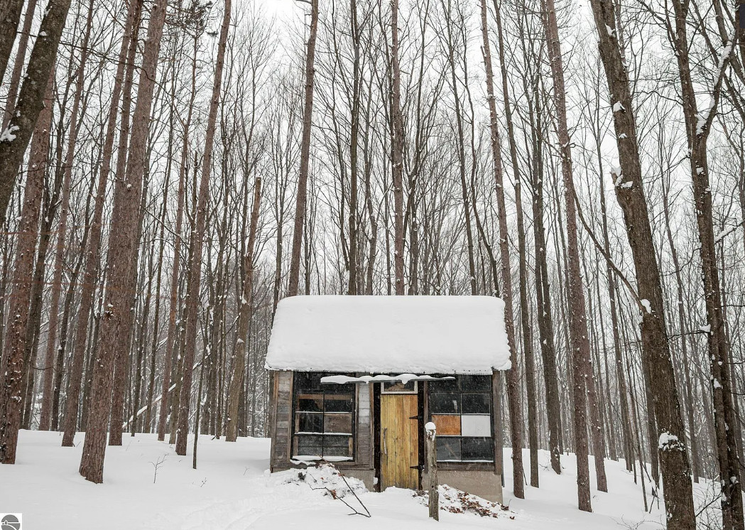 The beauty of a vision and a really big flatbed truck moved this circa 1900’s granary building from a nearby farm to the growing Jackson family’s 20 acres in central Leelanau County. A community then came together. Good friends, & sweat equity tag teamed to build this funky, eclectic, cottage on nearly 5 acres in the woods, where kids explored and roamed around the forest, parents gardened & created their art. Family memories were created. Exposed hand hewn post & beam frame is a testament to longevity, maple floors to durability, & the artistic use of wood, steel, & masonry to craft. Main level primary bedroom, two bedrooms on the upper level share the only bathroom. Time to create your own vision with imagination, a budget, and money well spent, to make this unique abode your special home. Large 9’x28′ covered porch will be a welcomed spot for sipping coffee, enjoying the vast views of peaceful, rolling hills. A chicken coop adorned with repurposed building materials could be resurrected for producing hen fruit, maybe a studio, or a she shed. The added underground root cellar might serve in tandem as a place to keep precious wine. The 24×30 detached garage/workshop has lots of utility, but will need some attention. Certainly this gem is a fixer upper, but well worth the effort, to reawaken and create your own memories of kids sledding and tree climbing. A private driveway is shared with 2 other residences. An agreement is in place to share in snow removal/maintenance costs at this point, something more formal is possible. Point-of-sale waiver for a water analysis may be likely as the supply lines have been compromised due to improper winterization. Septic was pumped in 2020, and has not had much use since. Yard art and some items from the work shop/garage to be removed, but may need to happen after a sale. This is a one-of-a-kind property, just waiting for a new and ambitious owner to maximize the potential of this beautiful property and magical home.