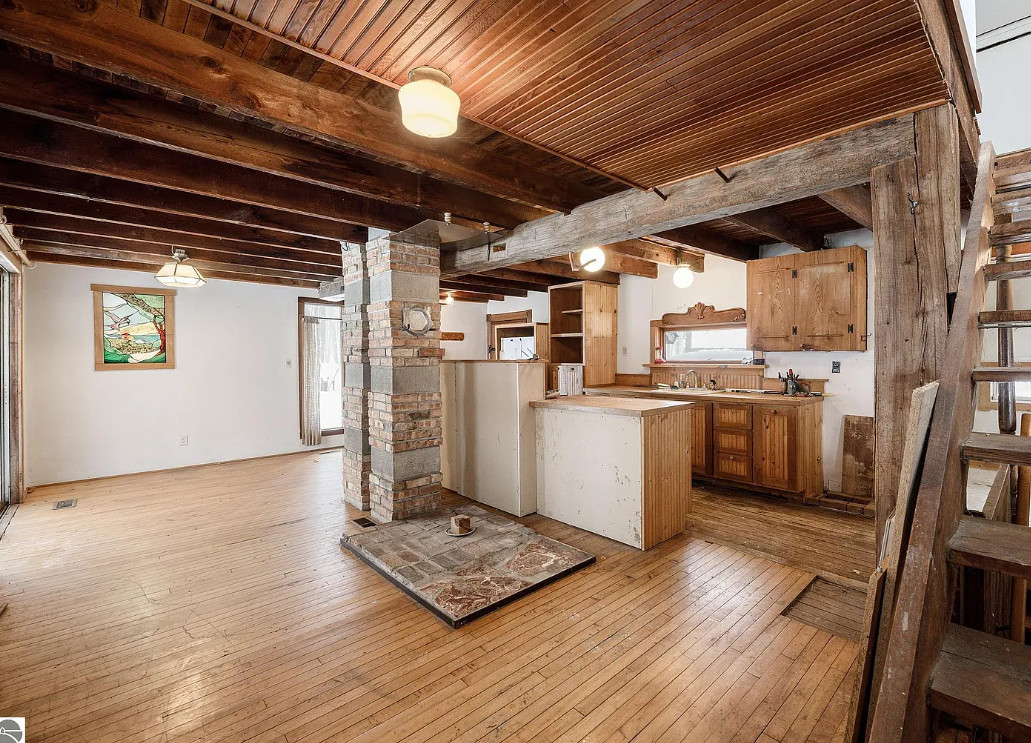 The doll in the basement is a bit odd! This house looks very secluded. Perfect getaway spot! The house was built in 1900. It is located on 4.86 acres in Cedar, Michigan. The house features a covered front porch, wood floors, exposed beams, exposed brick and knotty pine. The cabin needs work to be completed. There are a couple of outbuildings on the property. Three bedrooms, one bathroom and 1,320 square feet. $275,000