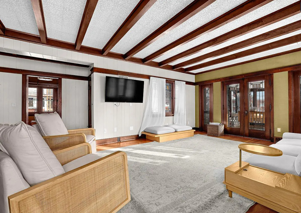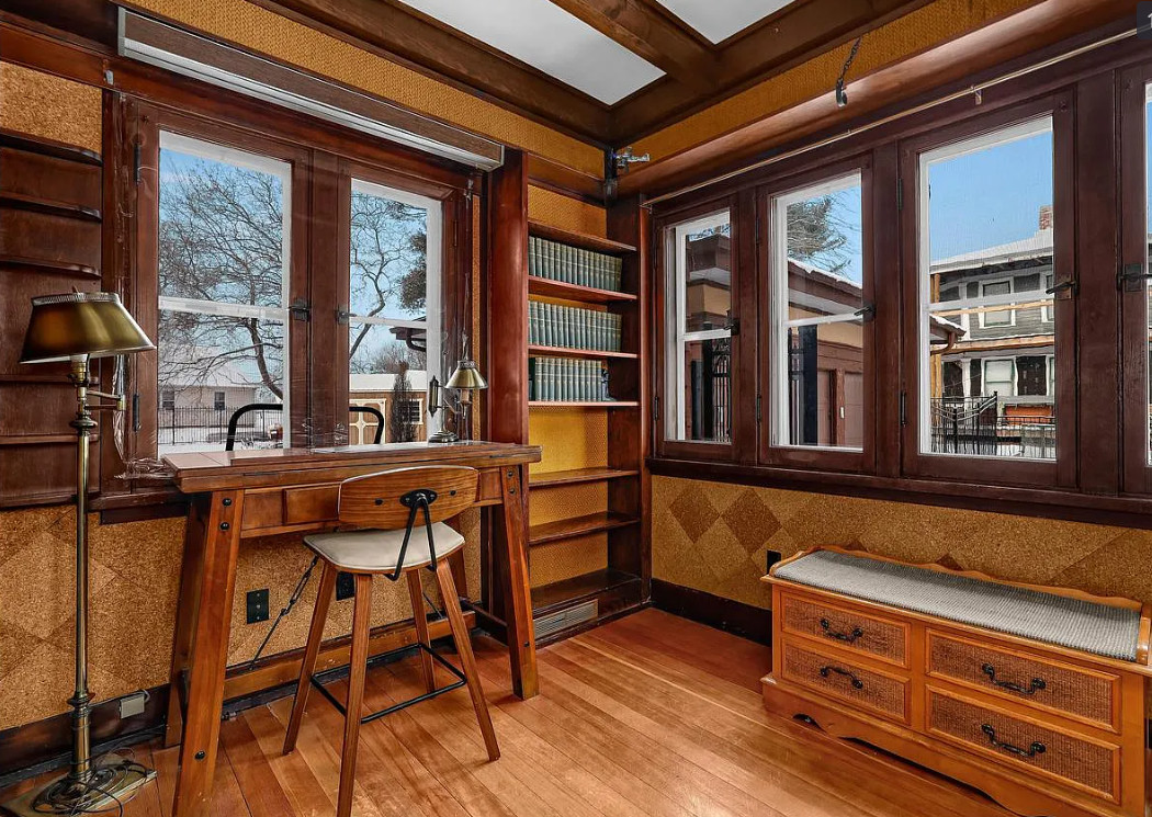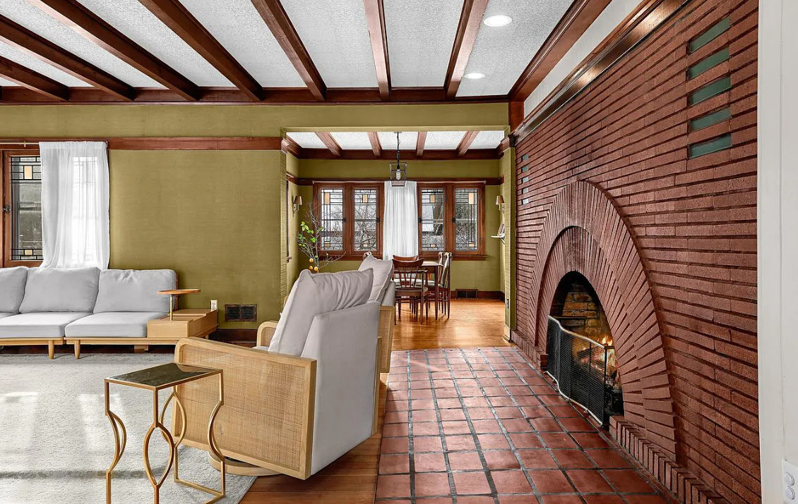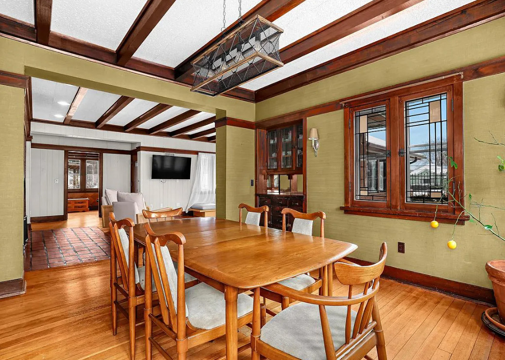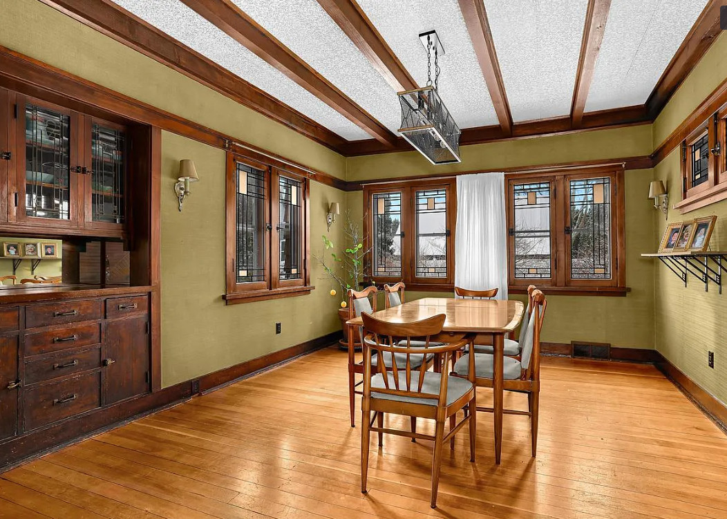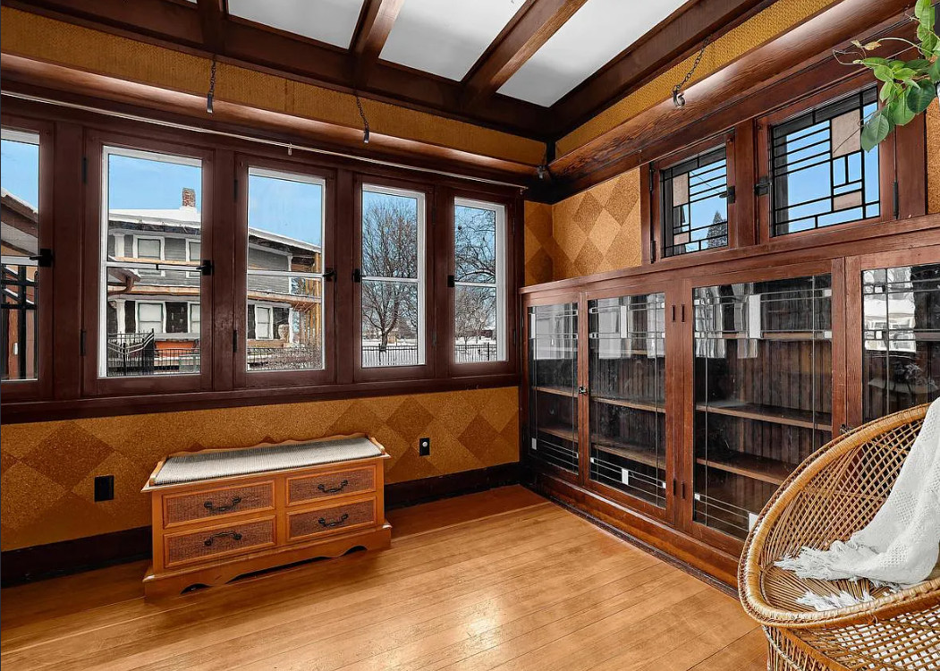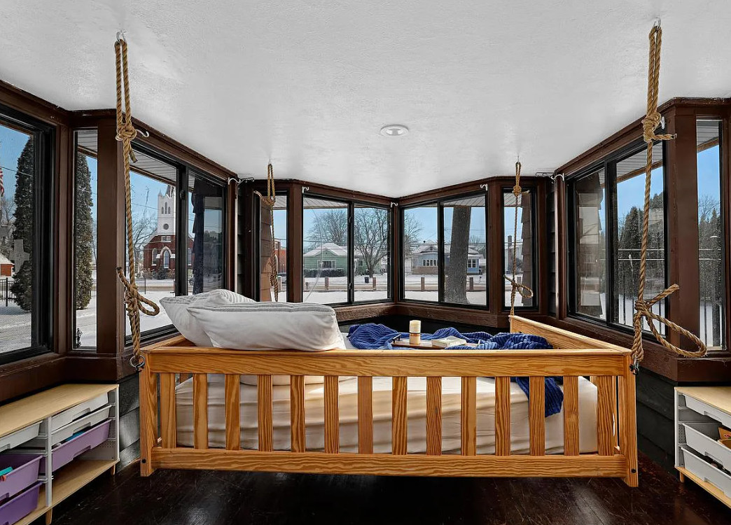 This is a pretty house! In love with the sunroom with the hanging bed! Known as the Percy Bentley House. It was built in 1913. It is located on .68 acre in West Salem, Wisconsin. The house features a lovely sunroom with hanging bed, wood floors, exposed beams, large brick fireplace, leaded glass, built-in china cabinet, updated kitchen and updated bathrooms. There is a detached two car garage. Three bedrooms, three bathrooms and 2,207 square feet. $399,900