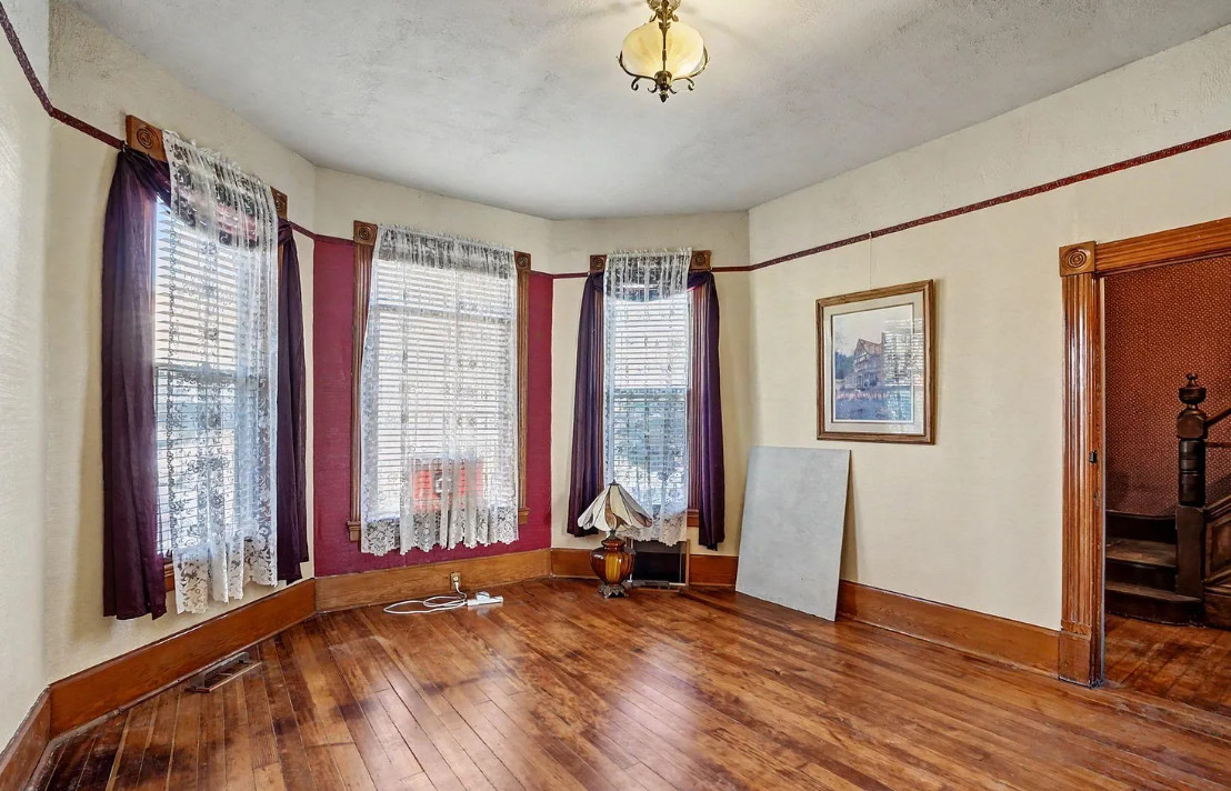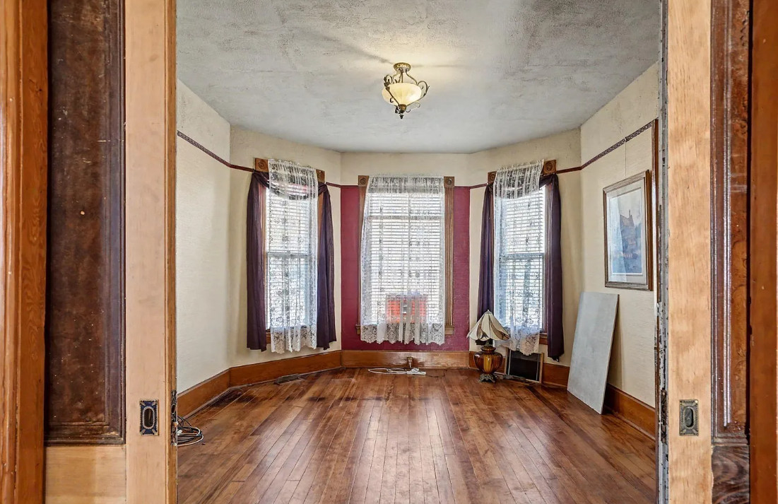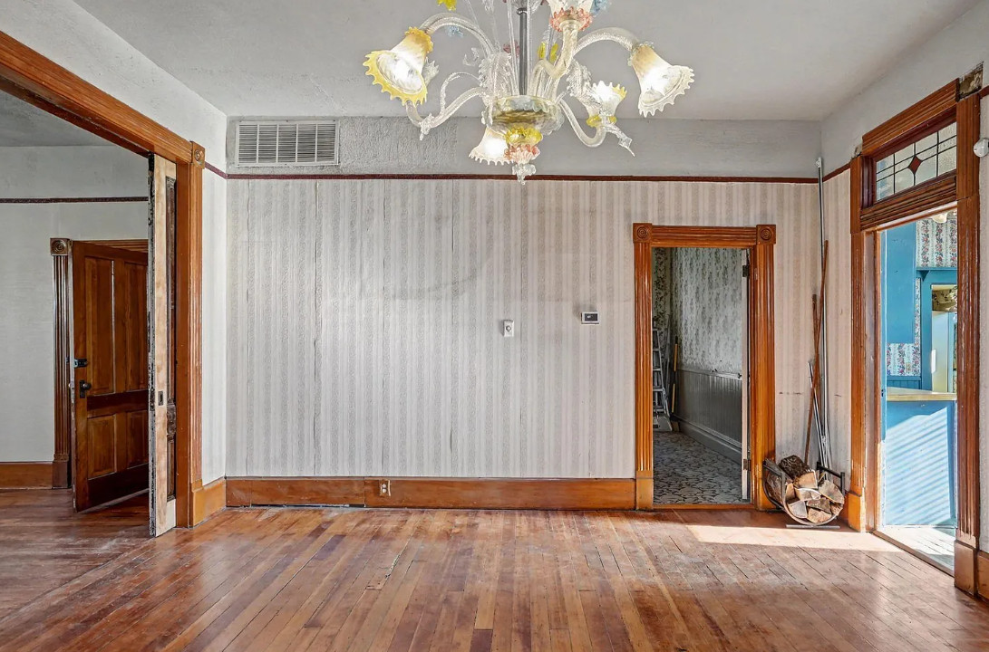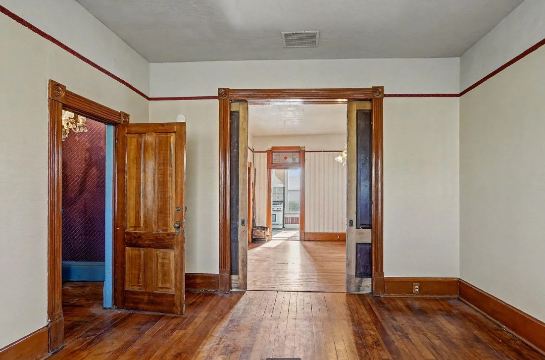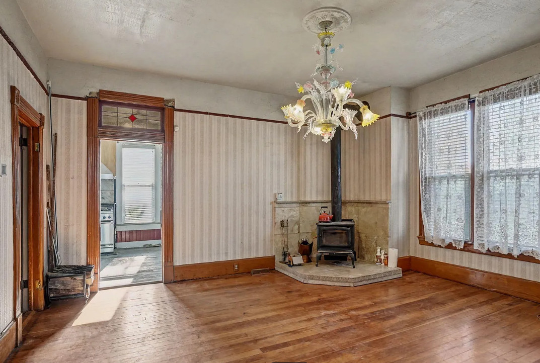 This has some nice details inside! It is known as the Beam House. It was built in 1878. It is located in Albany, Oregon. The house features wood floors, picture rails, baseboards, pretty chandelier, pocket doors, stained glass, built-in corner cabinet and wainscoting. Five bedrooms, one bathroom and 1,976 square feet. $279,000