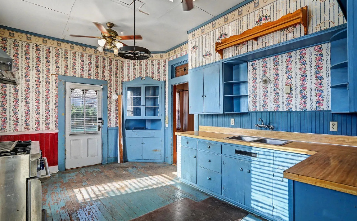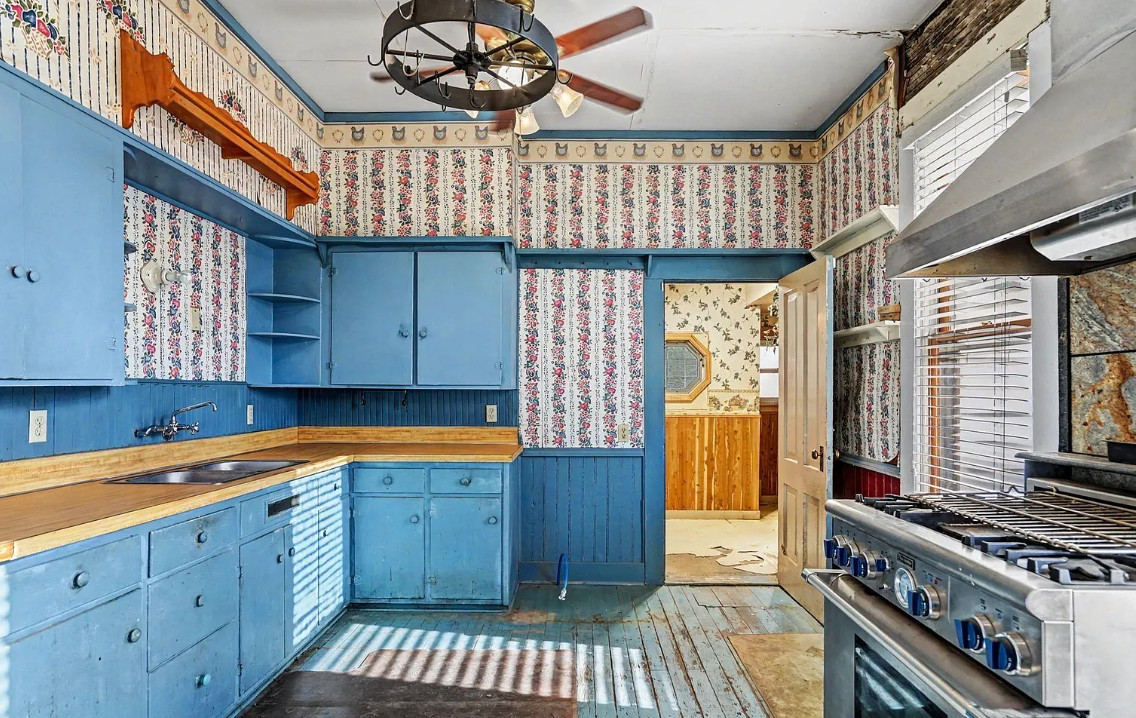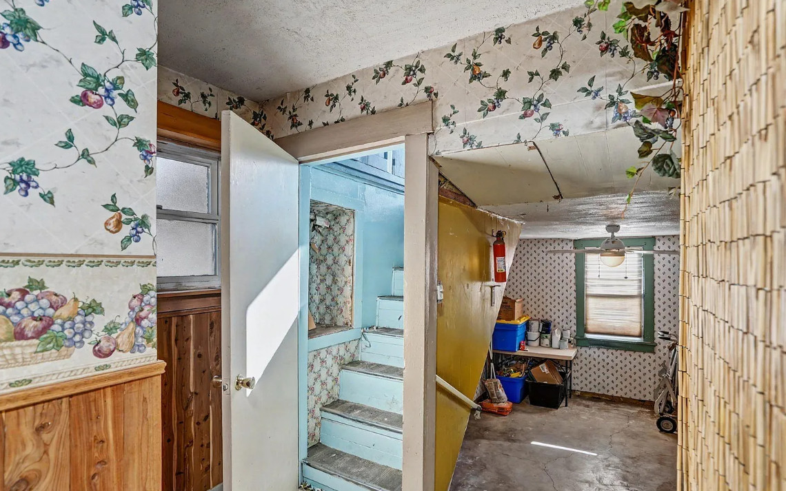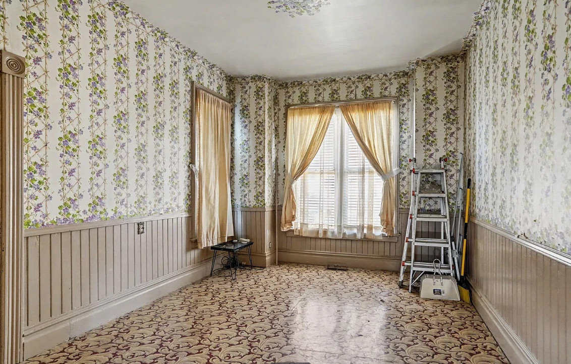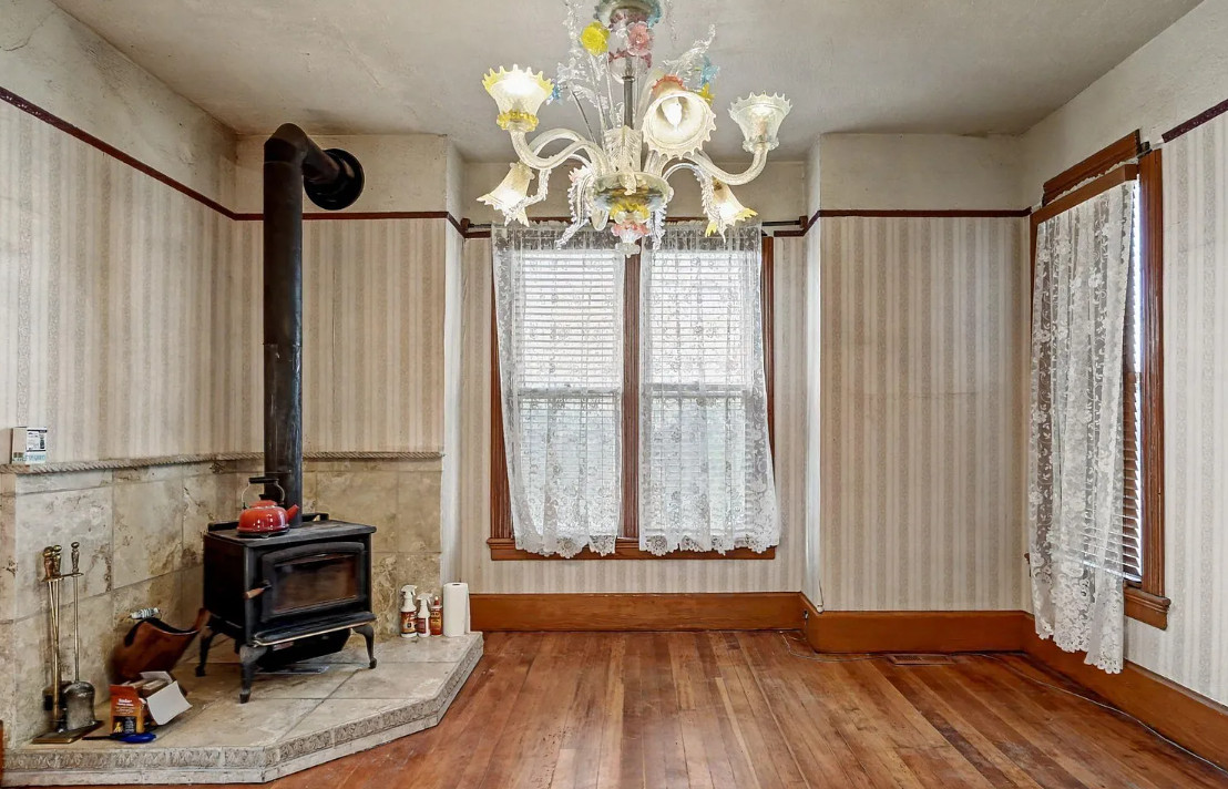 This has some nice details inside! It is known as the Beam House. It was built in 1878. It is located in Albany, Oregon. The house features wood floors, picture rails, baseboards, pretty chandelier, pocket doors, stained glass, built-in corner cabinet and wainscoting. Five bedrooms, one bathroom and 1,976 square feet. $279,000