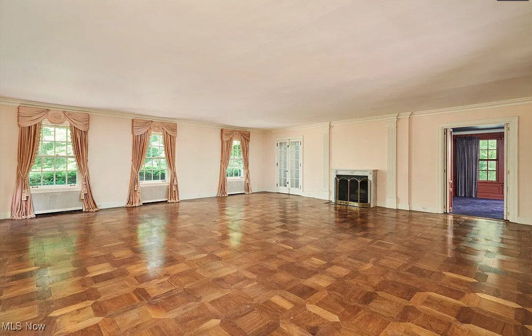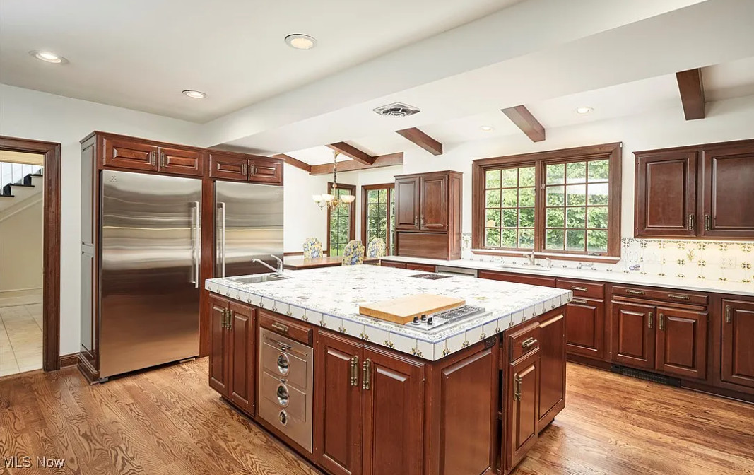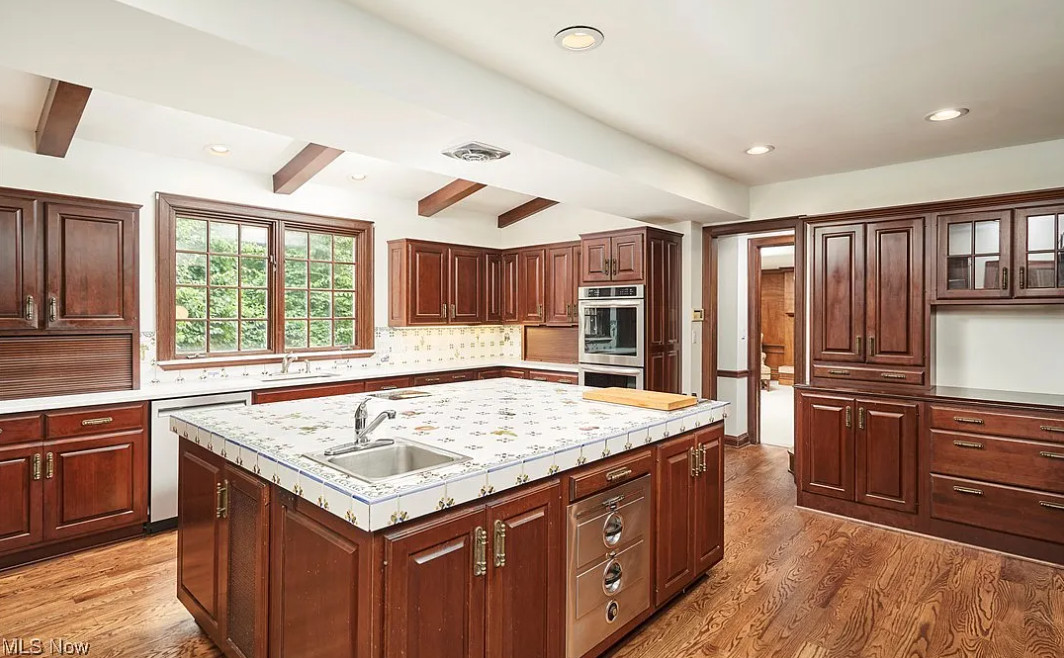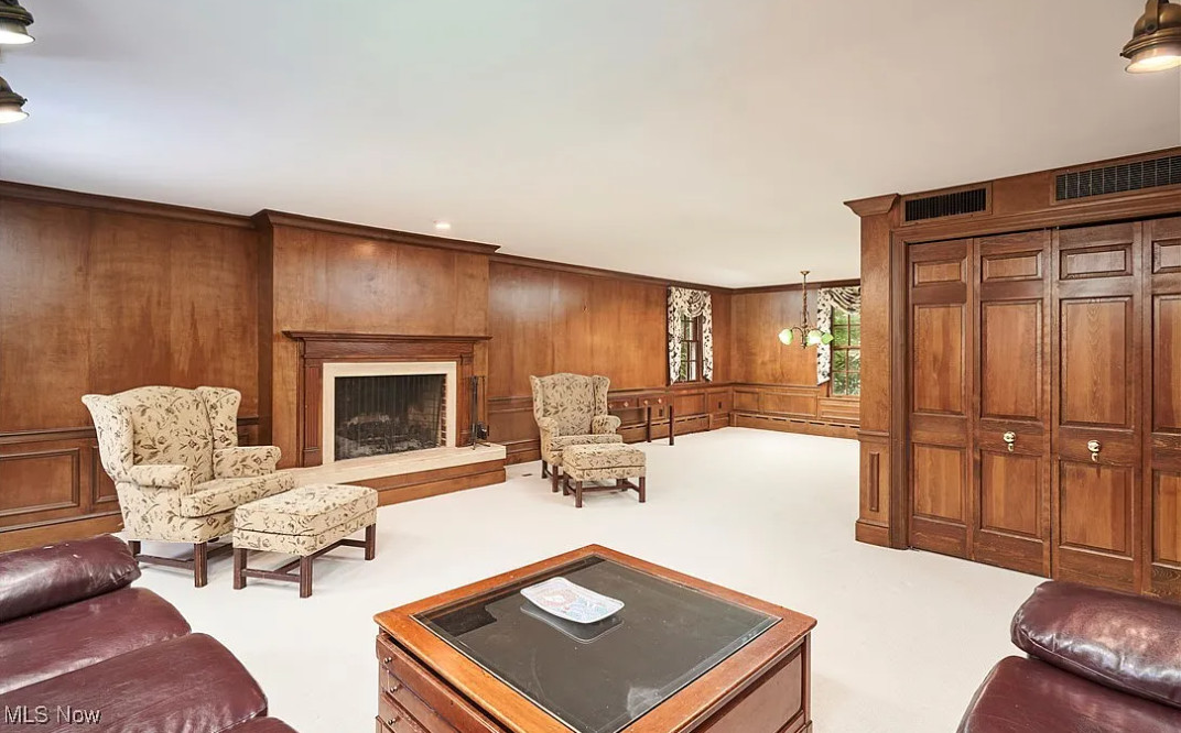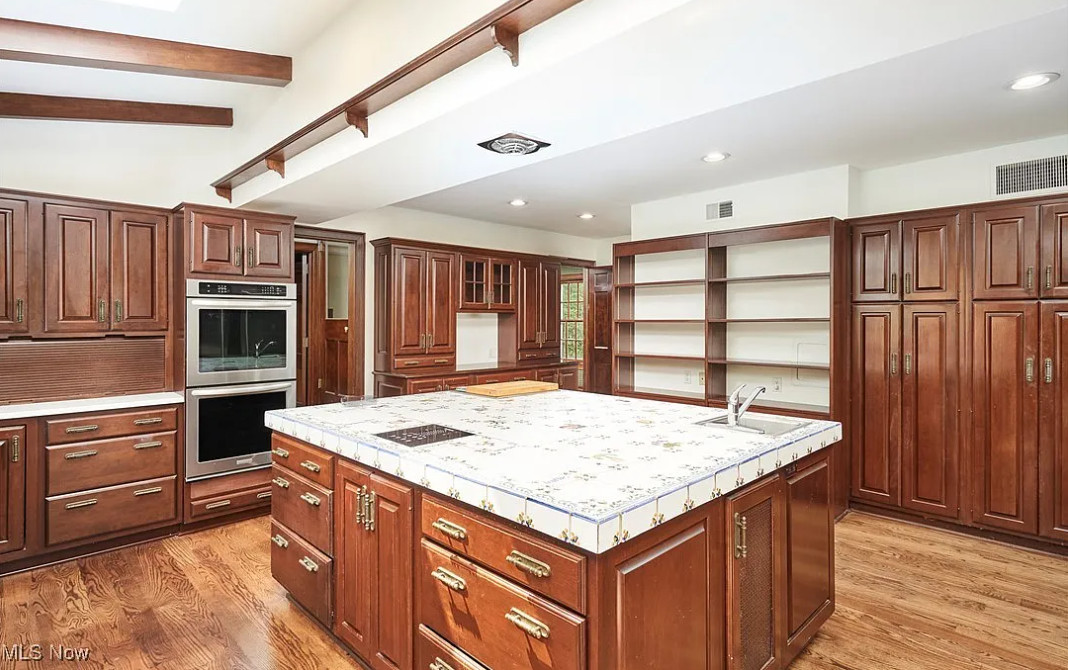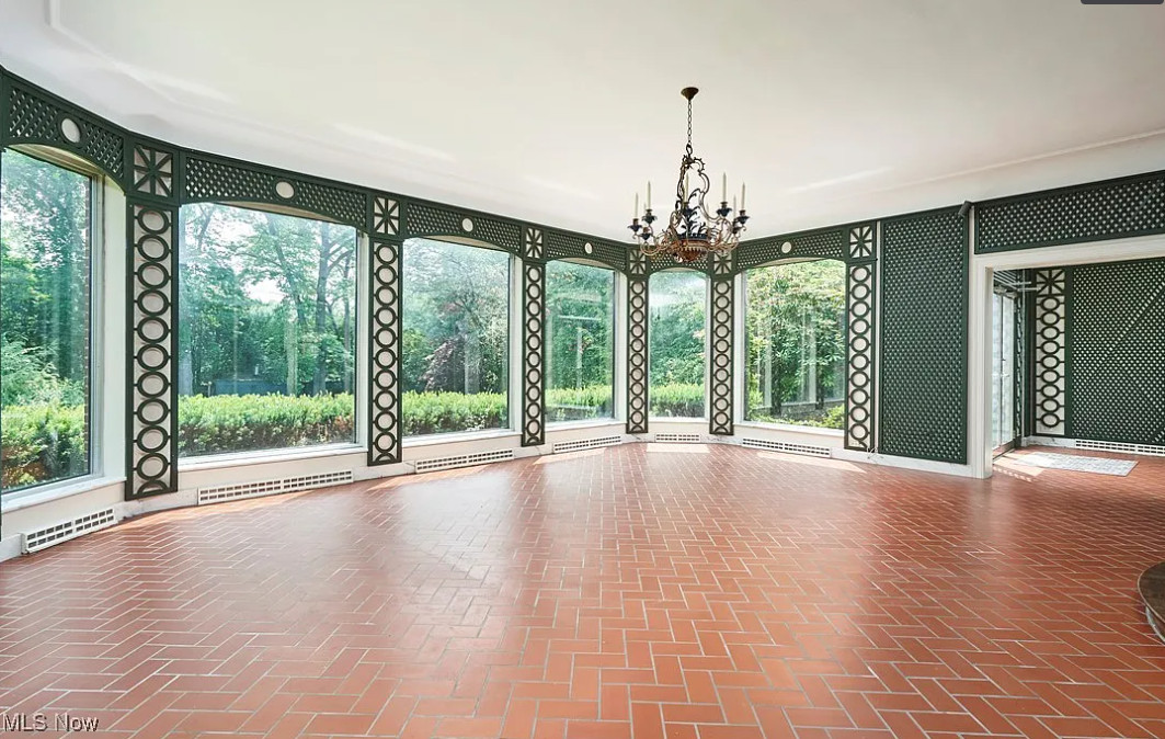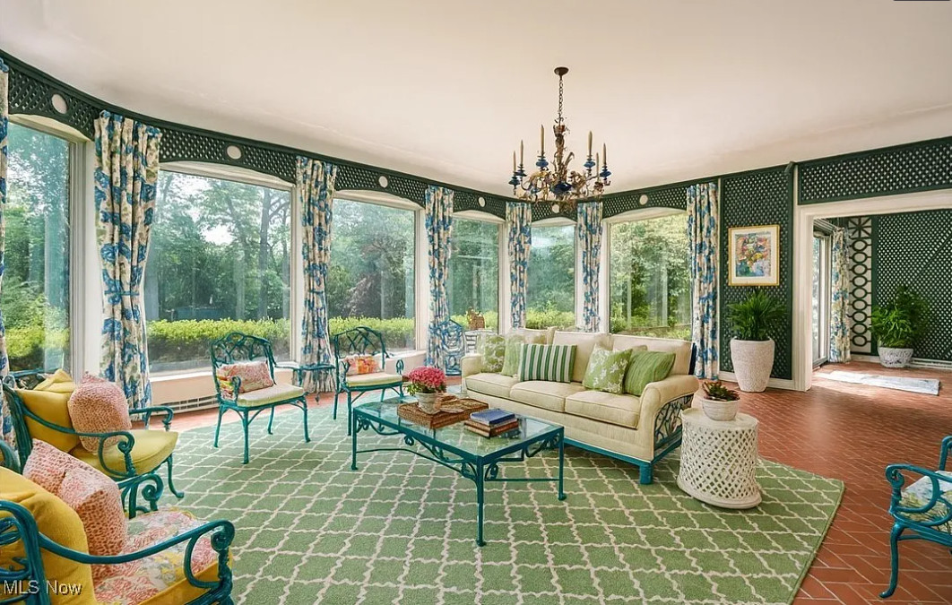 This sure is a lot of house for the money! I am in love with that sunroom! The house was built in 1928. It is located on 1.22 acres in Akron, Ohio. The house features a grand foyer, pretty staircase, wood floors, custom drapes, baseboards, crown moulding, beautiful sunroom with vintage chandelier, really spacious kitchen, wainscoting, office with built-in bookshelves and a finished basement. The property has a circular drive, park=like setting, an attached garage and a large pool. This is a big house! Six bedrooms, six bathrooms and 6,110 square feet. $625,000