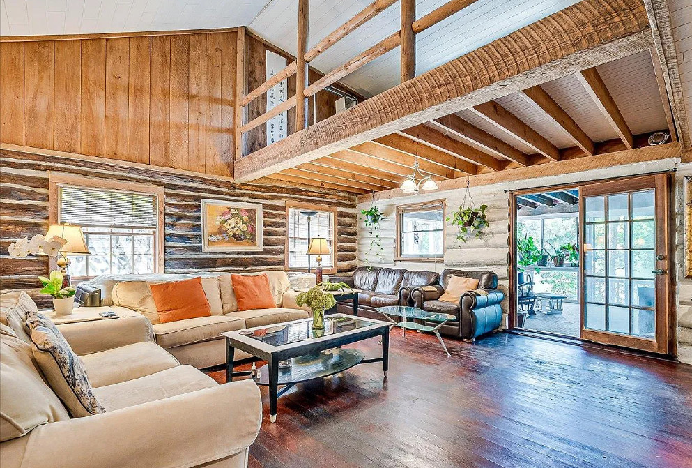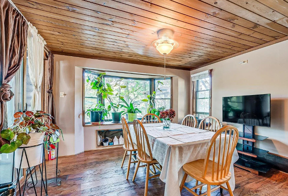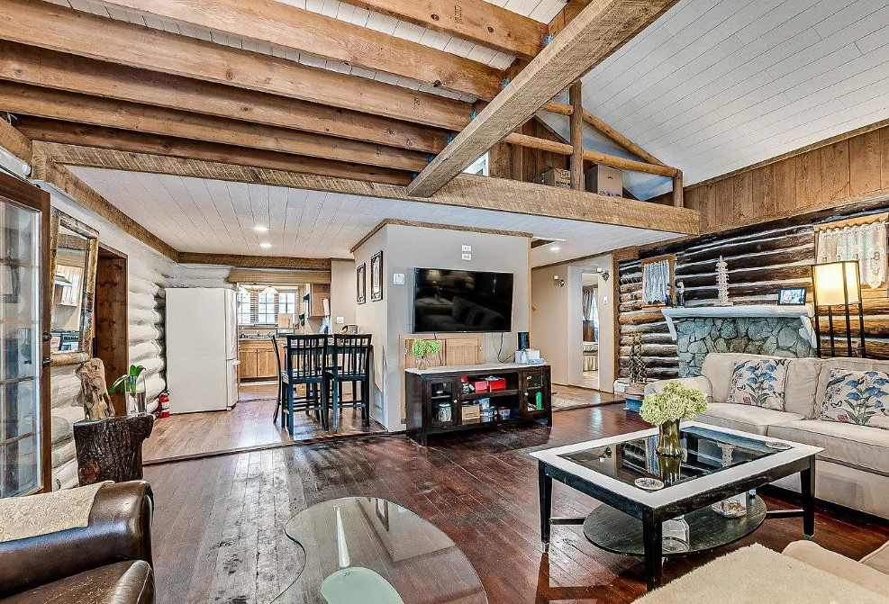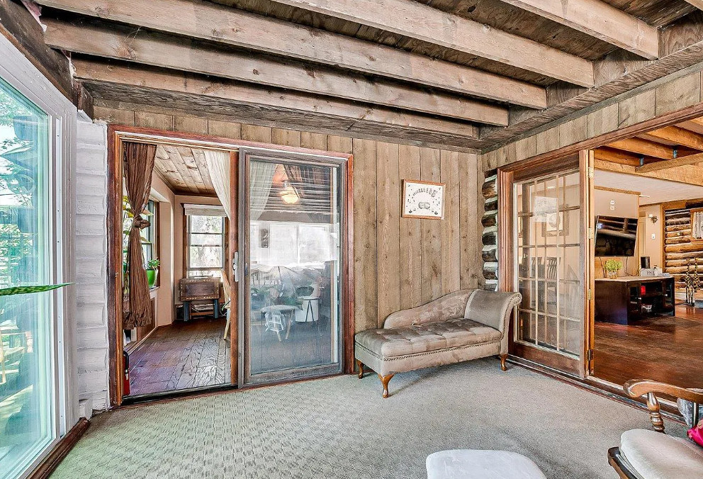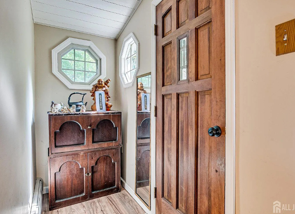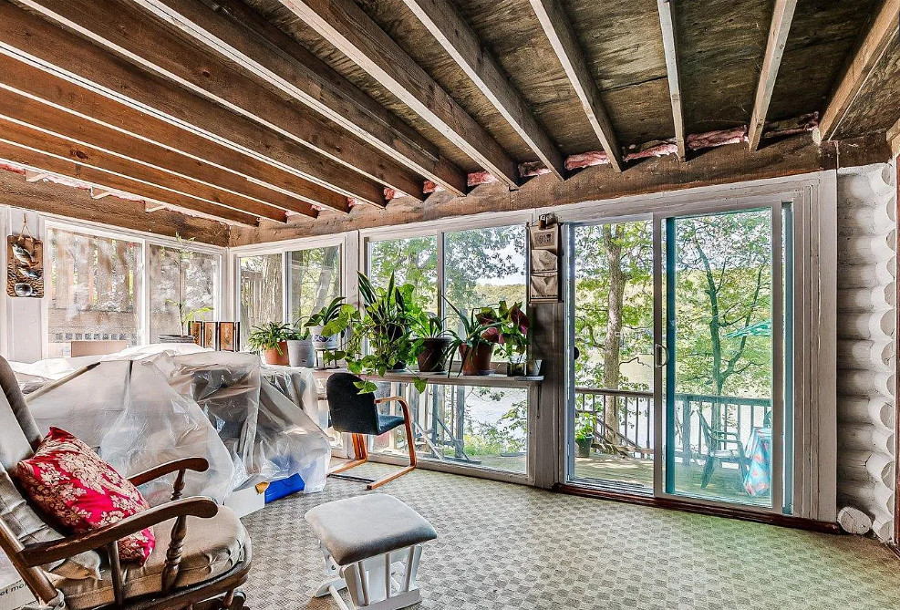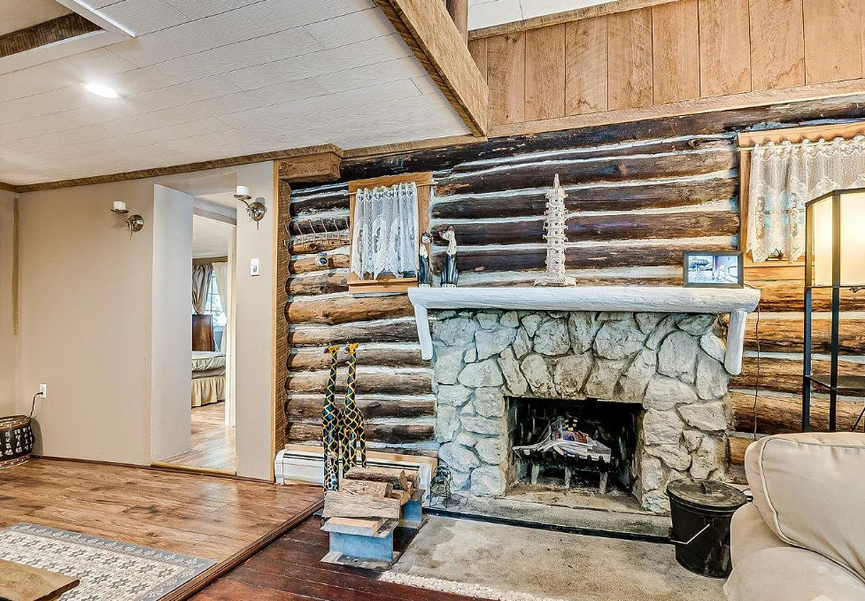 Unique lakefront house in New Jersey. The house was built in 1935. It is located in West Milford, New Jersey. The house features a private setting, stone exterior, a covered front porch, wood floors, some exposed log walls, vaulted ceiling, loft area and a stone fireplace. There is a pretty sunroom and a large back deck with views of the lake. The home is situated on Gordon Lake. Three bedrooms, two bathrooms and 1,395 square feet. $479,900