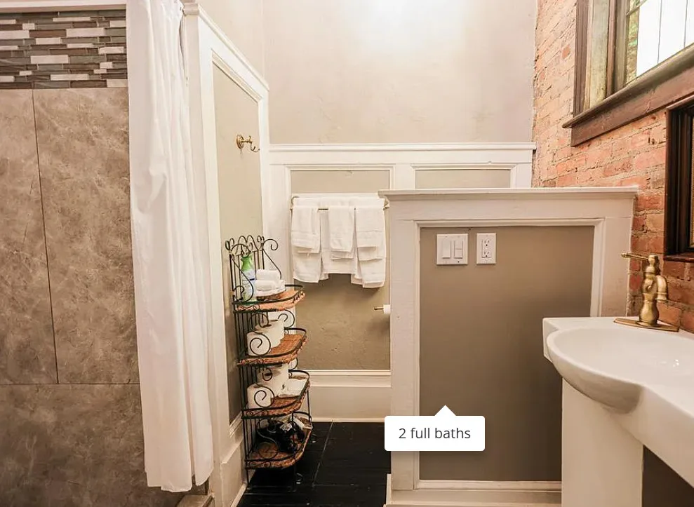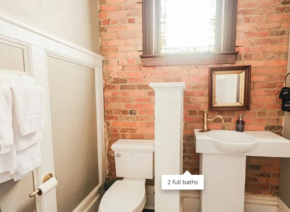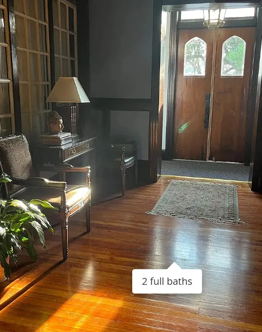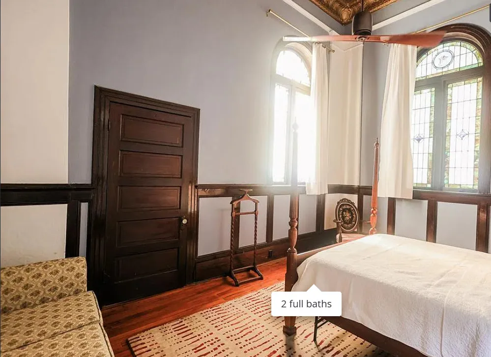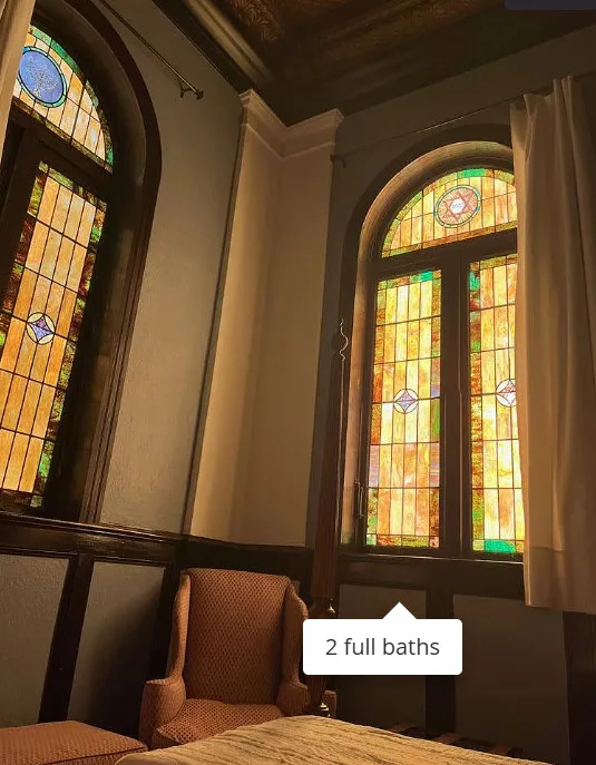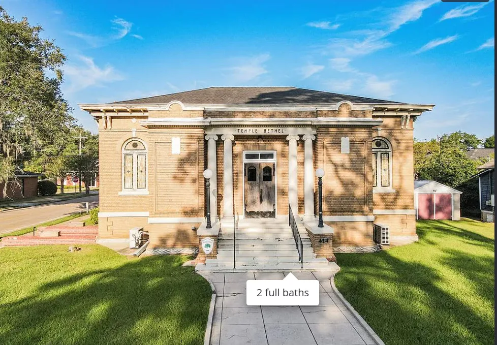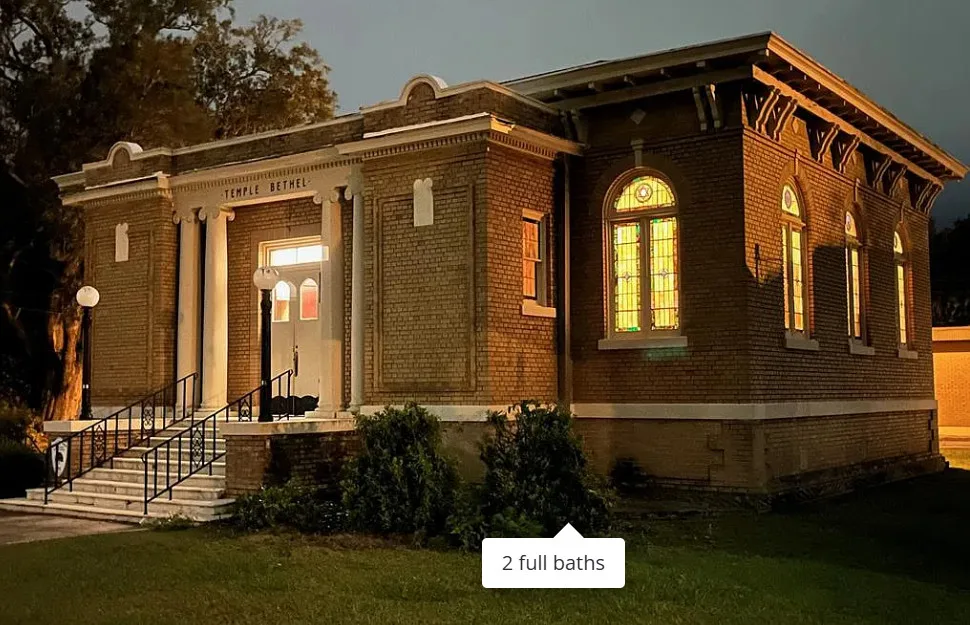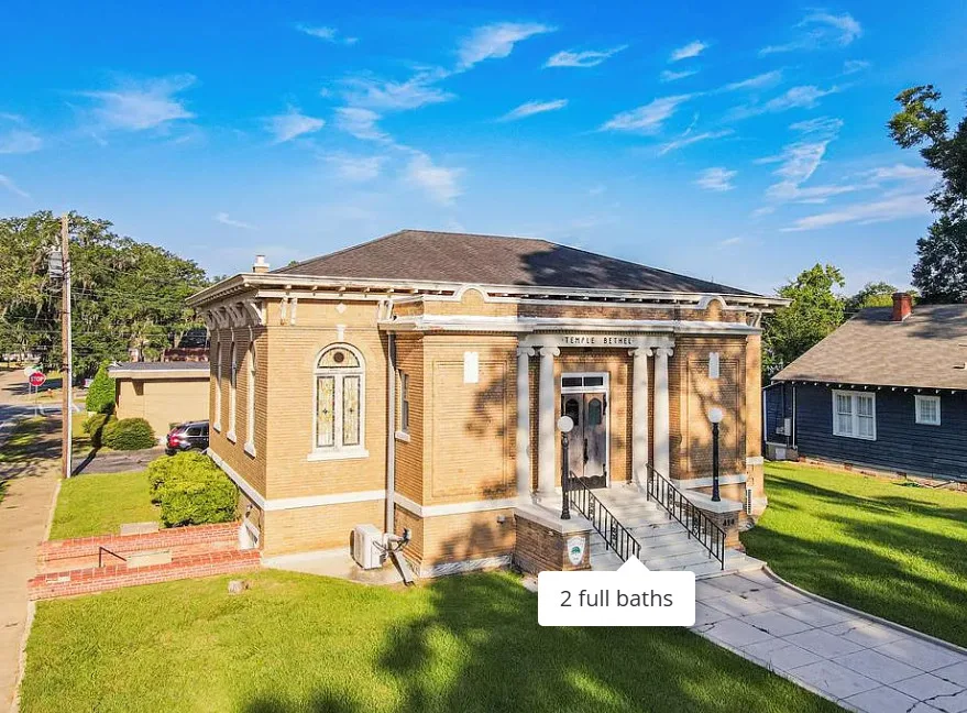 This has beautiful stained glass windows! They did a great job transforming this former temple. It was built in 1916. It is located in Bainbridge, Georgia. The house features soaring stained glass windows, wood floors, chair rails, updated bathrooms, exposed brick, wainscoting and pressed tin ceilings. Two bedrooms, two bathrooms and 2,288 square feet. $375,000