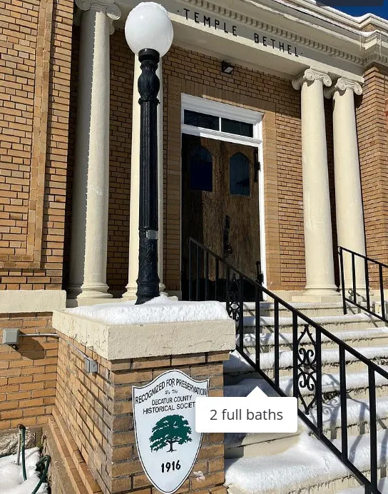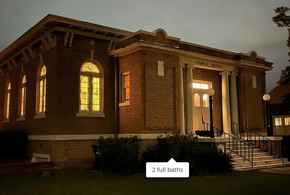 This iconic Neoclassical-Revival landmark on South Broad in Downtown Bainbridge offers history, beauty, and livability unlike any other. The former Temple Beth El offers 14′ pressed tin ceilings, custom milled mouldings, stunning stained glass windows, custom cabinets, tile showers, hard surface and locally milled pine counters, refinished wood floors, updated fixtures, and a full basement that can be used as a workshop or finished as an additional living area. Several sacramental remnants of its life as a synagogue are still in place. Just a short walk to Downtown Bainbridge’s wonderful restaurants, brewery (soon to be plural), the finest speakeasy in the Southeast, boutique shops, event venues, and the River Walk along the Flint River. We look forward to its next owner shepherding it into the future.