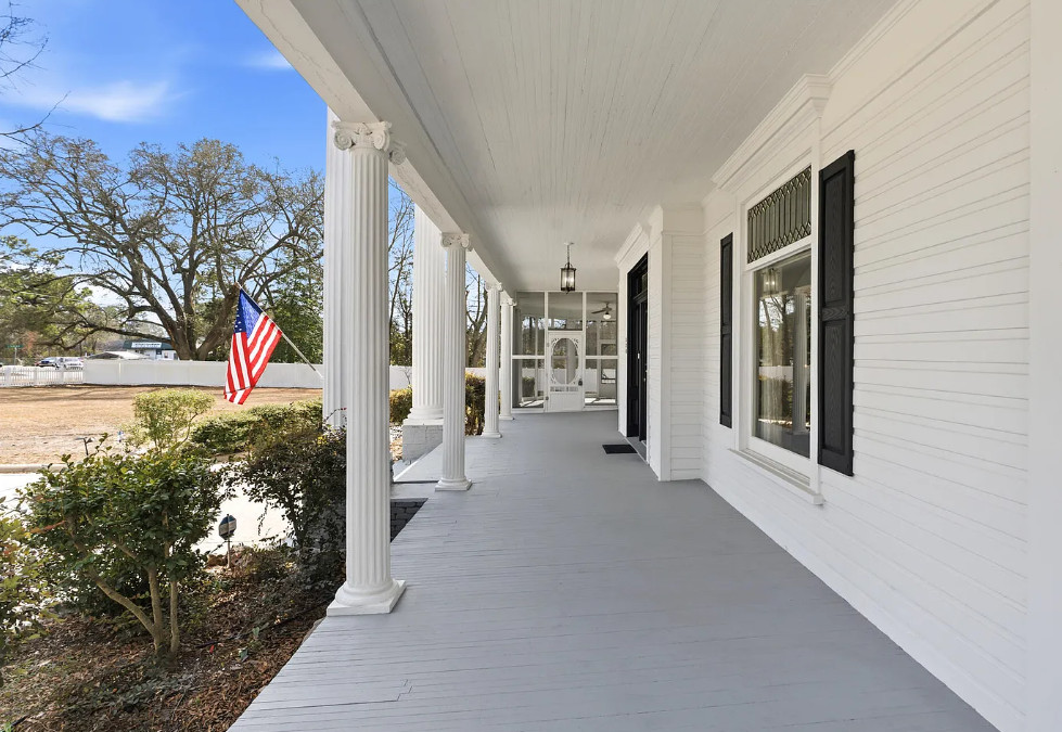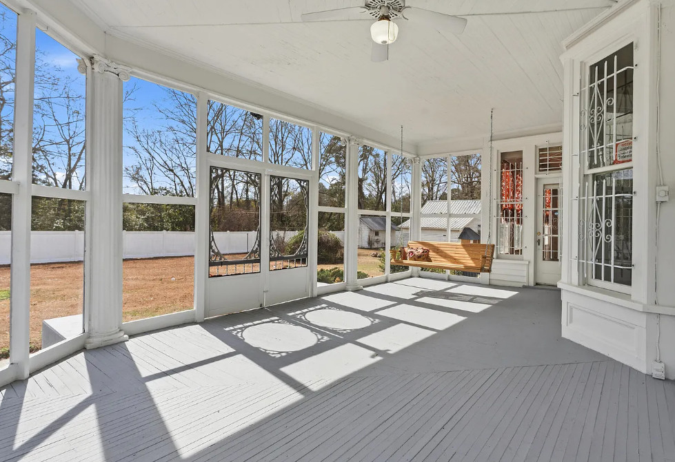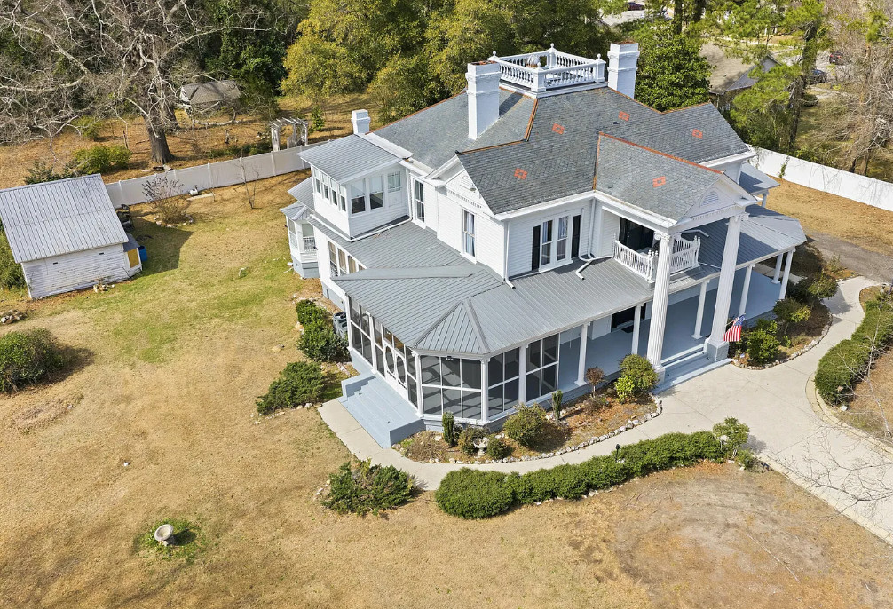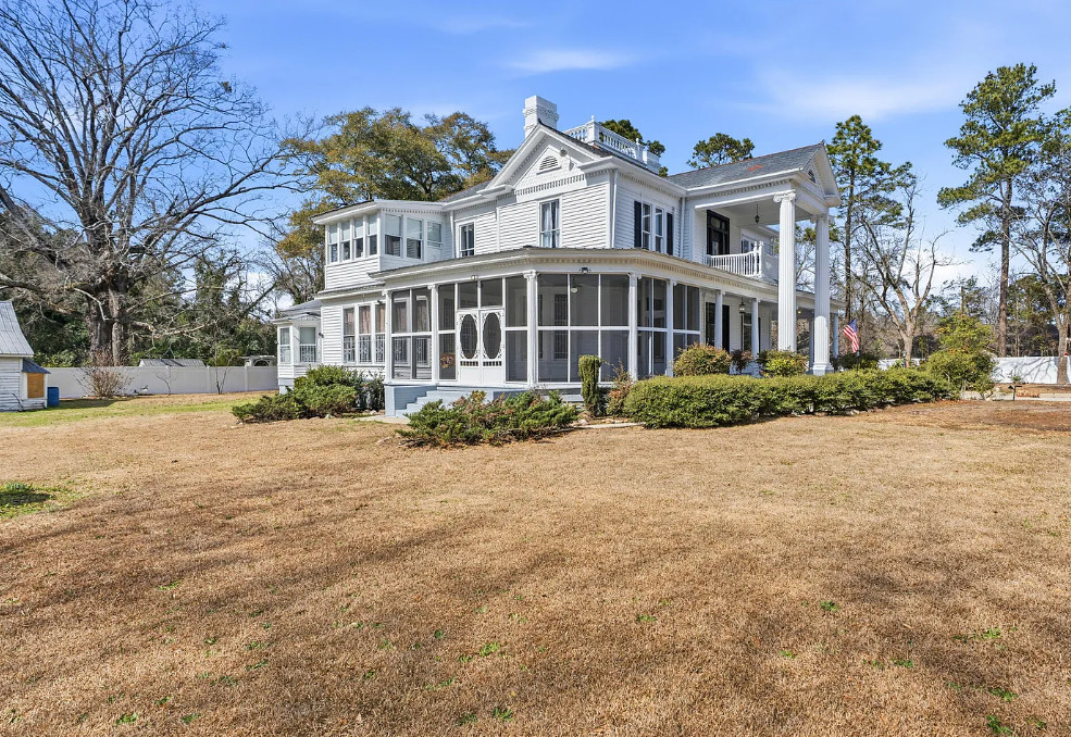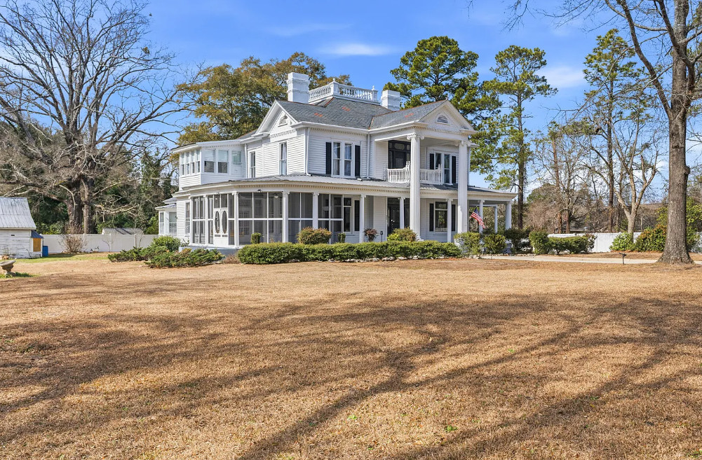 Step into history with the distinguished H.C. Watson House, originally built in the 1880s and thoughtfully restored in the early 1900s. This registered historic masterpiece blends timeless Southern architecture with preserved craftsmanship and modern updates. The stately two-story façade features towering columns, intricate millwork, an upper balcony, and an expansive wrap-around porch that invites you to slow down and stay awhile. Recent updates include two new HVAC systems (2024), updated downstairs plumbing, hot water heaters, re-finished wood floors, and exterior restoration with replaced wood and professional repainting to preserve its architectural integrity. Inside, a grand central foyer welcomes you with 10+ ft ceilings, ornate crown molding, plaster details, re-finished wood floors, and a dramatic staircase. Two elegant front parlors feature decorative fireplaces, tall windows, and refined trim. The formal dining room offers statement lighting and stunning charm, flowing into a bright sunroom ideal for relaxing or entertaining. The showpiece butler’s pantry showcases original glass-front cabinetry and a vintage brass sink. The kitchen blends historic character with functionality, featuring granite countertops, custom cabinetry, generous workspace, pot filler, and a charming breakfast nook filled with natural light. Upstairs offers four spacious bedrooms with hardwood floors and abundant light. One bedroom includes a private sunroom, perfect for a sitting area or office. Situated on a spacious lot enclosed with white vinyl privacy fencing, the property includes established fig, pecan, peach, and cherry trees. A large screened porch provides additional outdoor living space. Adding to its rare significance are the original detached cookhouse and a three-bay carriage house with groom’s quarters. A truly rare opportunity to own a property of historic character, presence and timeless Southern Elegance.