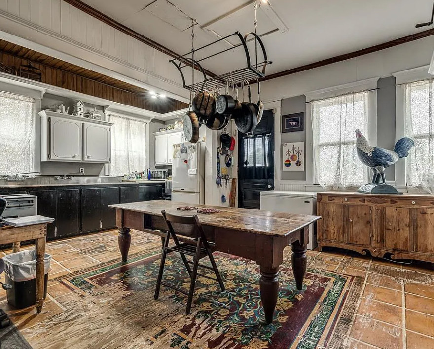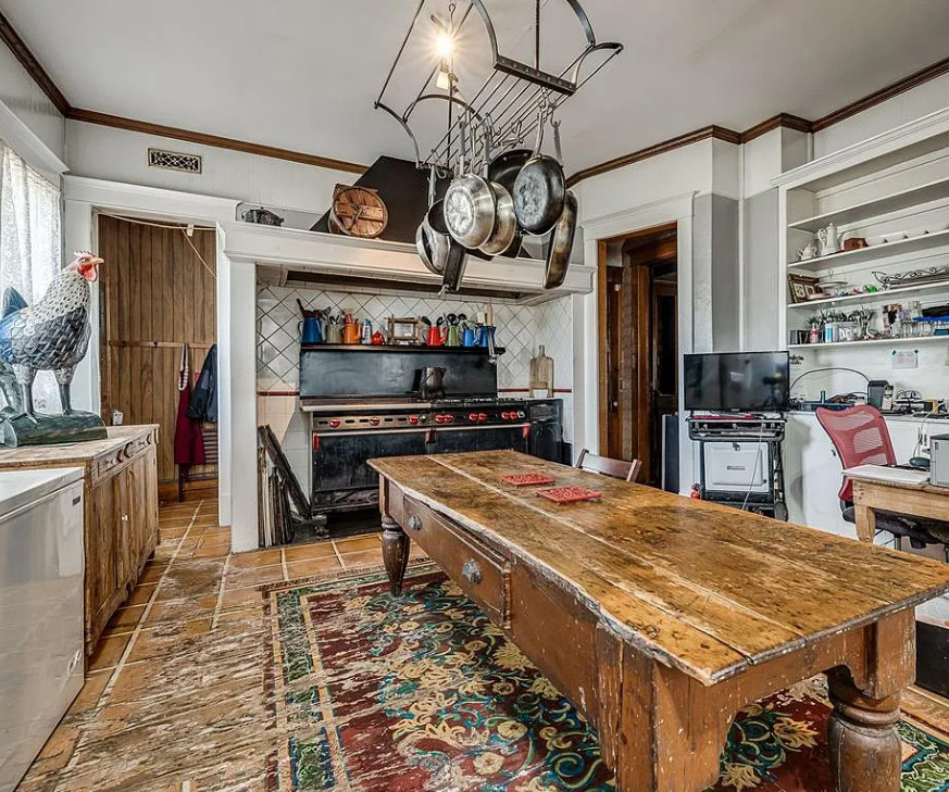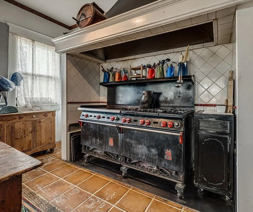 How that is one heck of a stove! Love the huge porch! The Stone Lion Inn Bed and Breakfast was built in 1900. It is located on six acres in Guthrie, Oklahoma. The house features a large wrap around front porch, upper porch, a porte cochere, grand staircase, wood floors, pocket doors, large mantels, spacious kitchen, amazing stove, bay windows, wainscoting and a claw foot tub. There is a large sunroom and a large attic. Six bedrooms, seven bathrooms and 5,347 square feet. $675,000